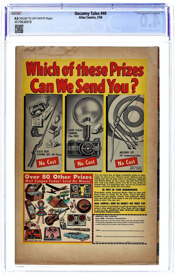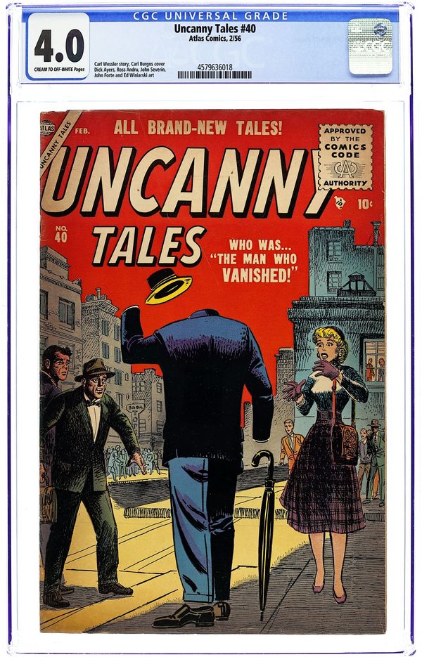 Cover by Carl Burgos. Stories by Carl Wessler and unknown. Art by Dick Ayers, Ross Andru, John Severin, John Forte, Ed Winiarski and unknown. "The Night the Sphinx Spoke!" with art by Dick Ayers - Criminal Jerry uses a microphone to make the Sphinx 'talk' and commands people bring jewels to it, where a pharaoh claims the gems. Vince is arrested with his gang who were supposed to be playing the part of the pharaoh and his guards, but they reveal they were nabbed before the performance -- the pharaoh was real. Also in this issue: "There Is No Escape" with art by Ross Andru - A robot tries to pit humans and androids against each other but the robot's creators intervene in time to stop him; "A Day to Remember" by Carl Wessler and John Severin - Rupert is almost kidnapped and brought to Mars but escapes his captors...realizing it was April Fool's Day, he decides it was all a prank...it wasn't; 2-page text story "Invasion"; "The Man Who Vanished!" with art by John Forte - After pricking himself with Keller's formula Ogden finds himself in prehistory hunting a woolly mammoth with cavemen but when the formula wears off he forgets the experience; "A Man's Best Friend" by Carl Wessler and Ed Winiarski - Jovians kidnap Bruce the dog, thinking him an Earthling...Bruce winds up thwarting Count Ryk's attempt to seize the emperor's throne, then the emperor sends Bruce home, afraid Bruce might take over the planet himself; and "Trapped in the Labyrinth!" - Holt and Wilson fashion games to test each other...Holt loses when Wilson employs Farrah to trap Holt in a maze within his own mind. 32 pages, full color. Cover price $0.10.