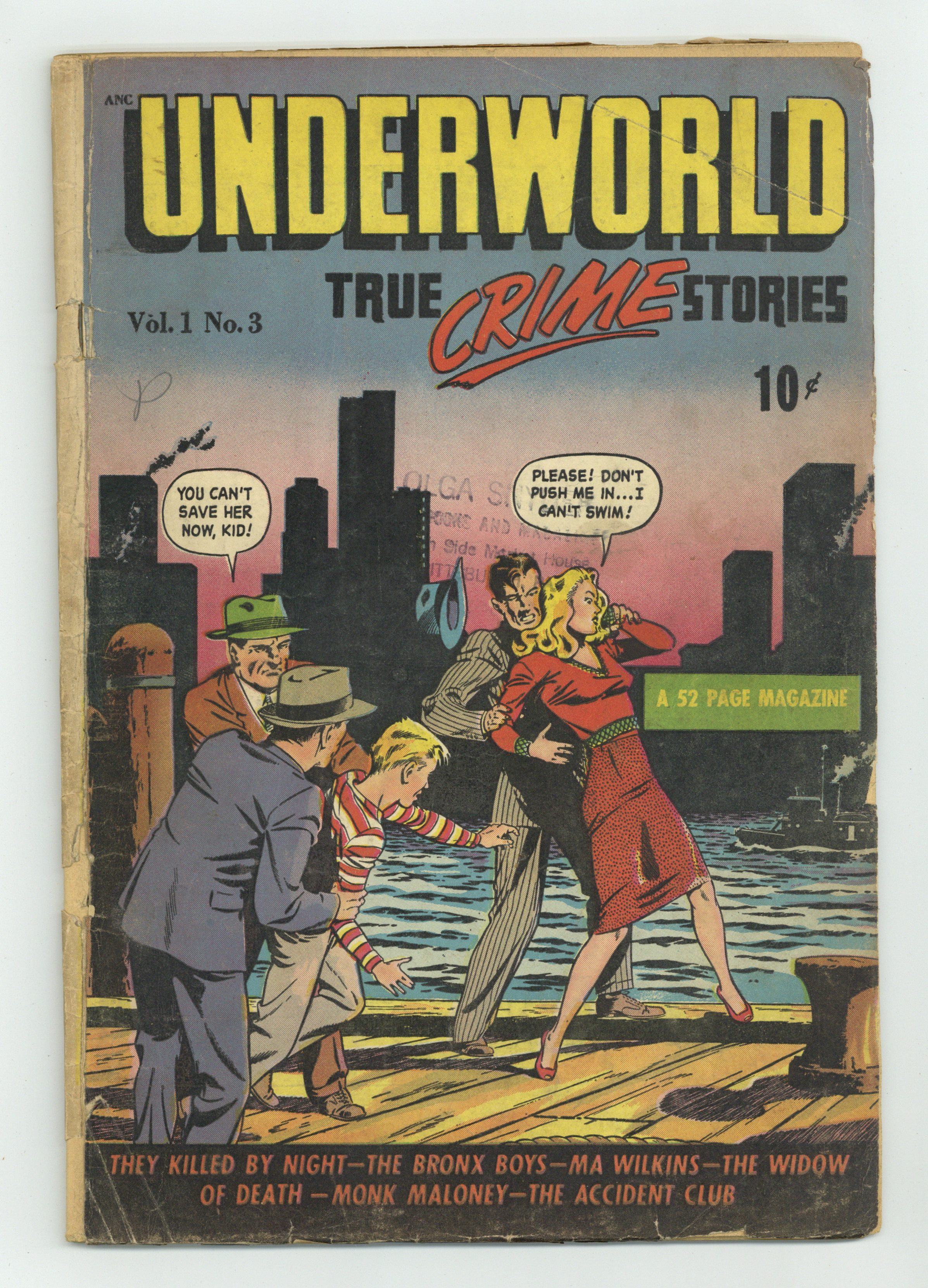 Cover by Al McWilliams. Stories and art by Ann Brewster, "Red" Holmdale, Tom Hickey and Al McWilliams. Violent pre-Code tales of crime and the law from DS Publishing. "Ma" Wilkins finds her niche in the crime world by cornering the market on fencing stolen goods. The terrifying Belle Gunness becomes one of the first American serial killers, and not even her children are safe. The teen gang known as the Bronx Boys grows up to become a criminal force to be reckoned with, until they cross the Luciano mob, in a story by early female comics artist Ann Brewster. They Killed By Night; The Bronx Boys; Ma Wilkins, Queen of the Fences; The Widow of Death; Monk Maloney, the Terror of No Mans' Land!; Gambler's Showdown; The Accident Club. 48 pages, Full Color. Cover price $0.10.