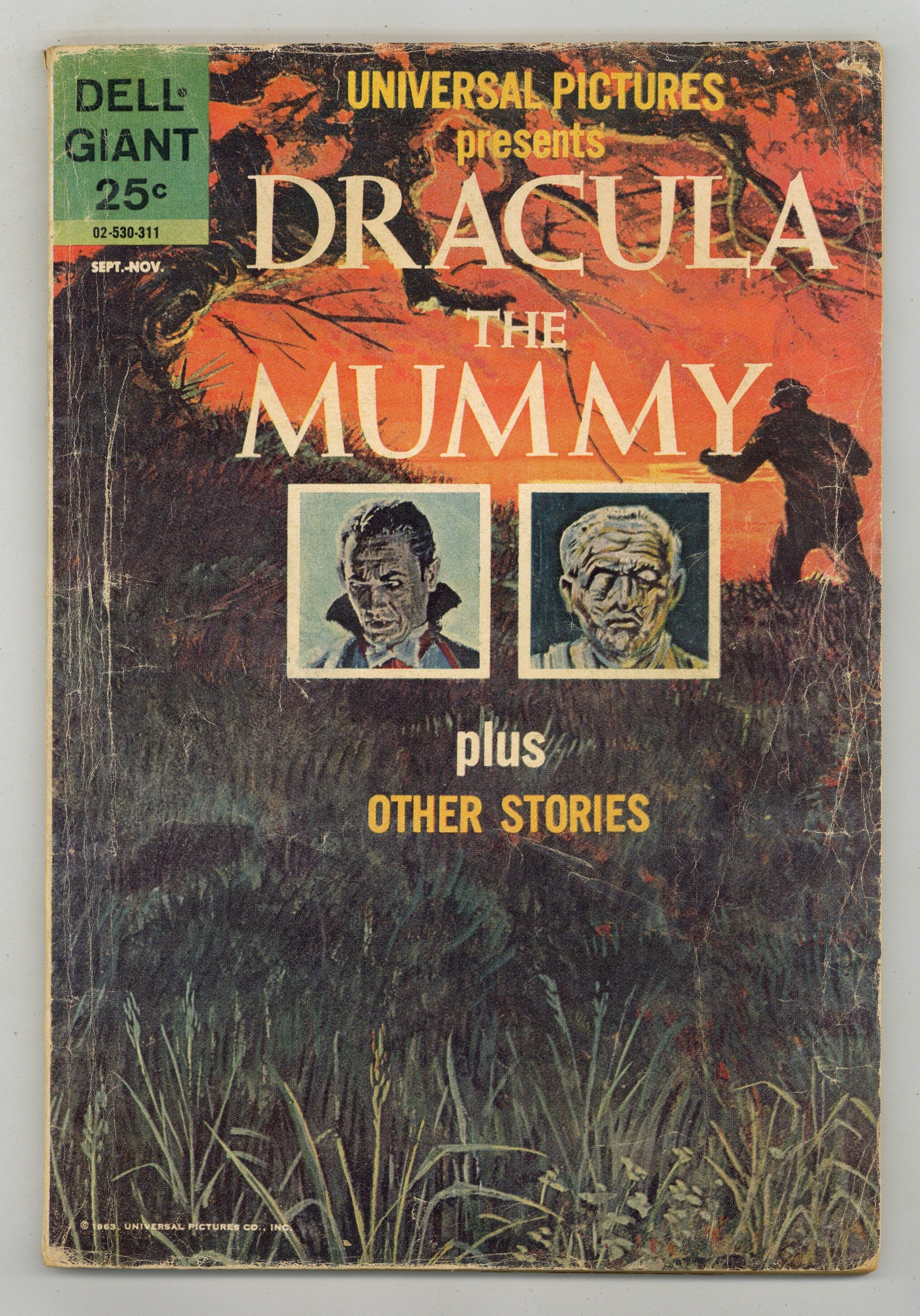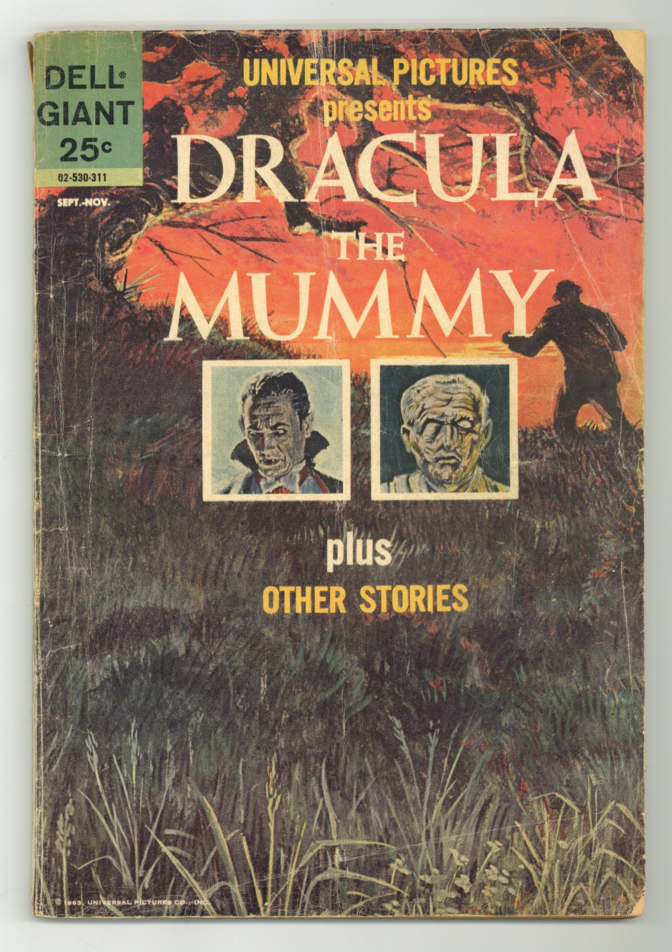 Stories and art by Max Elkan, John Stanley, Frank Springer, Jack Sparling and Gerald McCann. Tales of horror from Dell, inspired by the classic Universal Monsters Dracula and The Mummy. This one-shot collects Dracula (1962 Dell) Movie Classics, The Mummy (1962 Dell) Movie Classics, Tales from the Tomb (1962 Dell), and Ghost Stories (1962-1973 Dell) #1. Ahmed is a powerful mage in the service of the pharaoh, but his betrayal leads to his return, centuries later, as The Mummy. Caught in a storm, two boys seek shelter in an old barn and are attacked by a demonic black stallion. Sir Basil seeks the help of Professor Janos Tesla after Basil's son dies mysteriously in Transylvania. Basil wants to find the beautiful Irina, who doesn't cast reflections, but that leads the two men to the Prince of Vampires himself. Plus horror stories by John Stanley of Little Lulu fame (!). The Rusalki, Water Maidens of Doom; The Mummy; Asphalt Test; The Black Stallion; The Long Wait; The Vampires Curse. 84 pages, Full Color. Cover price $0.25.