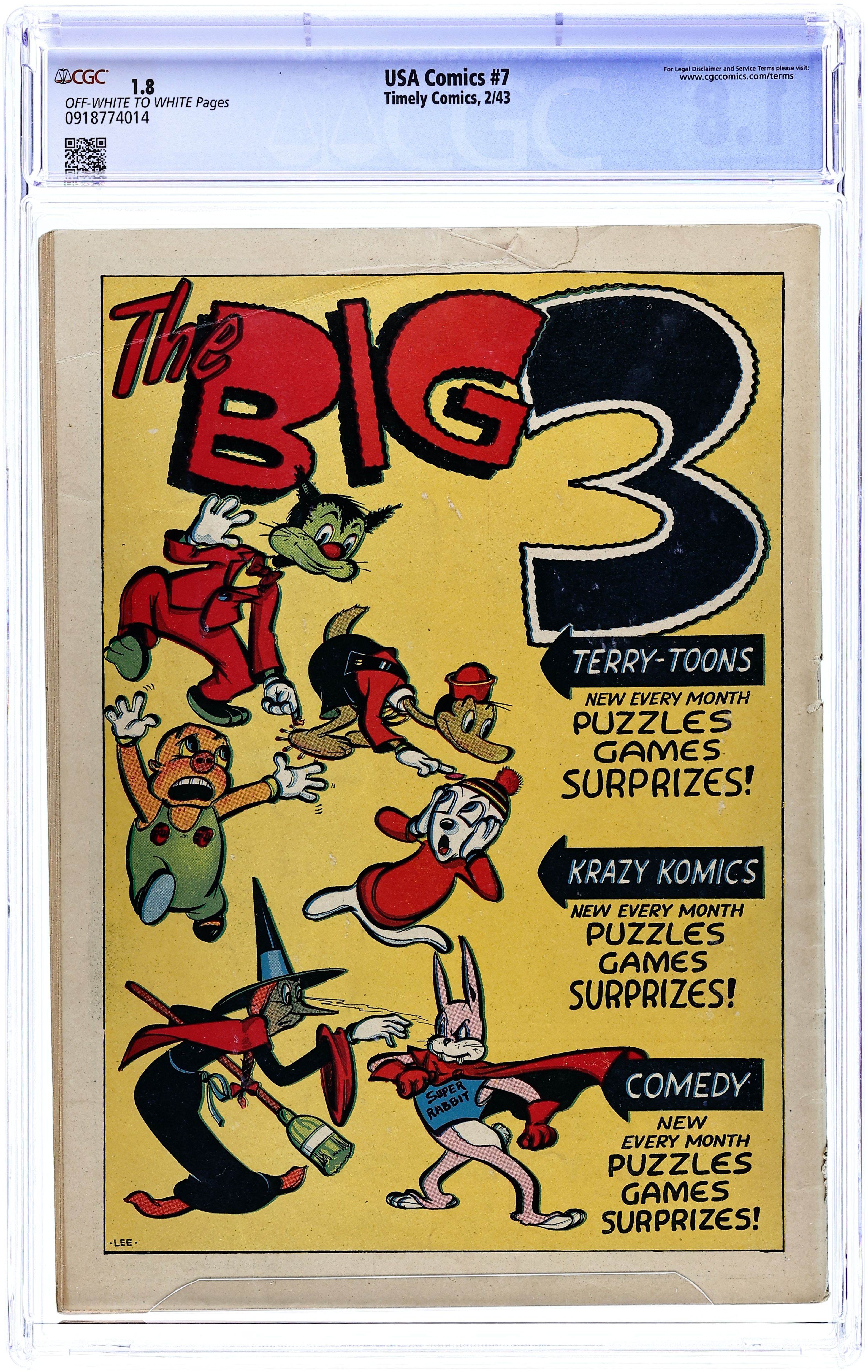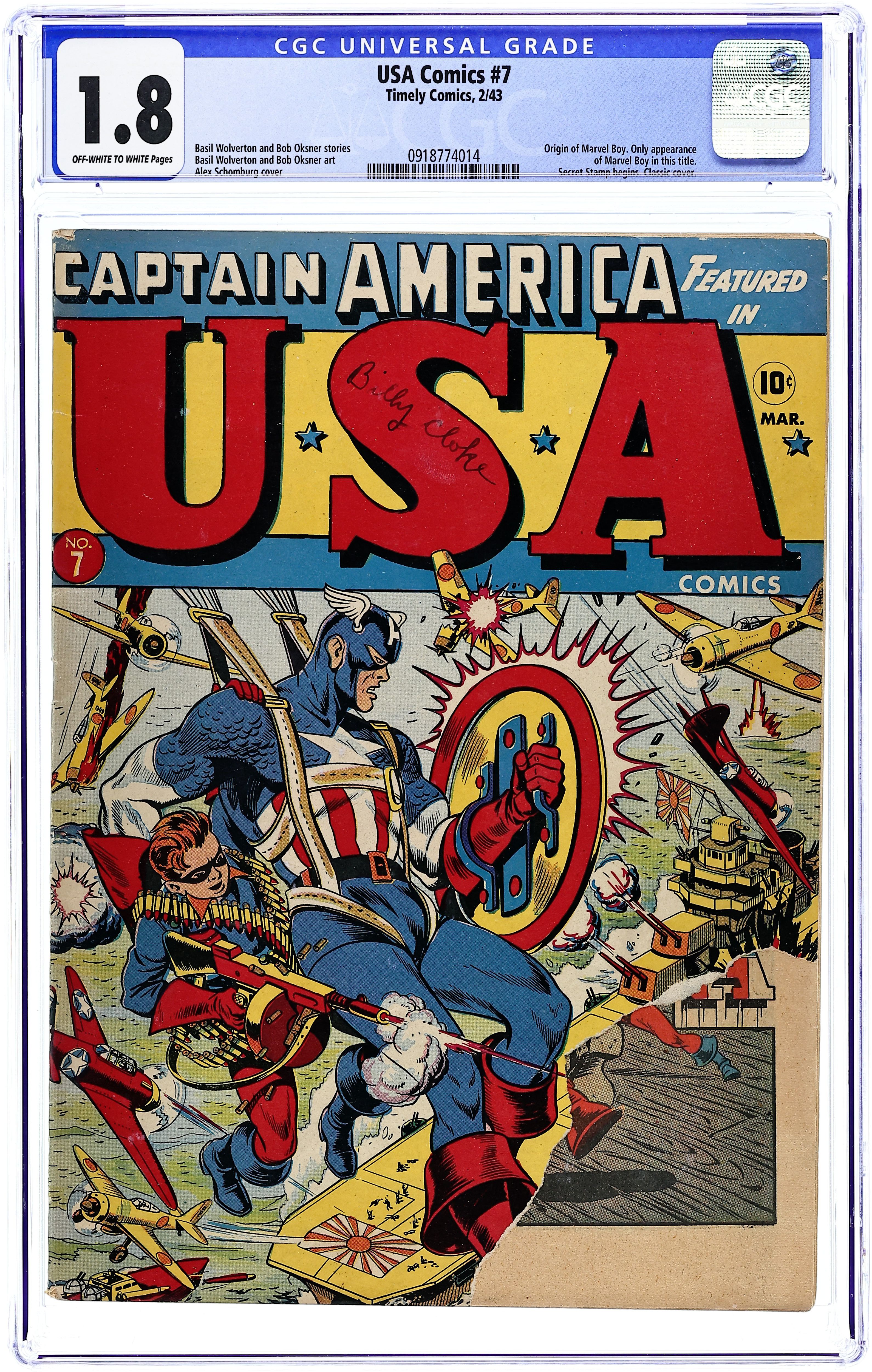 Cover art by Alex Schomburg. "The Case of the Flying Submarine!", pencils by Syd Shores, Mike Sekowsky, and Ernie Hart, inks by George Klein; Cap and Bucky must go up against the Eraser, a dreaded rubberman circus freak turned spy, who has set his sights on stealing the prototype model of a new flying submarine. "Trouble Wholesale," art by Alex Schomburg; Captain Daring vs. Marshal von Hapz and the Nazis. "Origin of Marvel Boy," pencils by Bob Oksner; Martin is visiting a museum with members of his class, when he is involved in an accident, in which Martin suffers a deep cut which is mixed with an extract of the blood of Hercules, giving him super powers. "I Hate Women" text story. "Meet Disk-Eyes the Detective," script and art by Basil Wolverton; Disk-Eyes must halt the attempts by Spider McStrangle and his boys to commit more robberies to help finance bombs that will be used to blow up machinery. "The Case of the Up-To-the-Minute Men!", pencils by Bob Oksner; Roddy has to pull off a modern Paul Revere scenario in order to track down a hijacked armored car containing more than $1 million in war bond sales. Untitled story, art by Chic Stone; Jeep draws up plans for a new invention that he calls the "Super-Duper Tank", which the General says looks like a meat grinder on wheels. "The Laughing Death Patrol!", art by Dennis Neville; Lt. Johnson must track down the source of a mysterious green gas that drives American pilots crazy. U.S. Savings Bond War Stamps public service announcement featuring Captain America, script by Martin Goodman. 68 pgs., full color. Cover price $0.10.