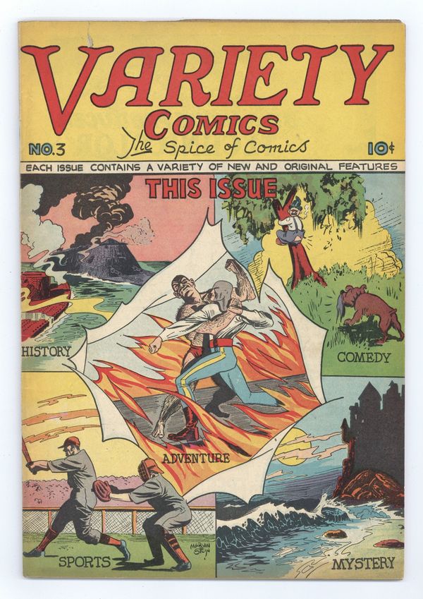 Cover by Marvin Stein. Stories and art by Leo Bachle and others. Humor and adventure comics from Rural Home Publishing. Captain Valiant battles the violin-playing crime mastermind known as The Fiddler. Female police detective Terry Temple is trapped by the gleeful pyromaniac known as the Laughing Fireman, in an early action-girl story. Caught with a flat, a couple discovers a chamber of horrors in an old house, in a story with some effectively creepy pre-Code art by Leo Bachle. Captain Valiant: The Fiddler!; Gabby Grayson, Radio Reporter; Terry Temple: Laughing Fireman!; It's True; Marty Moore; Jungo; Words and Where They Came From; Hi Hilton; Mystery Master: The Mystery of the Eccentric Collector; Variety Laffs. Final issue of the series. 48 pages, Full Color. Cover price $0.10.