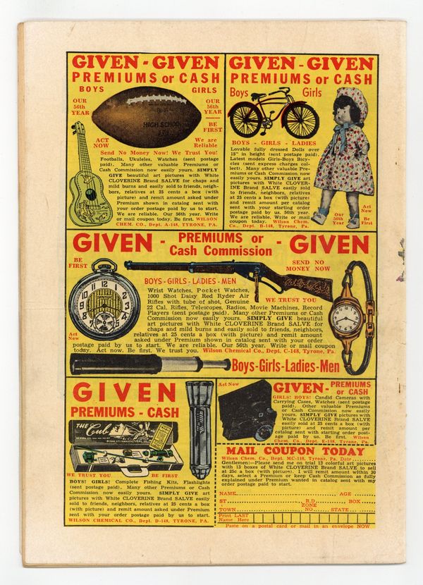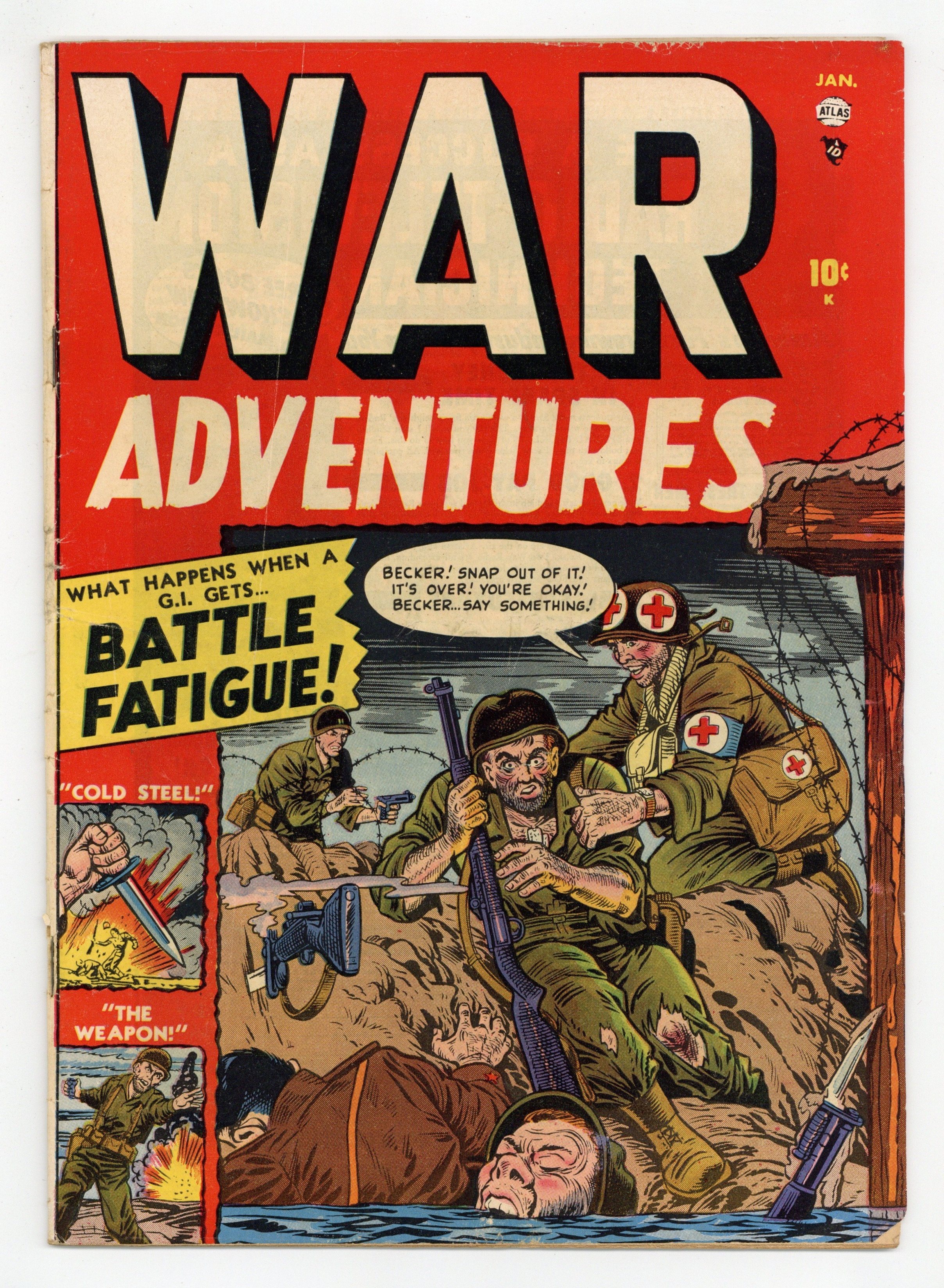 $140.00"Cold Steel" (art by Robert Q. Sale), "Battle Fatigue," "The Weapon," "News Item," and a two-page text story, "Pass the Ammunition!" Cover price $0.10.