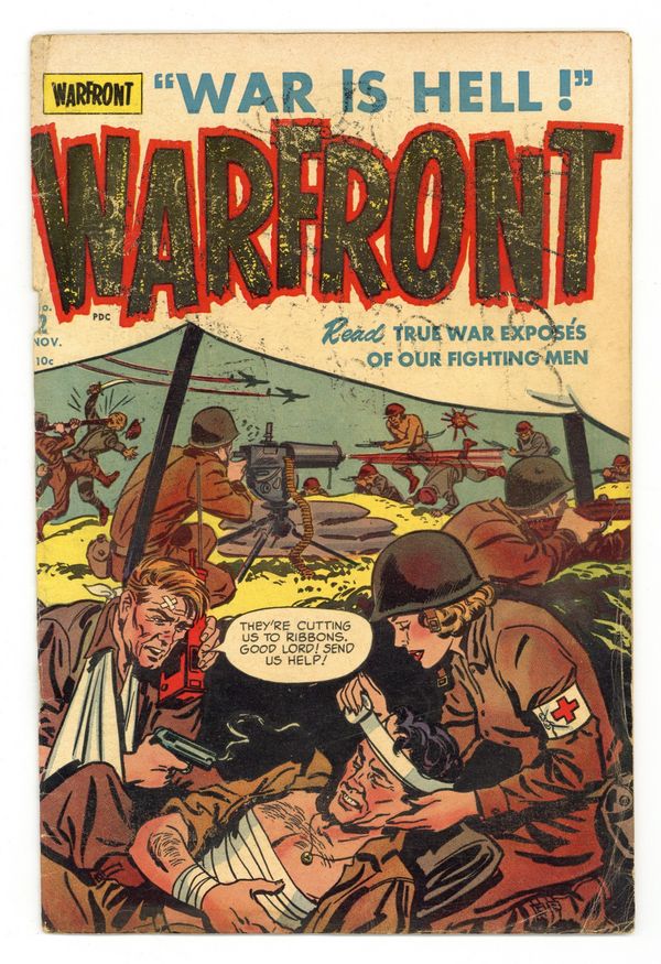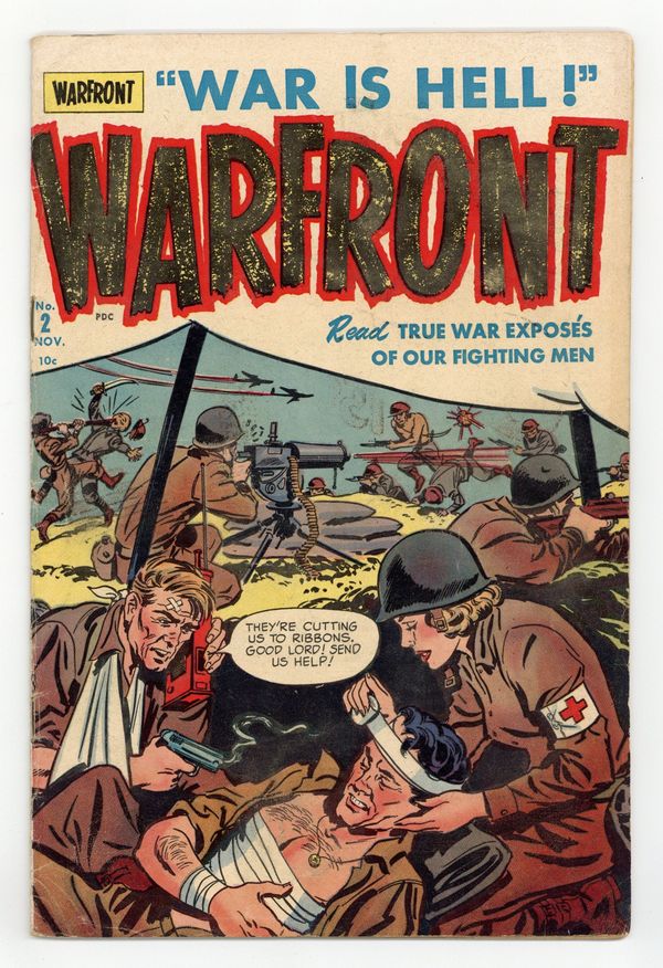 $26.50Cover art by Warren Kremer. "Medal for Mitzi," art by Bob Powell; A captured American soldier ties a note to the collar of the squad mascot and sends her for help. "Guns, Guts and Glory!", pencils by Lee Elias, inks by Warren Kremer; After a crash landing, a tail gunner continues firing to save his buddies. "Eggs" text story, art by Bob Powell. "Battlegrounds," art by Jack Sparling; Descriptions and drawings of battlegrounds of various wars. "Hotbox" text story; Short story about a ride on a B-17. Ads for Little Max and Humphrey. "Somewhere in Korea," art by Jack Sparling; A newspaper reporter rides an airplane troop transport and witnesses a battle. "Man to Man," art by Rudy Palais; A soldier learns something about himself when he fights the enemy one-on-one. "Night Invasion" text story. 36 pages, full color. Cover price $0.10.