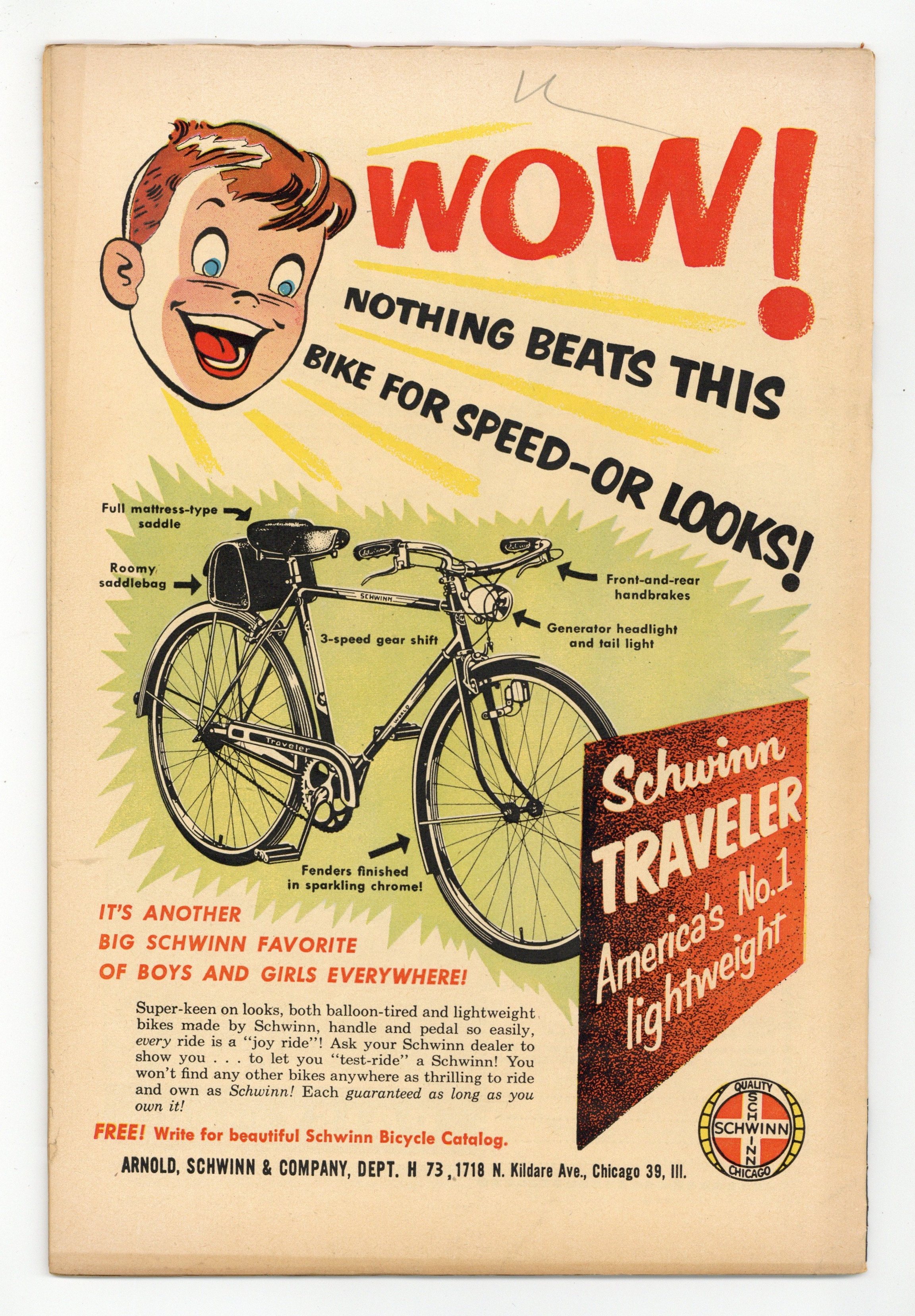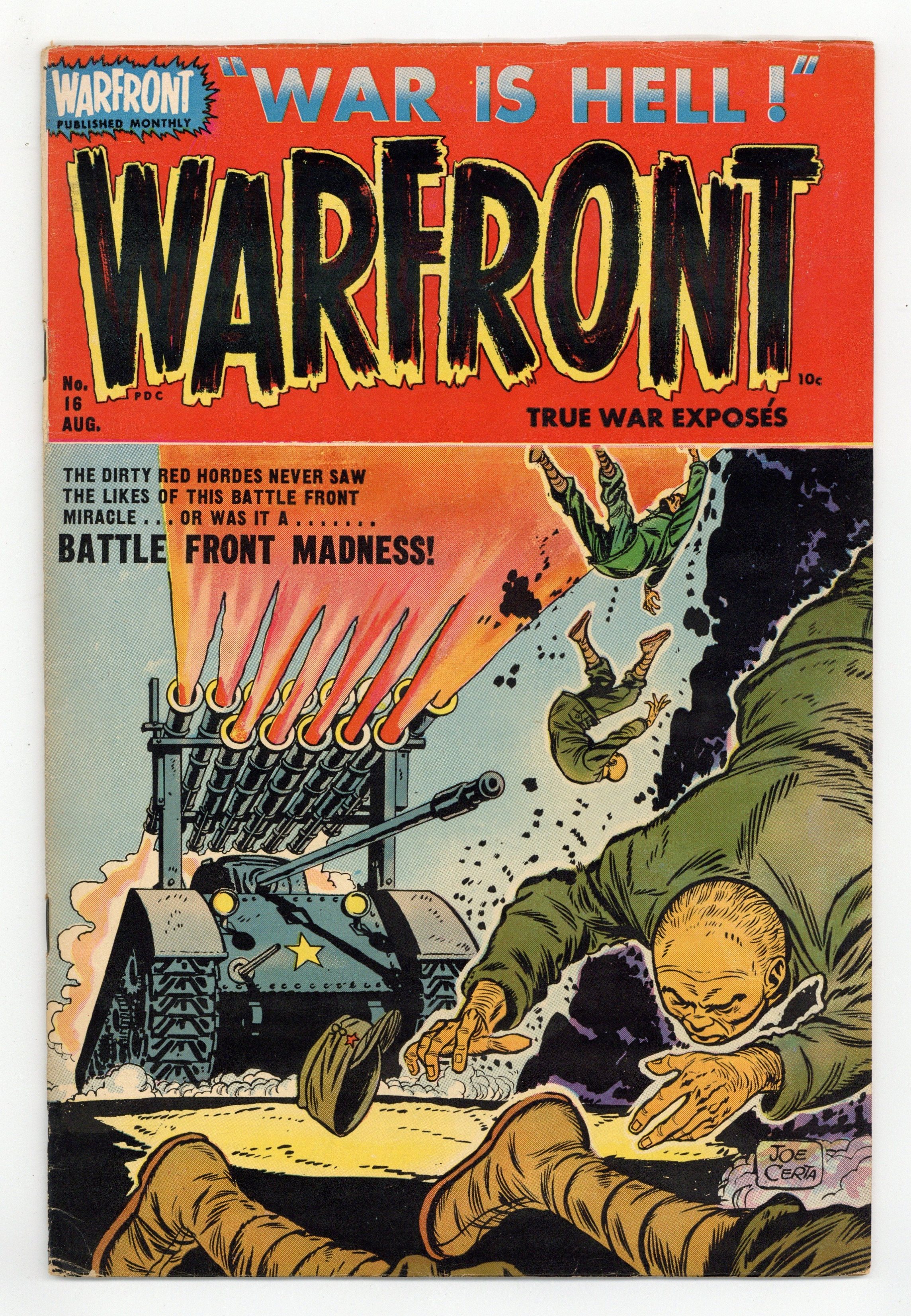 $44.00Cover art by Joe Certa. "Fog!", art by Jack Sparling; A soldier is shot in the spine and paralyzed during the attack on Red Inchon. "Expendable" text story. "Death Bait!"; South Korean War story about the 5th Marine Division. "Joe Palooka Helps His Young Friends Start a Safe Air Rifle Club!" public service announcement. "Battlefront Madness!"; Murphy borrows a trick from his brother in the Air Force by mounting rockets on a tank. "Veteran" text story. "American Heroes"; Four examples of American heroism during wartime. "Ambush"; A young Korean boy helps the American soldiers by throwing grenades. 36 pages, full color. Cover price $0.10.