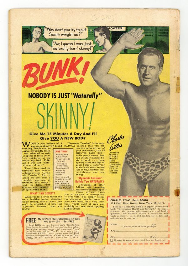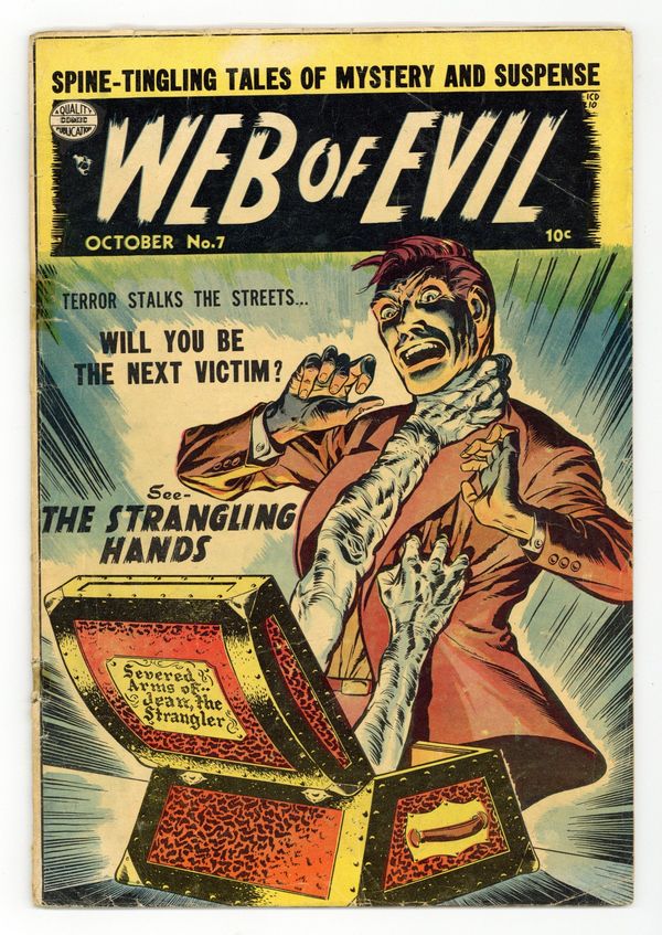 Cover pencils by Jack Cole. "The Ship of Lost Souls"; The gambling ship "Hades" capsizes and dozens of passengers are killed inside the hull. "Hideout in Hell," pencils by Bob McCarty; The Bexer gang robs a bank and goes into hiding; They quarrel over the loot and two of them shoot each other. "The Strangling Hands," pencils by Jack Cole; Collector Noram comes into possession of the severed arms of Jean DArst, the infamous French strangler. "Drums of Doom" text story. "The Man Who Cheated Death," pencils by Charles Nicholas; John Blane turns 70 years of age and is obsessed with wanting to live forever; One of the researchers in his laboratories comes up with a liquid which will grant eternal life. 36 pgs., full color. $0.10. Cover price $0.10.