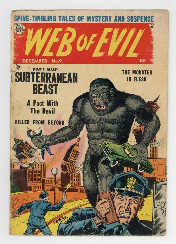 "A Pact with the Devil," pencils by Jack Cole; Suicidal John Masters enters into a pact with the devil and gets ten golden years of wealth and fortune; When his time is up, Masters tries to run. "The Subterranean Beast"; Allan Mills discovers a monstrous monkey captivated between rocks in a cave; By feeding the beast, Mills tries to command him. "Killer from Beyond," pencils by Jack Cole; Thief and killer Benny Renz is ratted out to the police by his partner, Simon Fox. Fox and his girlfriend Lili buy the Renz home and tear it down looking for the hidden loot. "Dark Sorcery" text story. "The Monster in Flesh," pencils by Charles Nicholas; Antol Meers is shunned by society for his ugliness; One day he cant take it anymore and beats up beautiful people; He gets a prison sentence and encounters a therapist who believes in change. 36 pgs., full color. $0.10. Cover price $0.10.