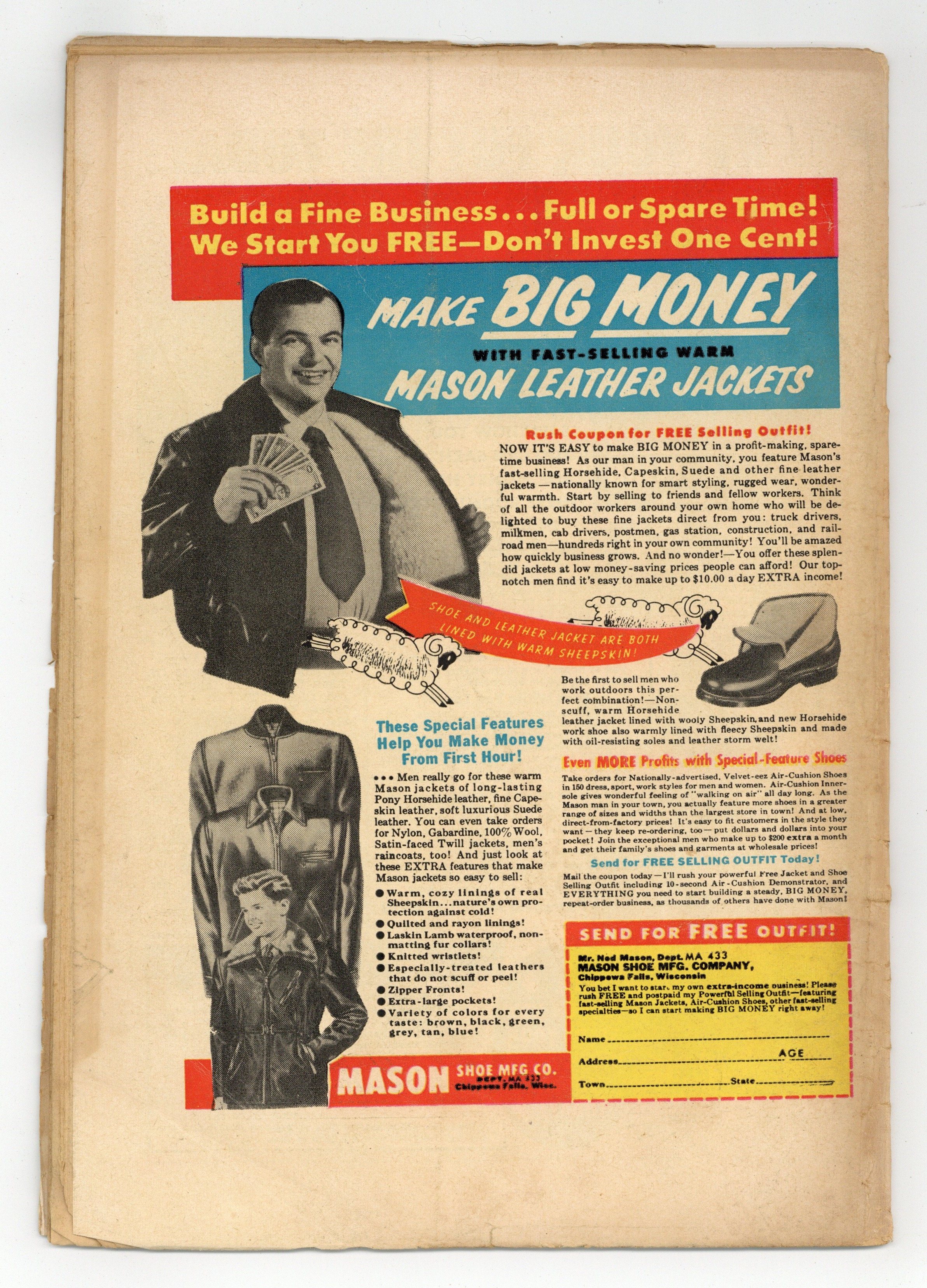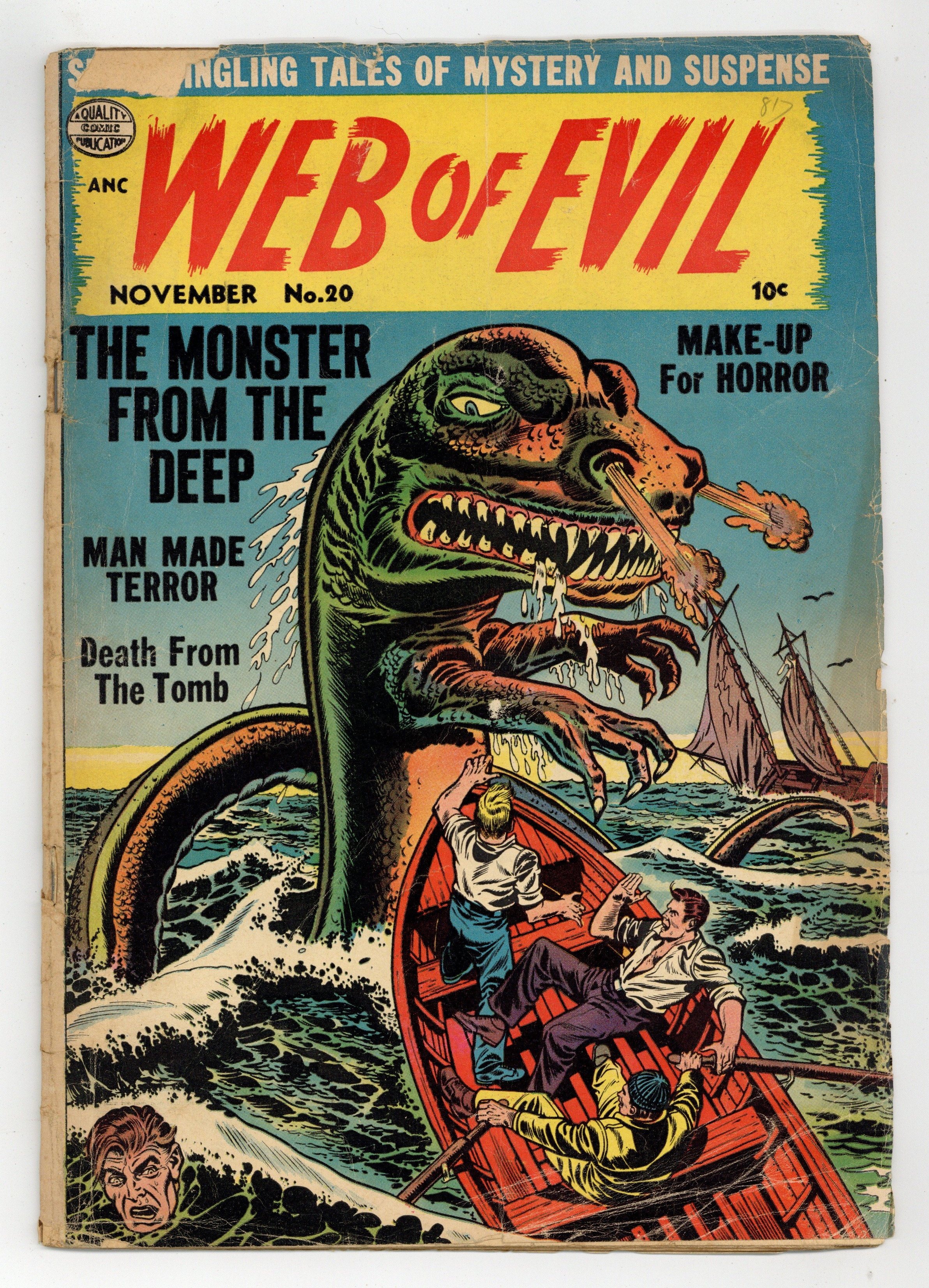 "Katumba - The Man-Made Terror"; Katumba is a legendary monster gorilla from the island of Martinique; Trent and Crane, owners of a "Hall of Oddities", travel to Martinique and build a fake Katumba there - to attract audiences at home. "Make-Up for Horror," pencils by Charles Nicholas; Ezra Fear is Hollywoods master make-up artist; His trade secret: There is no make-up; He uses a "chemical Z" to frightfully alter the appearance of actors he kidnapped, drugged and keeps caged in his cellar. "The Monster from the Deep," art by Louis Ravielli; An atom bomb test in the Pacific opens up a crack in the sea bottom and releases an ancient, dinosaur-like sea serpent. "Plan for Doom" text story. "Death from the Tomb," pencils by Charles Nicholas; Professor Dentons expedition explores the insides of an Azetec pyramid in Mexico. 36 pgs., full color. $0.10. Cover price $0.10.