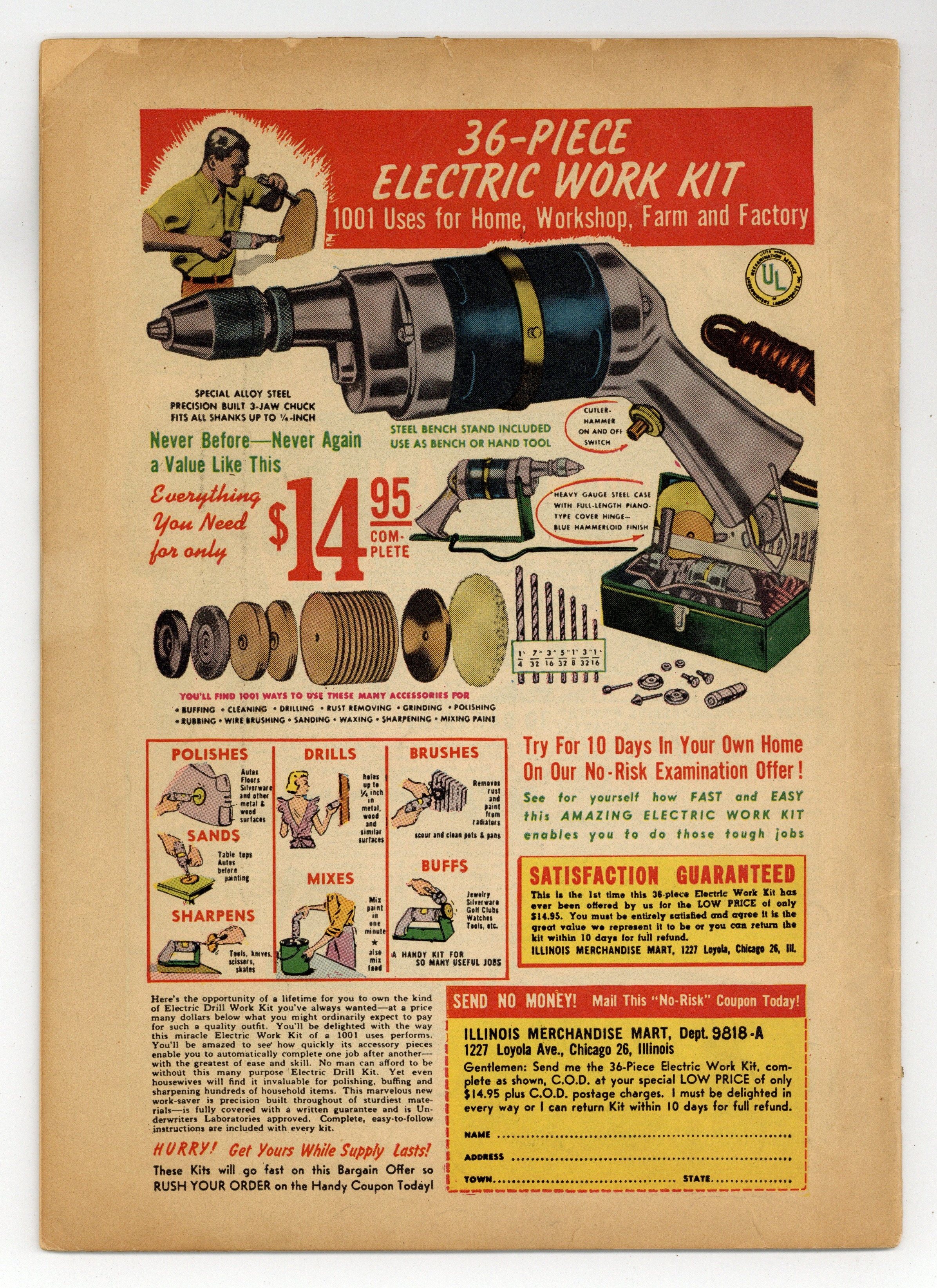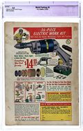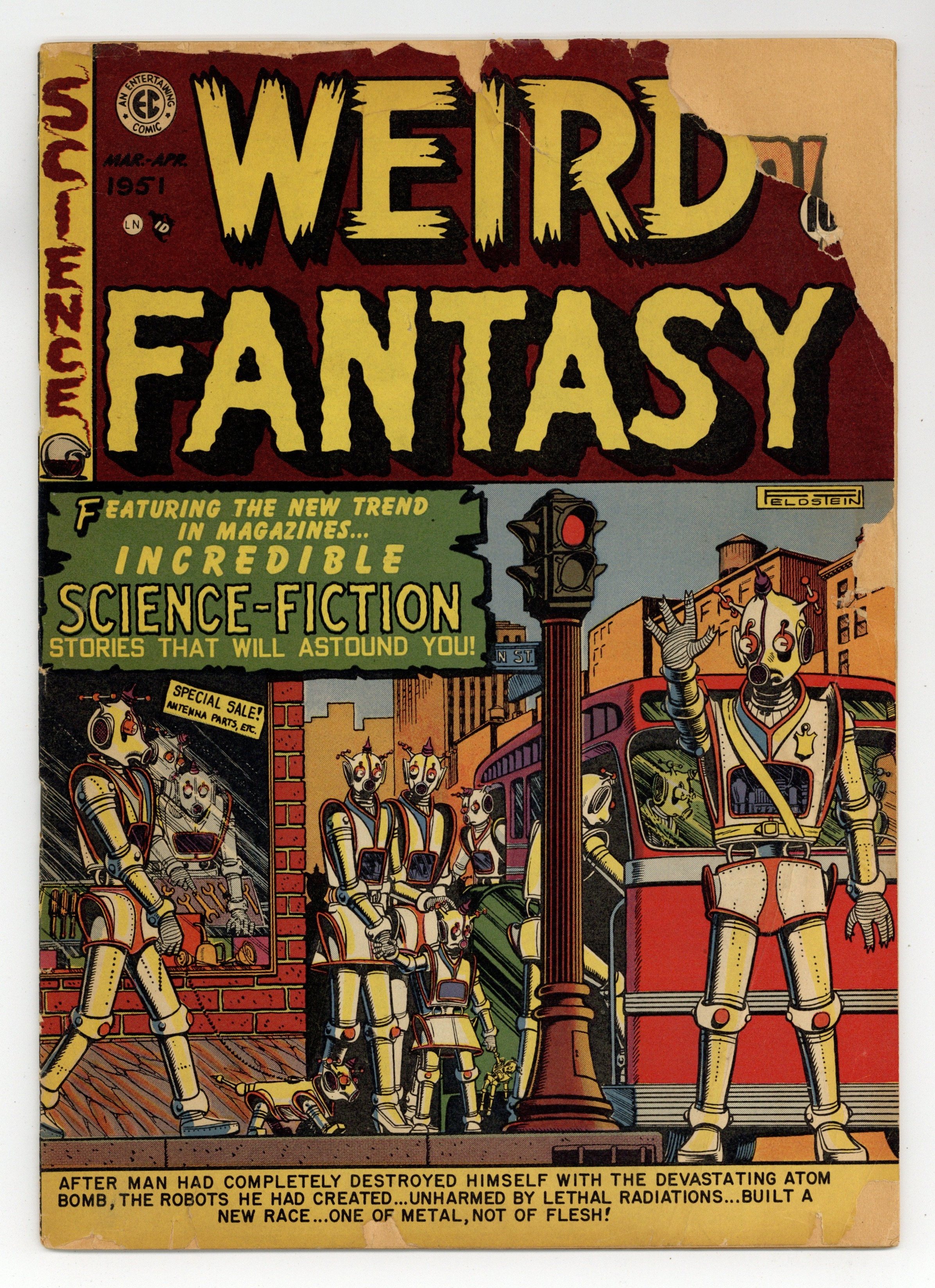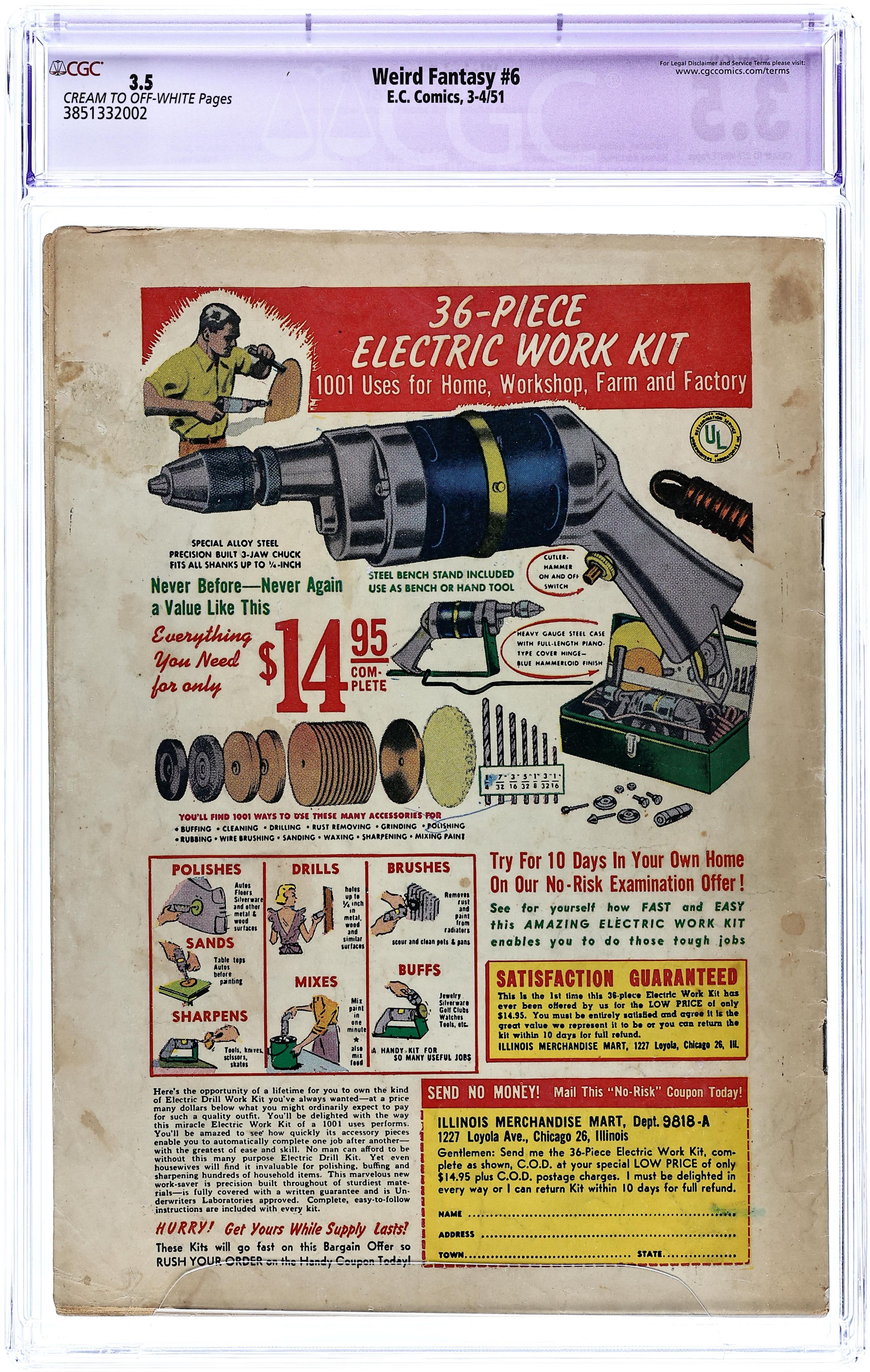Cover art by Al Feldstein. "Space-Warp," script by Bill Gaines (plot) and Al Feldstein (plot, script), art by Al Feldstein; Frank readies himself for a monumental two-year journey to Altair, using the invention of Professor Hartlow: the Space-Warp Drive, which makes use of the theory that space is curved, and, that by entering into the 4th Dimension, one can travel great distances in a relatively short period of time. "The Dimension Translator," script and art by Harvey Kurtzman; Willy has created a dimension translator, which can translate a series of photos into an electric impulse and through a series of other processes, creates an actual three dimensional object; His boss does not like his research engineer "wasting the company's time" on such things...so Willy uses a photo of his boss to create a three dimensional figure of Mr. Bankbuck so that Willy can slap him around and get even. Tales From the Crypt ad. "Experiment" text story. Picture Stories From the Bible ad. "And Then There Were Two!", script by Bill Gaines (plot) and Al Feldstein (plot, script), art by Jack Kamen; American soldiers land on an atoll, ordered to remove any native inhabitants so that the U.S. government could conduct a hydrogen bomb test there; The natives have told the government that iron gods live on the atoll and soon the soldiers discover two of these "gods" (actually robots), which tell the men of their creator, and then are taken back to America. "Rescued!", script by Wally Wood (plot) and Al Feldstein (script), art by Wally Wood; A crew had been sent into space a year earlier to examine a planet in the solar system of a neighboring star; Upon discovering it, and noting it was about the size of the Earth, they landed next to the ship of the previous expedition two years earlier; Then and there they discovered was had happened to the previous expedition and what would happen to theirs. No cover number. NOTE: See #13A-17A for the 1st five issues in the series. 36 pgs., full color. Cover price $0.10.