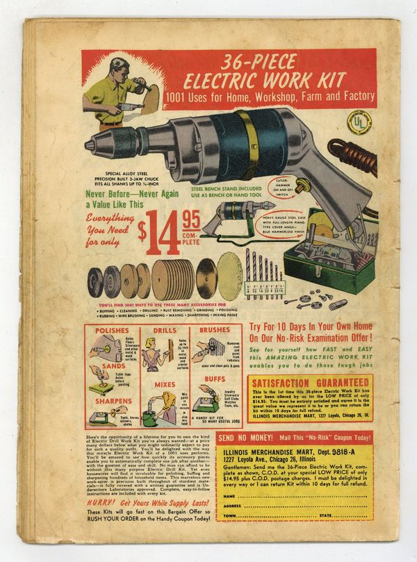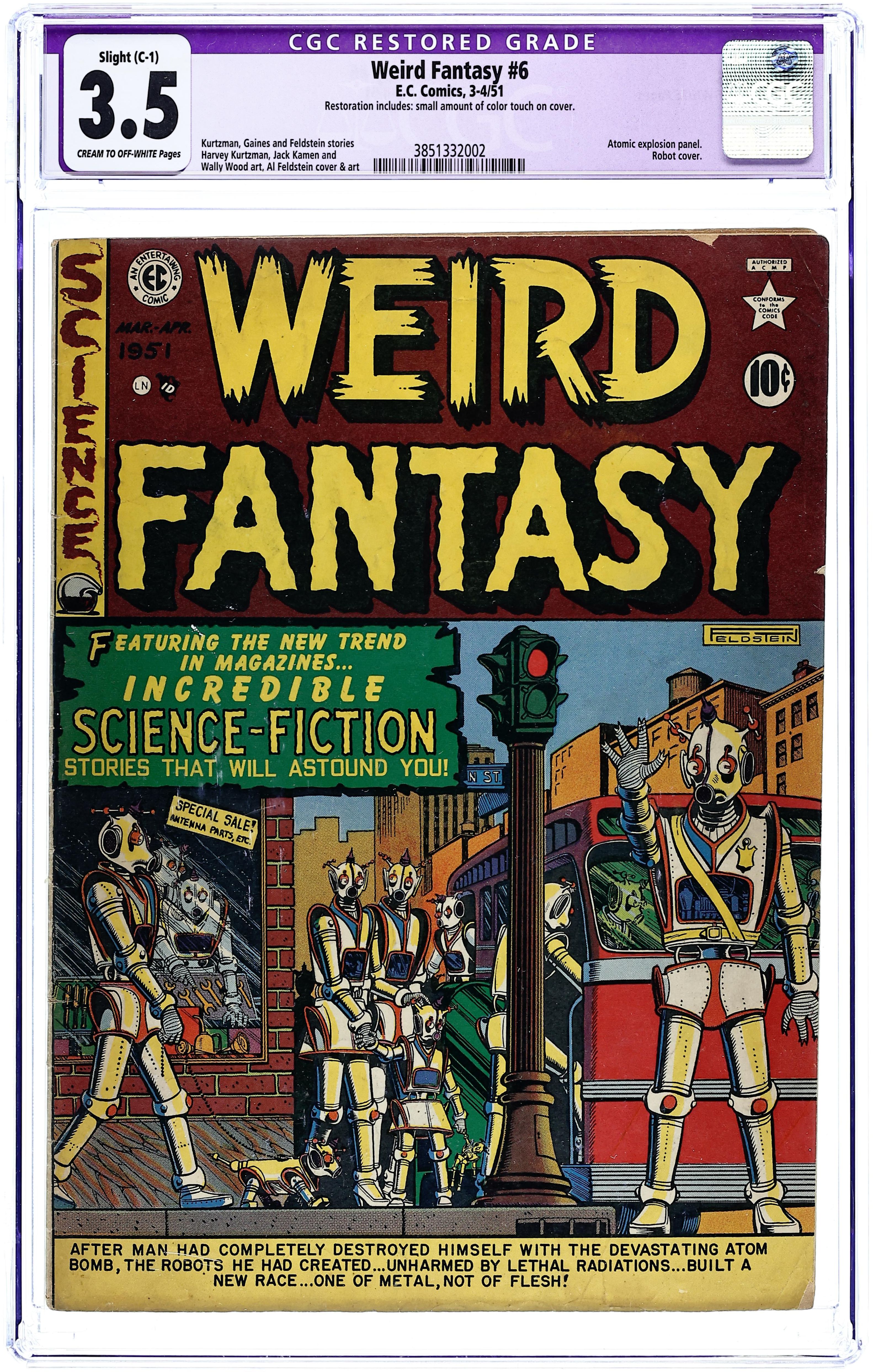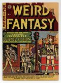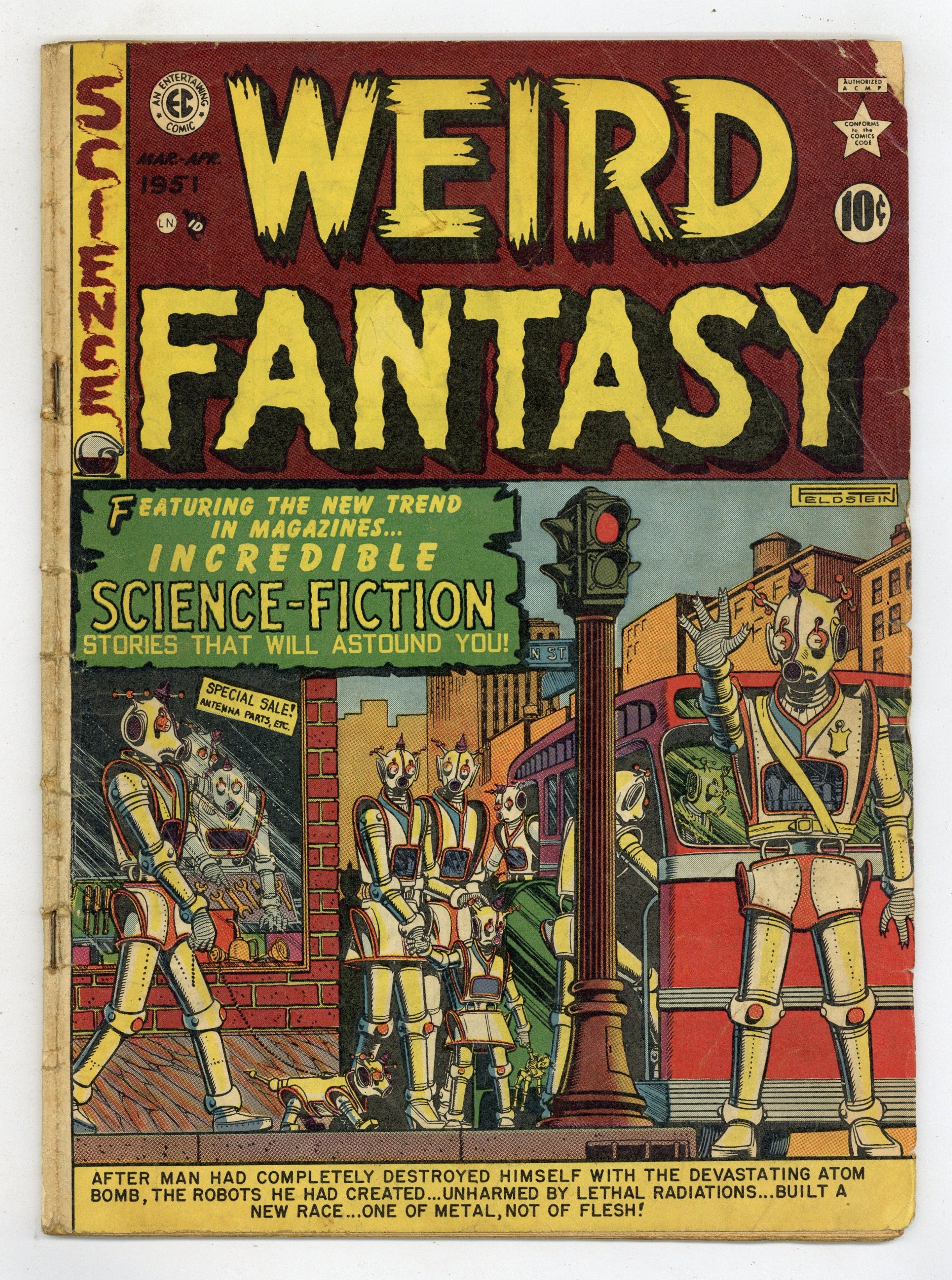 Cover art by Al Feldstein. "Space-Warp," script by Bill Gaines (plot) and Al Feldstein (plot, script), art by Al Feldstein; Frank readies himself for a monumental two-year journey to Altair, using the invention of Professor Hartlow: the Space-Warp Drive, which makes use of the theory that space is curved, and, that by entering into the 4th Dimension, one can travel great distances in a relatively short period of time. "The Dimension Translator," script and art by Harvey Kurtzman; Willy has created a dimension translator, which can translate a series of photos into an electric impulse and through a series of other processes, creates an actual three dimensional object; His boss does not like his research engineer "wasting the company's time" on such things...so Willy uses a photo of his boss to create a three dimensional figure of Mr. Bankbuck so that Willy can slap him around and get even. Tales From the Crypt ad. "Experiment" text story. Picture Stories From the Bible ad. "And Then There Were Two!", script by Bill Gaines (plot) and Al Feldstein (plot, script), art by Jack Kamen; American soldiers land on an atoll, ordered to remove any native inhabitants so that the U.S. government could conduct a hydrogen bomb test there; The natives have told the government that iron gods live on the atoll and soon the soldiers discover two of these "gods" (actually robots), which tell the men of their creator, and then are taken back to America. "Rescued!", script by Wally Wood (plot) and Al Feldstein (script), art by Wally Wood; A crew had been sent into space a year earlier to examine a planet in the solar system of a neighboring star; Upon discovering it, and noting it was about the size of the Earth, they landed next to the ship of the previous expedition two years earlier; Then and there they discovered was had happened to the previous expedition and what would happen to theirs. No cover number. NOTE: See #13A-17A for the 1st five issues in the series. 36 pgs., full color. Cover price $0.10.