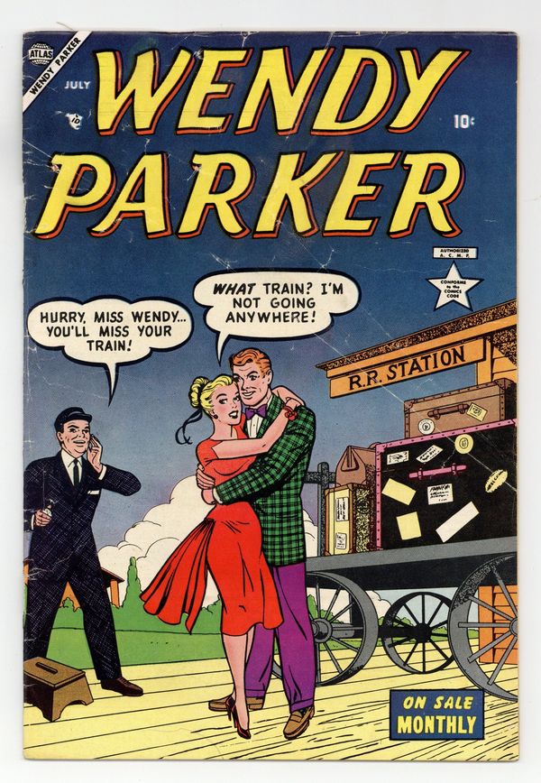 Cover by Christopher Rule. Stories by unknown. Art by Christopher Rule and Morris Weiss. Three untitled Wendy Parker stories with art by Christopher Rule: Wendy puts off studying Latin until the very end of the weekend; Laura tries to trick Timmy into buying a suit that Wendy will hate; and Wendy announces to her father that she and Timmy are getting married. Plus an untitled Patsy Walker story with art by Morris Weiss: Buzz can't take Patsy to the dance, as his father wants him to bring a client's daughter instead. And 2-page text story "Something Fishy" with illo by Morris Weiss, reprinted from Hedy of Hollywood Comics (1950 Marvel) #46 (original title: "Jinny's Big Catch"): Jinny goes fishing with her dad. 32 pages, full color. Cover price $0.10.