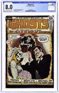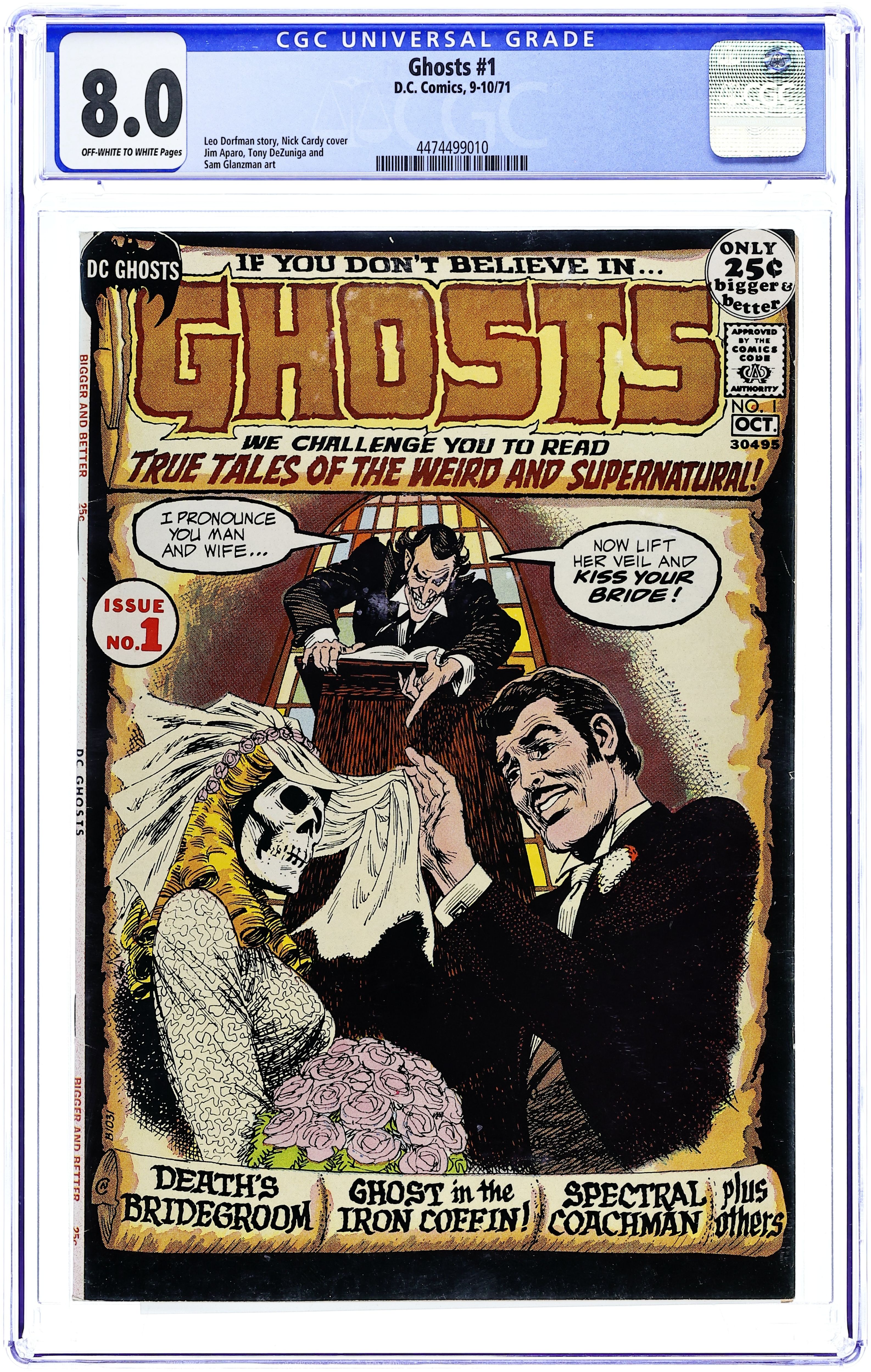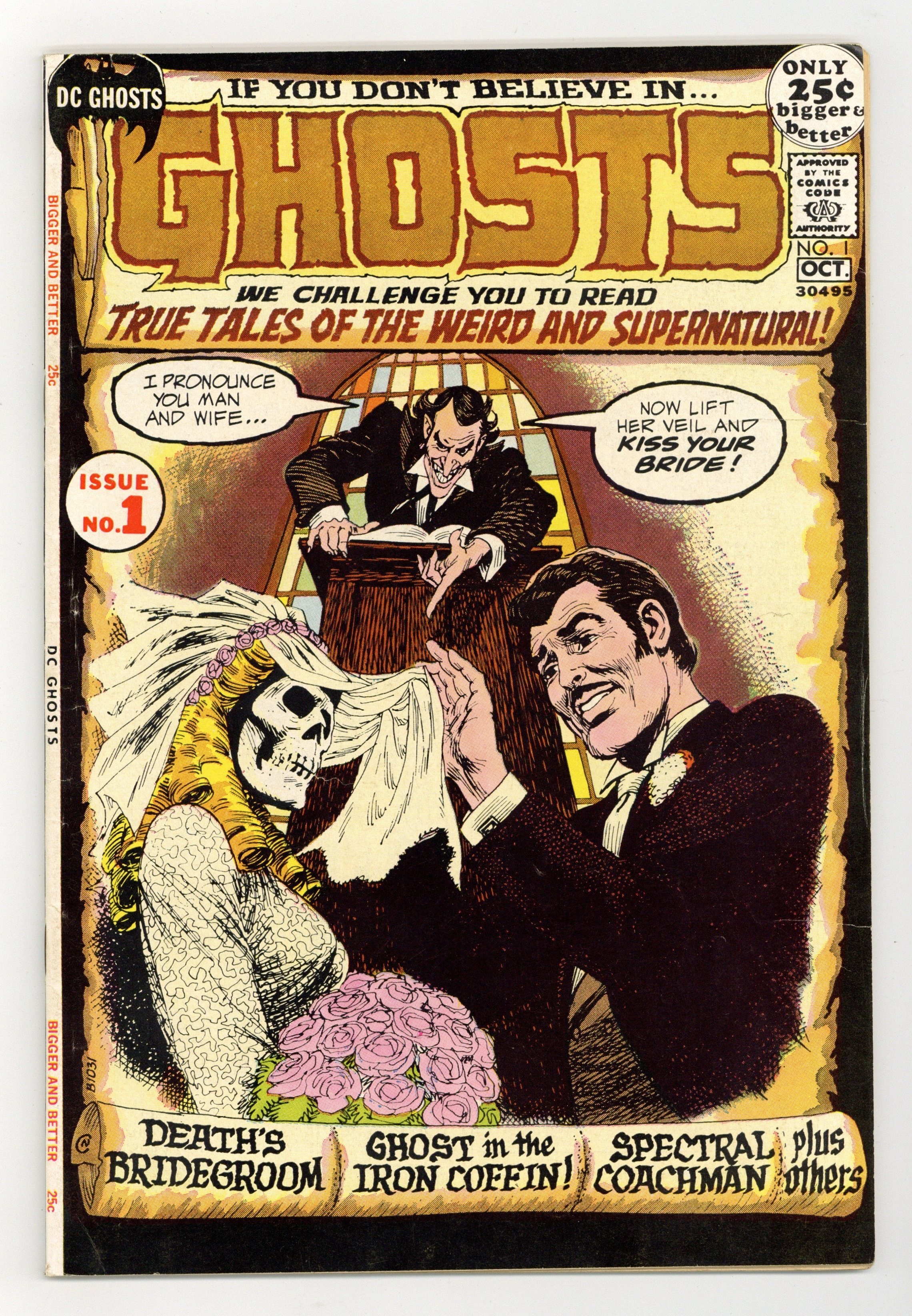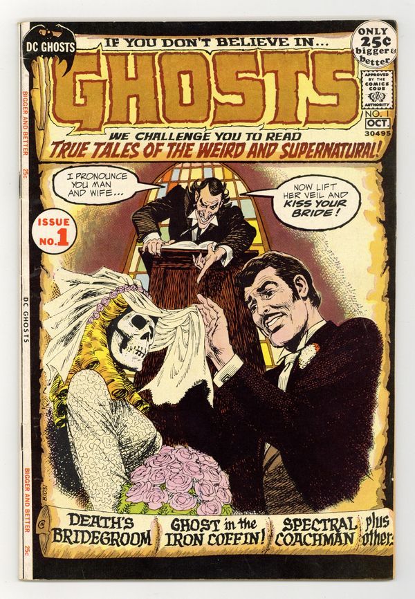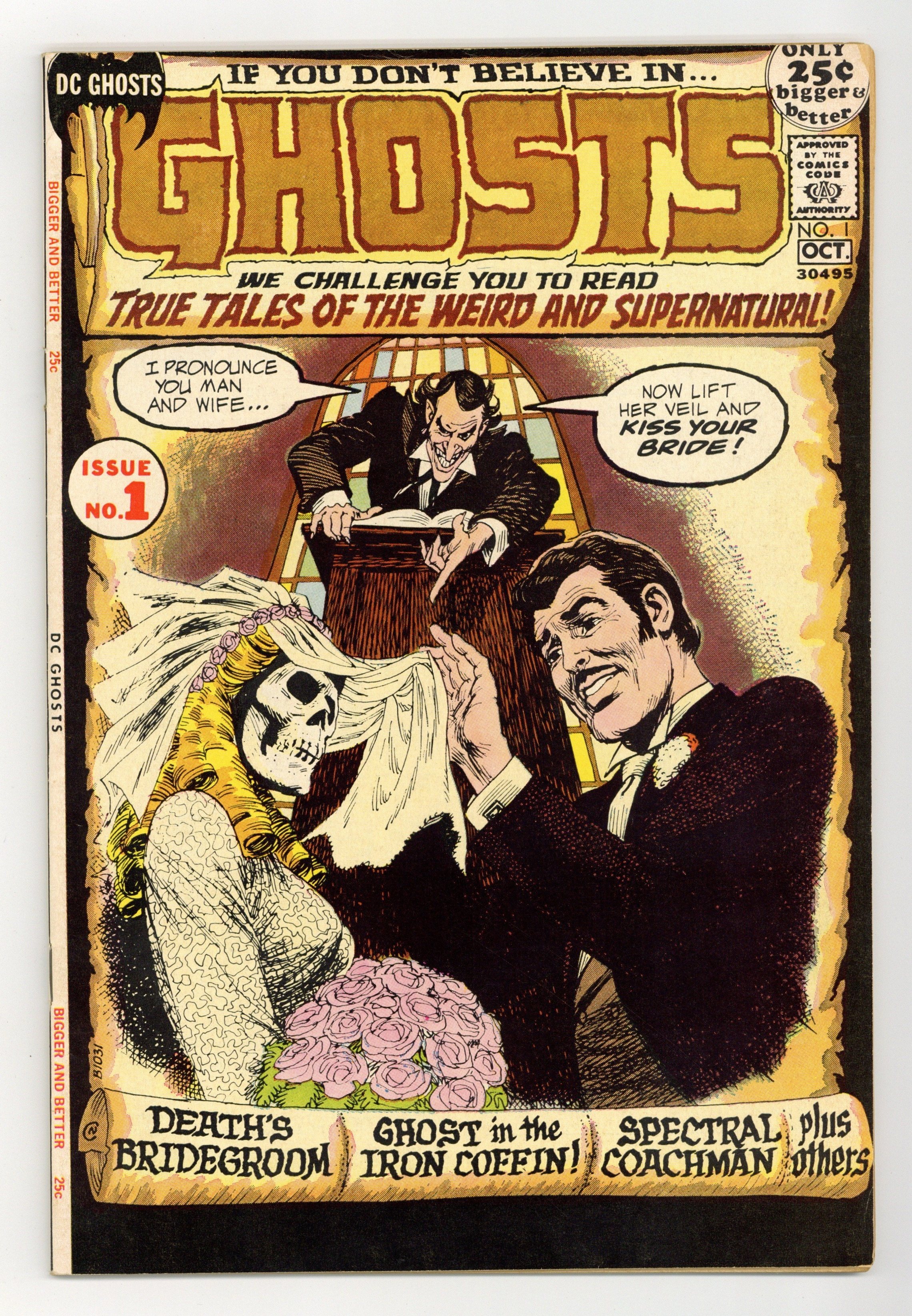 Cover art by Nick Cardy. We Challenge You to Read On!, art by Tony DeZuniga; Introduction to the concept of ghosts featuring Abraham Lincoln, Arthur Conan Doyle, and Mark Twain. Death's Bridegroom!, script by Leo Dorfman [as Geoff Brown], art by Jim Aparo; She had waited years for her betrothed, only to have a con man stage a weirdo wedding--until she pulled the last trick on him! Ghost in the Iron Coffin, script by Leo Dorfman [as David George], art by Sam Glanzman. The Tattooed Terror!, script by John Broome, pencils by Carmine Infantino, inks by Sy Barry. The Last Dream!, script by John Broome, pencils by Carmine Infantino, inks by Sy Barry. The Spectral Coachman!, script by Leo Dorfman, art by Tony DeZuniga; Tombstone, Arizona, draws its name from the town graveyard where the greatest badmen of the west are buried. 52 pgs. $0.25. Cover price $0.25.