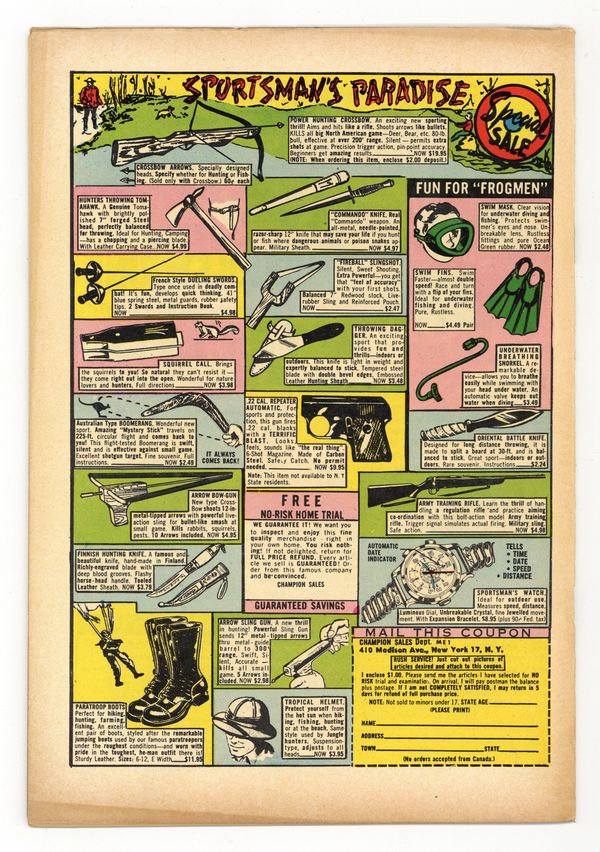 Published 1954 by Magazine Enterprises.$48.00Art by Frank Frazetta. Cover by Frank Bolle. Sometimes listed as A1 Comics (1944 Life's Romances) #104. Dan Brand, a white man adopted by the Catawba tribe, battles alongside American Revolutionary forces as White Indian. Dan and Tipi rescue an American rebel from a British prison; Dan and Tipi recover a gold shipment intended for General Washington's troops; Dan and Tipi battle an American deserter. The Battle of the Dungeons!; The Trail of the Traitor!; The Underworld of the Wilderness!; River Gauntlet! 36 pages, Full Color. Cover price $0.10.