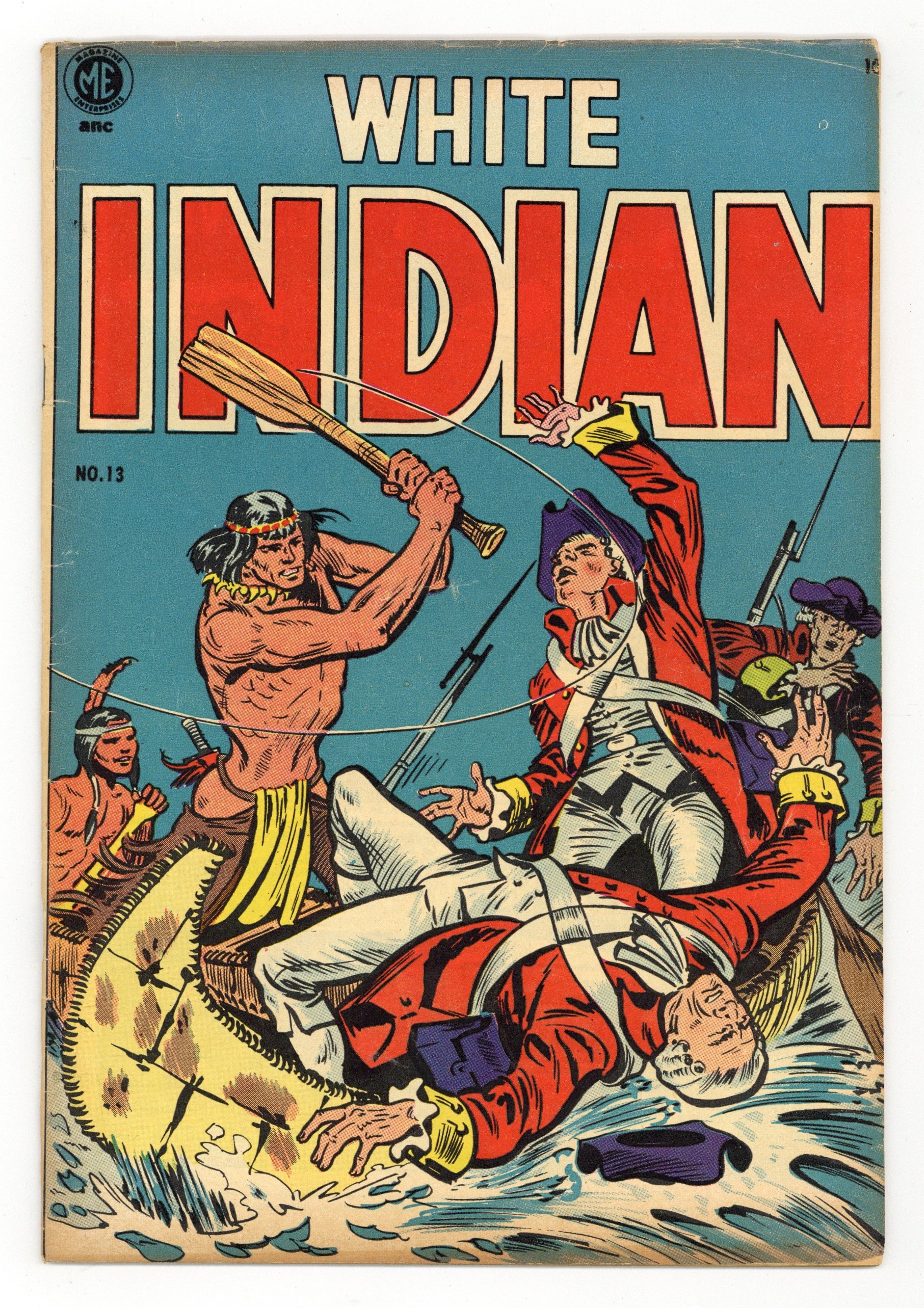 Art by Frank Frazetta. Cover by Frank Bolle. Sometimes listed as A1 Comics (1944 Life's Romances) #104. Dan Brand, a white man adopted by the Catawba tribe, battles alongside American Revolutionary forces as White Indian. Dan and Tipi rescue an American rebel from a British prison; Dan and Tipi recover a gold shipment intended for General Washington's troops; Dan and Tipi battle an American deserter. The Battle of the Dungeons!; The Trail of the Traitor!; The Underworld of the Wilderness!; River Gauntlet! 36 pages, Full Color. Cover price $0.10.