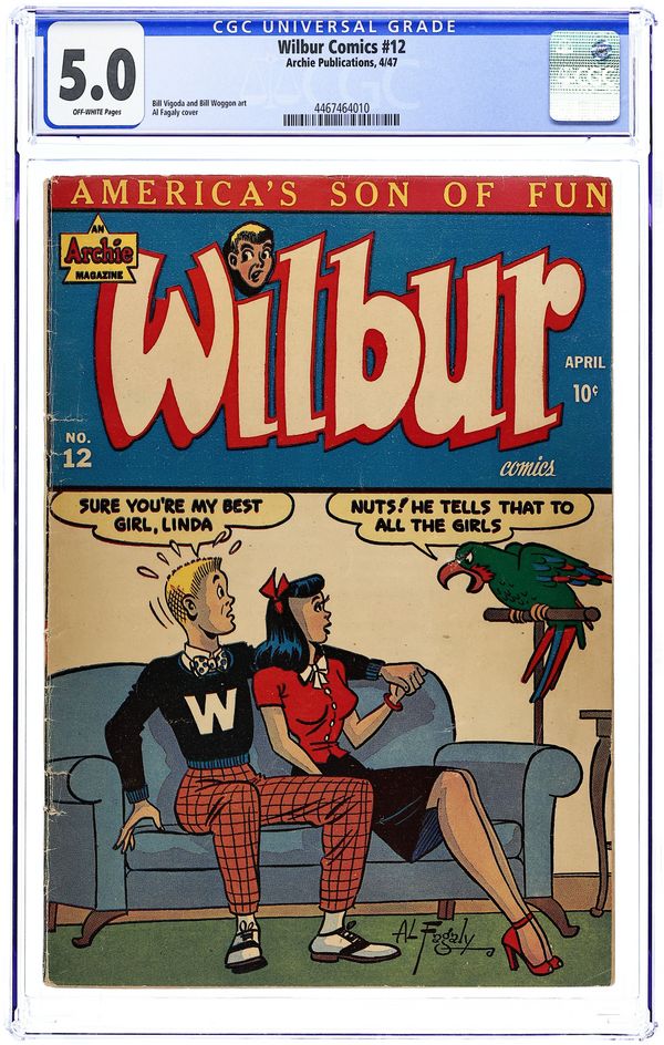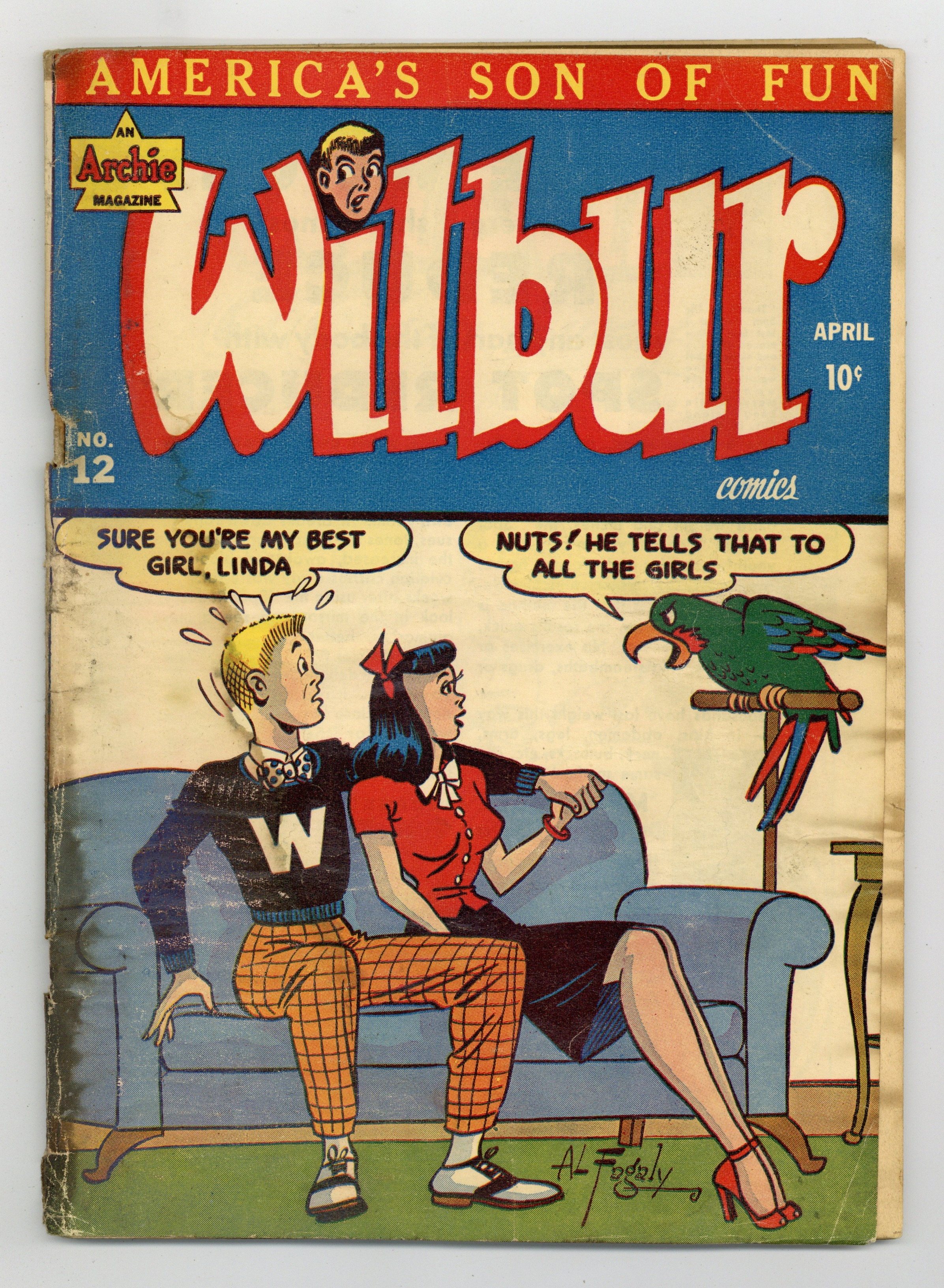 Cover pencils by Al Fagaly. "A Clean Sweep," pencils by Bill Vigoda; Wilbur and Mr. Wilkin try to clean the chimney. Archie ad. "The Fade-Out," pencils by Bill Vigoda; Benny and Stinky fill Wilbur's pen with disappearing ink and chaos ensues. Wilbur Puzzle Page. "Tee For Two," pencils by Bill Vigoda; Wilbur is sick and goes golfing with Mr. Wilkin to get fresh air; Unfortunately, Wilbur gets sicker. "A Breezy Story," pencils by Bill Woggon; Katy Keene tries to keep her hat on and dress down on a windy day. "Dig Me, Brother" text story. "It's A Man's World," pencils by Bill Vigoda; Wilbur and Mr. Wilkin try to keep house while Mrs. Wilkin is away. Archie ad. 52 pgs., full color. $0.10. Cover price $0.10.