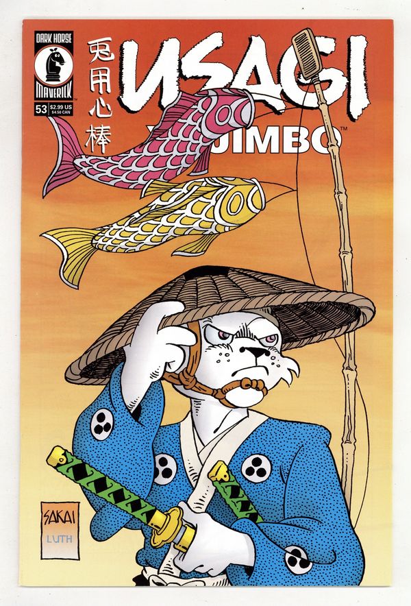 Published Dec 2001 by Dark Horse.$11.25created, written, & illustrated by STAN SAKAI In feudal Japan, when a samurai had a justifiable reason for revenge, the government could issue an adauchi, official consent for vigilante justice. In this issue of Usagi Yojimbo, our sword-wielding hare encounters just such a samurai on the hunt for four ronin who killed his father. But unfortunately for the angry son, three of the renegade samurai have joined a vicious gang. With the help of Usagi's twin swords of fury, the son might have half a chance, but these guys are one tough bunch. Will Usagi and the young samurai make it out alive? Has Usagi made another one of his brash decisions in helping the young man? Catch the action in Usagi Yojimbo #53! On sale December 19 b&w, 24 pg . . . . . . . . . . . . . . $2.99 Cover price $2.99.