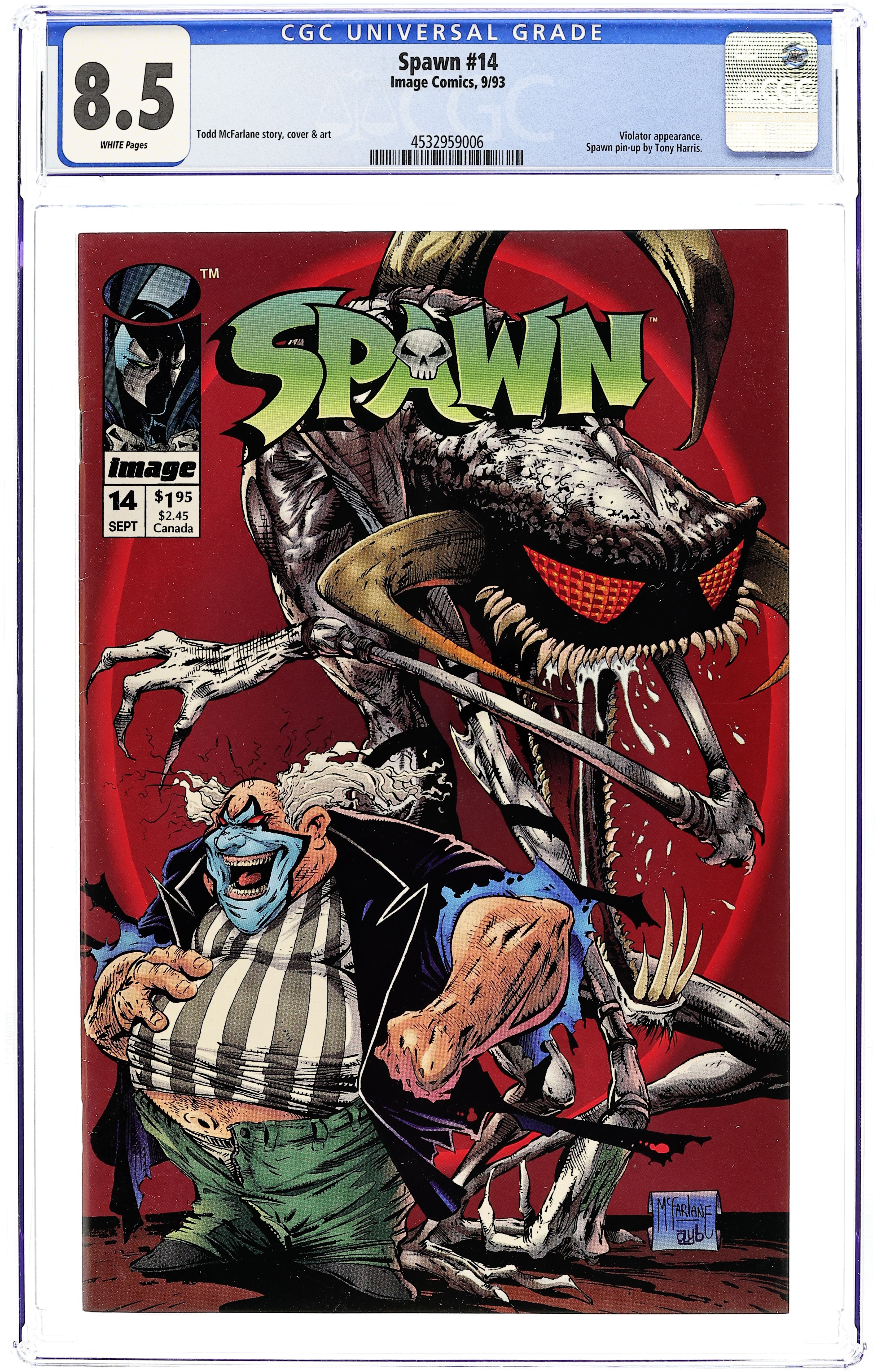 Direct Edition. "Myths!" Part 1 of 2. Story and art by Todd McFarlane. The demonic Violator returns to take on the Medieval Spawn from issue #9. Meanwhile, Detectives Sam and Twitch investigate a lead on the back-alley vigilante. Includes 2 Spawn pin-ups. Cover price $1.95.