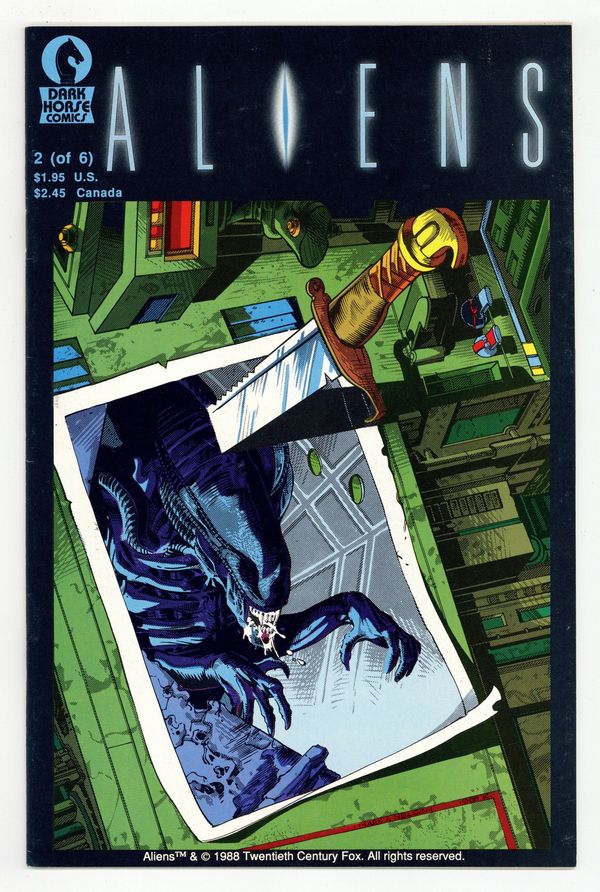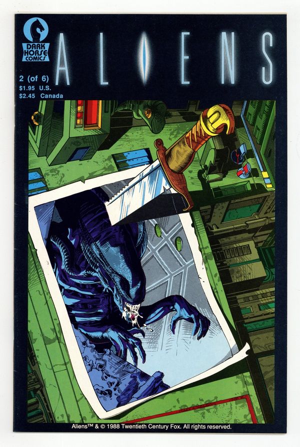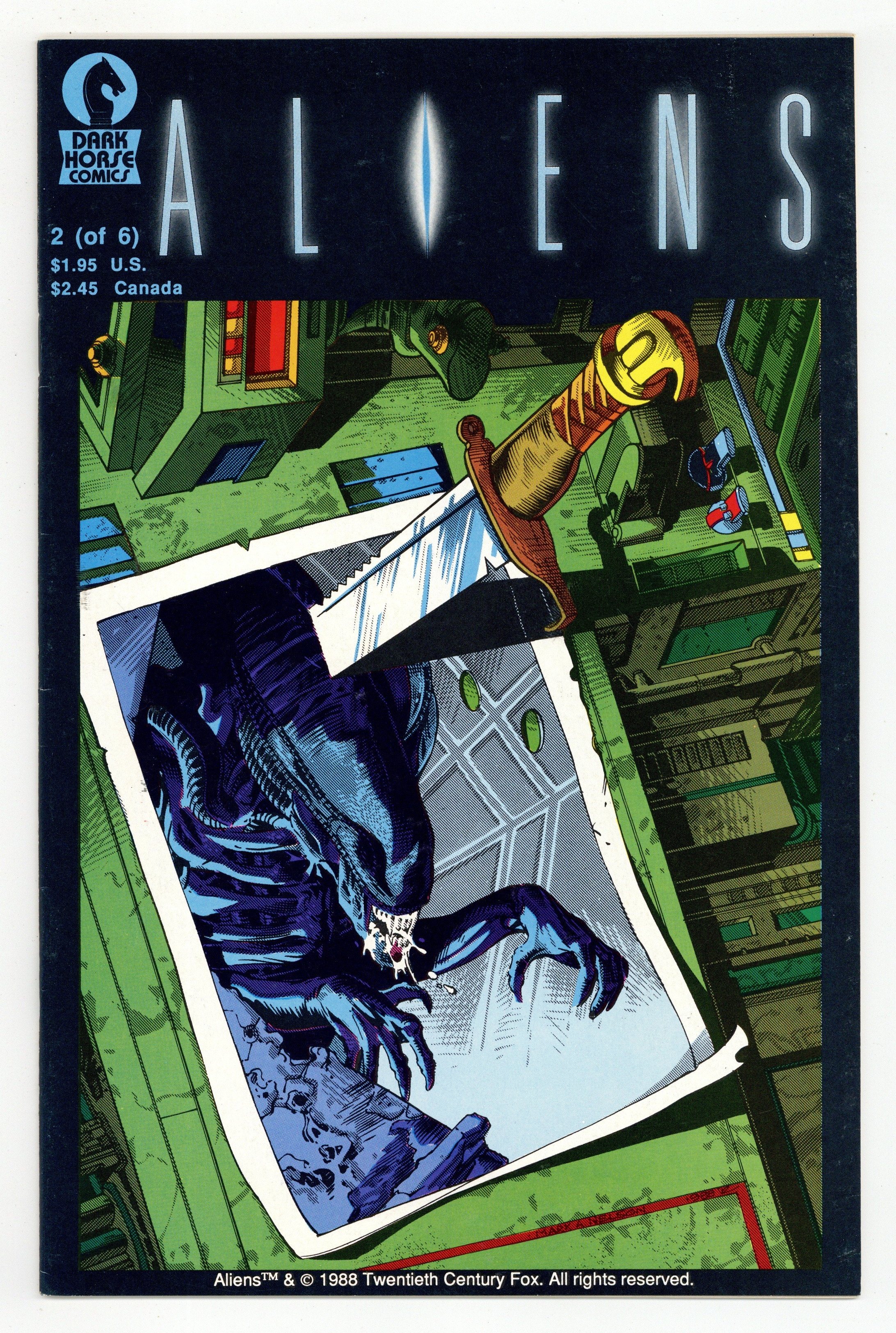 Published Sep 1988 by Dark Horse.$18.751st printing - Written by Mark Verheiden. Art and cover by Mark A. Nelson. Hicks breaks Newt out of the mental hospital where she is being held, and the two of them, along with a crack squad of battle-hardened Marines, blast-off for the Aliens' homeworld. But is the Alien menace really as far away as Hicks believes, or is the threat closer to Earth than anyone imagines? 32 pages, B&W. Cover price $1.95.