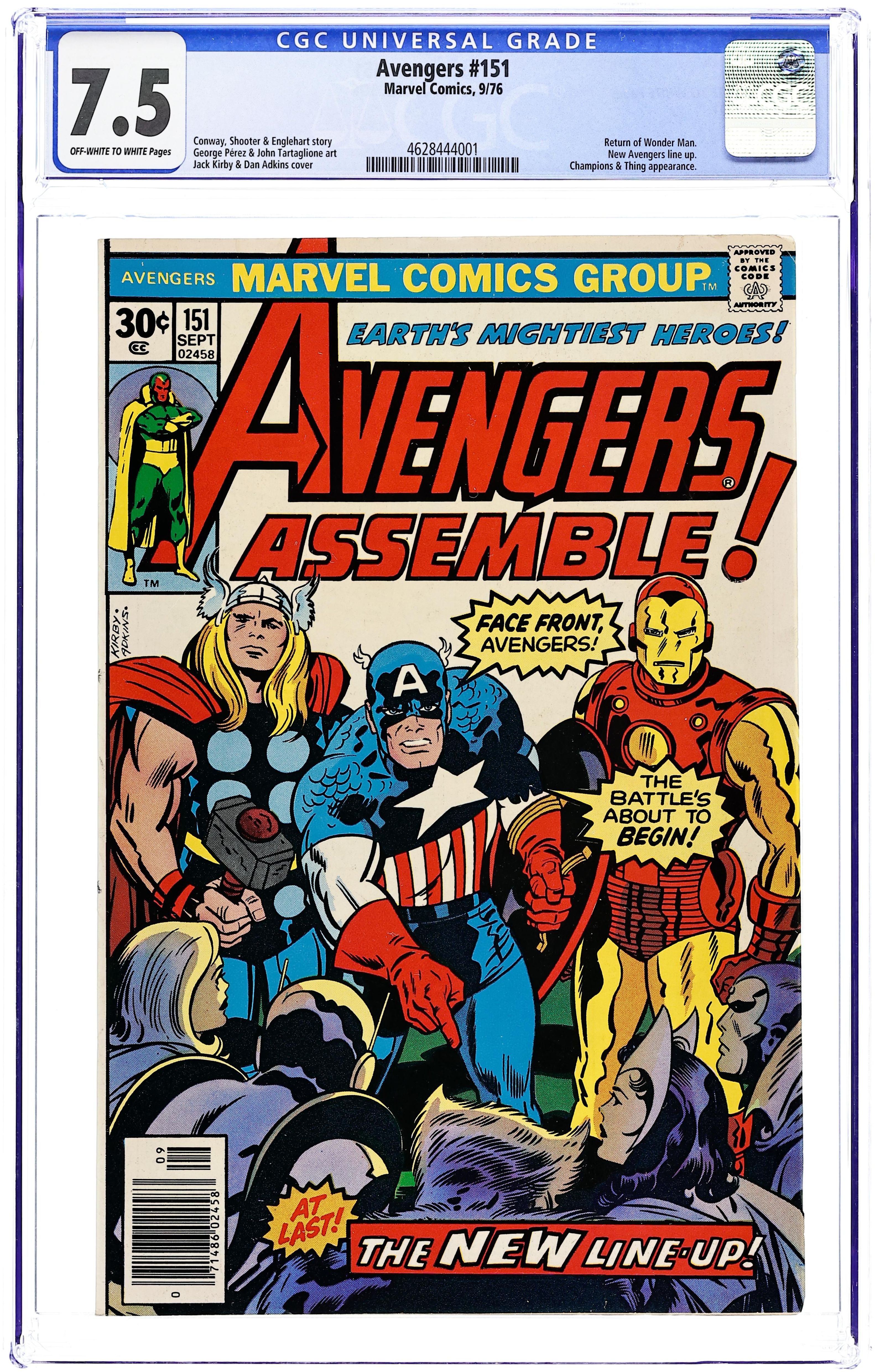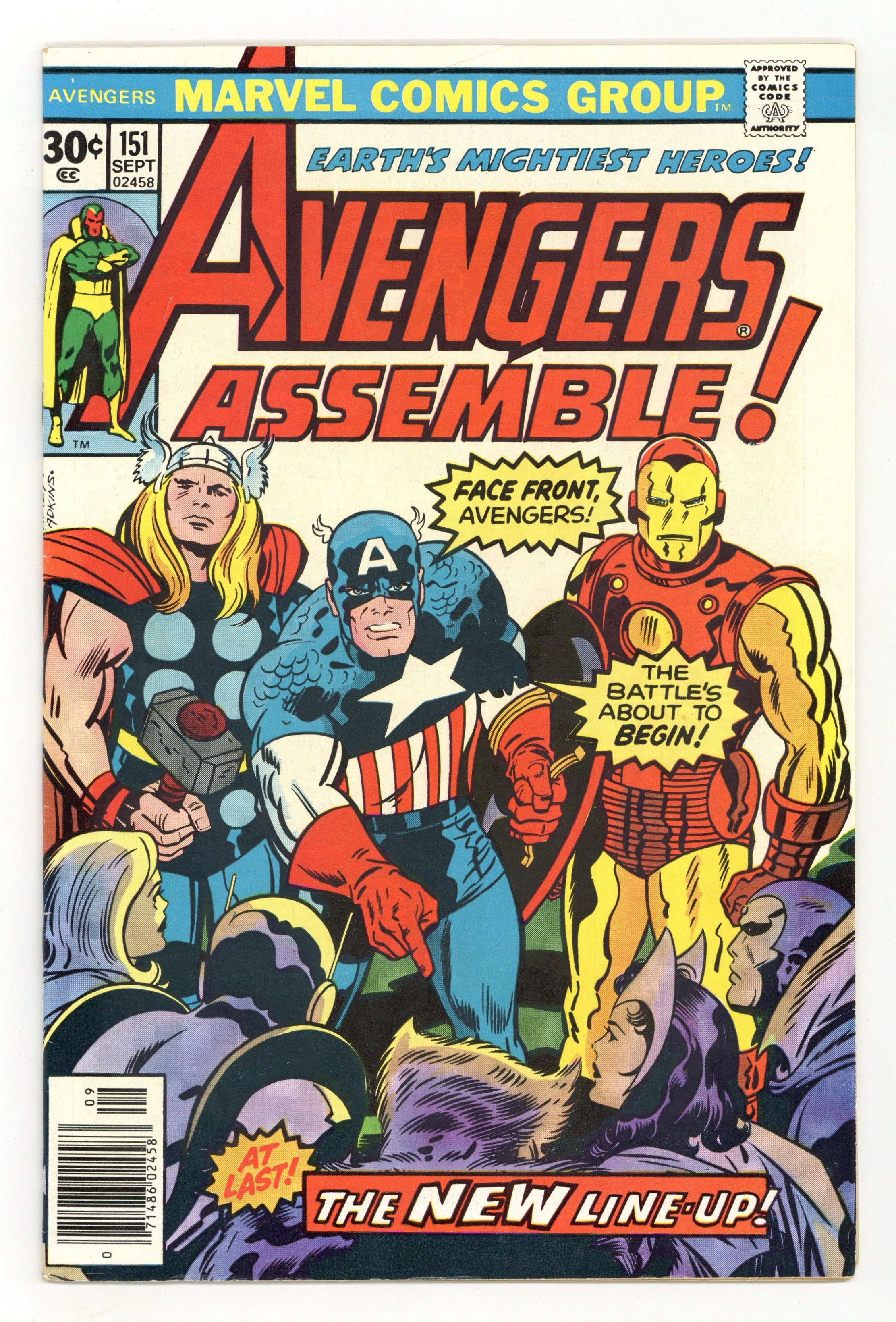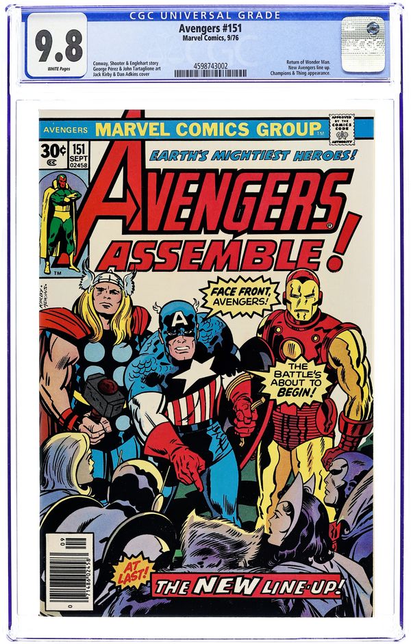 "At Last: The Decision!" Part 2 of 2. Script by Steve Englehart, Gerry Conway, and Jim Shooter. Pencils by George Perez. Inks by John Tartaglione. Cover by Jack Kirby and Dan Adkins. Finally, the Avengers are ready to set their new roster! Iron Man agrees to be chairman! Cap stays! Wanda and the Vision remain with the group! The Wasp eagerly signs up! Yellowjacket first declines but then changes his mind! Moondragon decides to leave, and Hellcat goes with her. The bombastic Beast jubilantly joins! And Wonder Man...hold on, what? How? Wow! Cameo appearances by Robert Frank (aka the golden age Whizzer), the Black Widow, Angel, Ghost Rider, Hercules, Iceman, Ben Grimm, Wonder Man, and the Living Laser. First 30¢ issue. (Notes: This issue concludes Steve Englehart's legendary 4-year run as the writer for Earth's Mightiest Heroes. A time period that produced many of the Avengers' all-time fan favorite stories including the three frequently reprinted sagas: the Avengers-Defenders War, the Celestial Madonna saga, and the Serpent Crown crisis. The letters page contains an essay explaining why the 150th anniversary story ended up as two issues.) 36 pgs. Cover price $0.30.