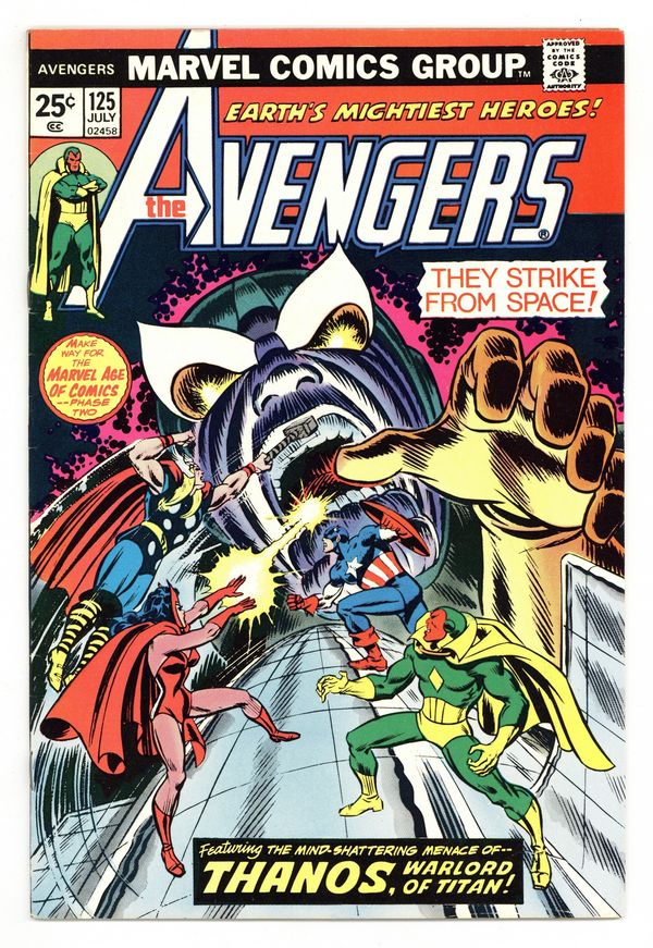 Tags: Marvel Legacy Numbering: Avengers (part 125), Thanos: The Final Threat (part 14), Avengers, Thanos$29.00"The Power of Babel!" Guest-starring Captain Marvel. Script by Steve Englehart. Art by John Buscema (breakdowns) and Dave Cockrum (finishes). Cover by Ron Wilson and John Romita. Story continues from Captain Marvel 32. Captain America returns to the Avengers just in time for an out-of-this-world adventure! Earth's Mightiest Heroes blast off into outer space to intercept Thanos' awesome armada headed towards Earth! The Avengers attack the alien starships and inflict heavy damage until they bump into a solid black force field! What's hiding behind the imposing barrier? The Vision, Scarlet Witch, Swordsman, and Mantis penetrate the force field and discover the mad Titan's massive command ship! And hordes of aliens inside! But these are four mighty avengers! With skill and teamwork, they disable the ship's universal translator and throw the entire attack fleet into chaos! Have the Avengers finally derailed Thanos' plan for conquest of the cosmos? Story concludes in Captain Marvel 33. Cameo appearances by Libra, Lou-Ann, Thanos, and the Skrulls. Avengers Lineup: Black Panther, Captain America, Iron Man, Mantis, Scarlet Witch, Swordsman, Thor, and the Vision. (Note: The letters page contains Marvel Value Stamp Series A #69 Marvel Girl.) 36 pages Cover price $0.25.