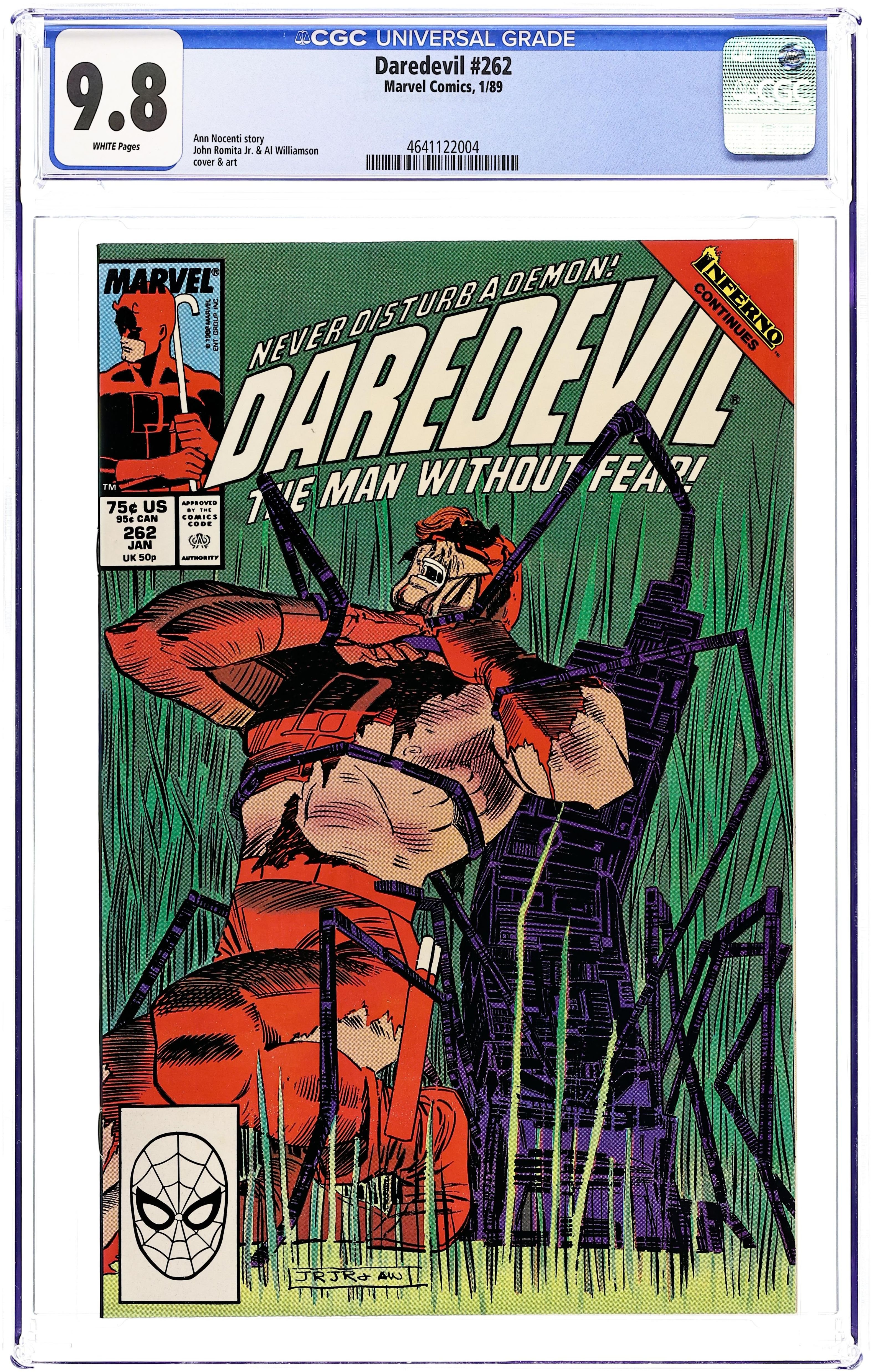 Cover pencils by John Romita, Jr., inks by Al Williamson. The Black Widow guest stars in this Inferno crossover, I Found Me In a Gloomy Wood Astray, script by Ann Nocenti, pencils by John Romita, Jr., inks by Al Williamson; Karen and the Widow are still searching for the missing DD when New York City begins to come alive and attack its citizens; DD, still badly injured from his beating by Typhoid, is coached back to health in his psyche by his old mentor Stick; Mary finds DD first. 32 pgs. Cover price $0.75. Cover price $0.75.