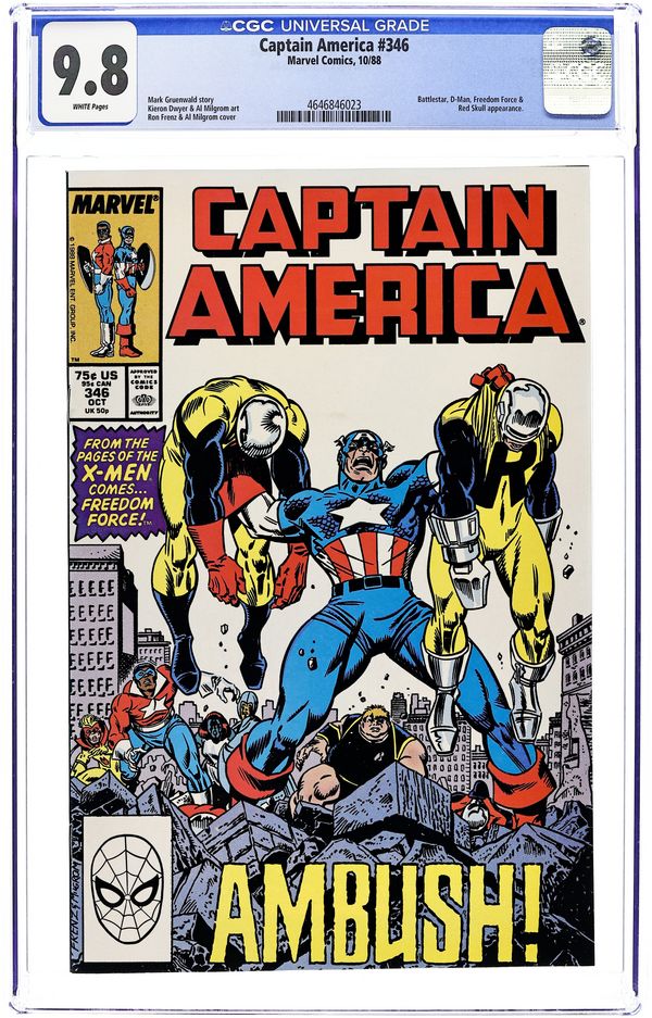 "Ambush!" Story by Mark Gruenwald. Art by Kieron Dwyer and Al Milgrom. Cover by Ron Frenz and Al Milgrom. John Walker is in a state of shock after the Watchdogs murdered his parents in the previous issue; however, there is not any time to rest as the Commission already has his next mission ready to go. Captain America, Battlestar, and Freedom Force are assigned to apprehend the pro-mutant group known as the Resistants. Can John Walker defeat the Resistants single-handedly? Meanwhile, the head of the Commission is consulting with a mysterious villain about the activities of Captain America. 36 pages Cover price $0.75.