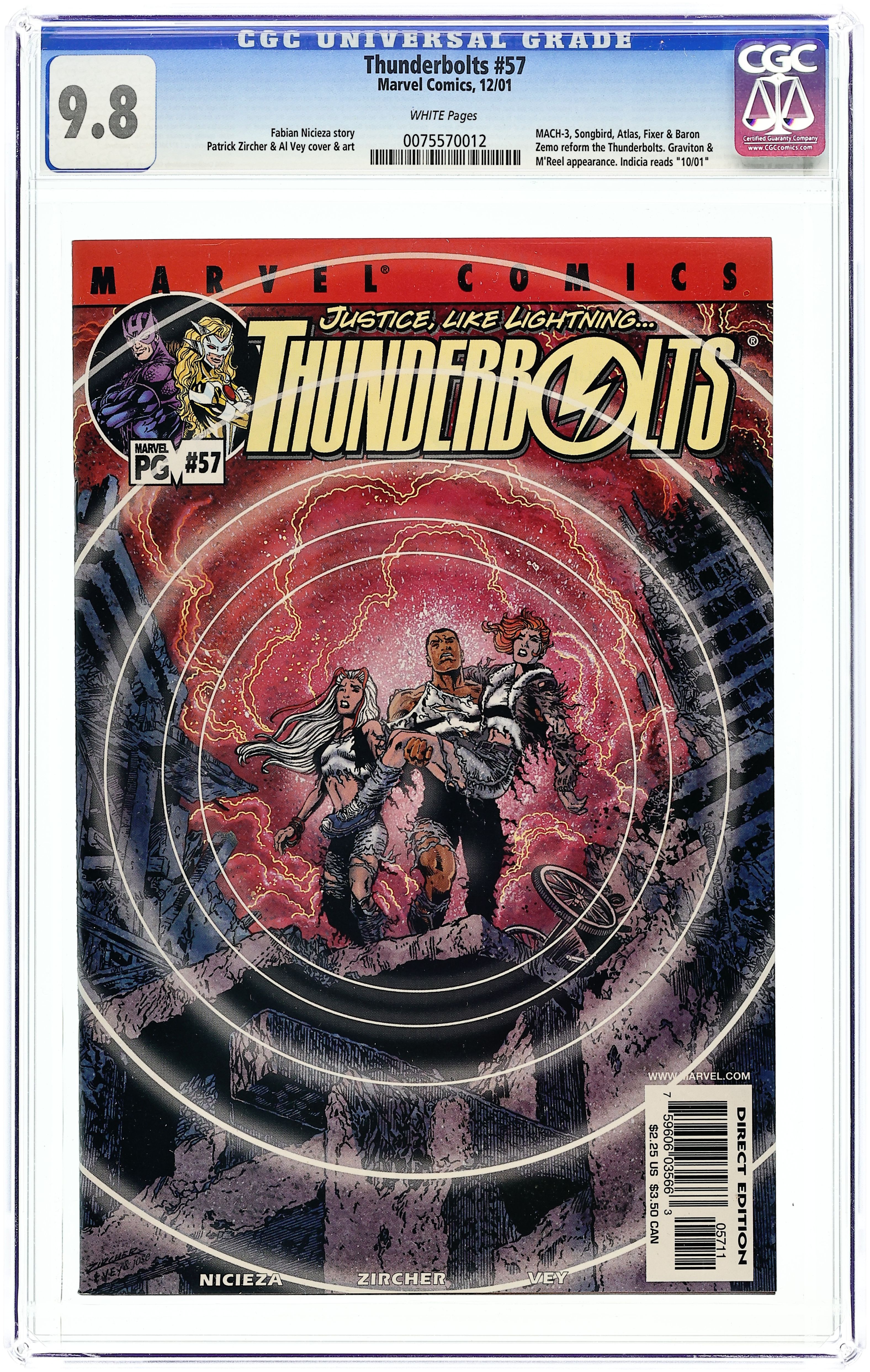 "Storms Clouds Gathering" Part 2 of 3. Script by Fabian Nicieza. Pencils by Patrick Zircher. Inks by Al Vey. Cover by Patrick Zircher and Al Vey. Graviton reigns supreme in the Rocky Mountains! The Master of Gravity has lifted the great cities of the world (including London, Paris, and many others) into the clouds! And at the same time trapped all the New York-based super-heroes (such as the Avengers and Fantastic Four) in a powerful gravitational field. Now he's busy terraforming the Earth into his own image! Wow, who can (or who is left) to defeat Graviton? In a stunning twist of fate, Baron Zemo (in the body of Citizen V) decides to lead the counterattack against the Master of Gravity! After Helmut locates Abe Jenkins and Melissa Gold in Burton Canyon, he orders the V-Battalion to send new armor for both of them! So MACH-3 and Songbird are back in the game! And once Atlas arrives in Colorado (via the body of Dallas Riordan), the original Thunderbolts are assembled and ready to save the world! Appearances by the Fixer, Moonstone, M'Reel, Roger Aubrey, Elisabeth Barstow, Fred Davis, Hawkeye, Cottonmouth, Headlok, Mentallo, Plantman, Jarvis, and Kang the Conqueror. 32 pages. Cover price $2.25.