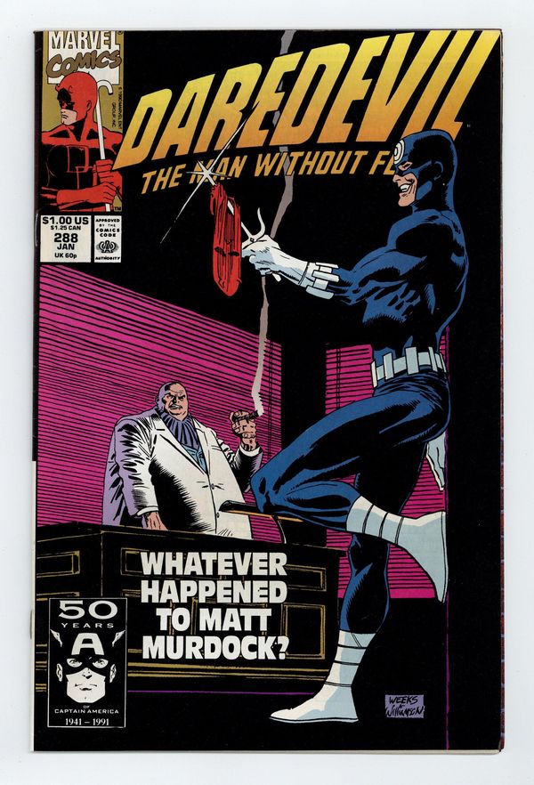 Tags: Marvel Legacy Numbering: Daredevil (part 288), Daredevil$13.00Cover pencils by Lee Week, inks by Al Williamson. The Student starring Matt Murdock [as Jack Murdock, Daredevil], Nyla Skin, Ben Urich, Elektra (dream), Stick (dream), Bullseye [also as Daredevil], and Kingpin, script by Ann Nocenti, pencils by Lee Weeks, inks by Al Williamson (p. 1-18) and Lee Weeks (p. 19-22); Dreams of Elektra and Stick start to remind Matt of who he is; Kingpin contacts Bullseye for a special job. 36 pgs. Cover price $1.00. Cover price $1.00.