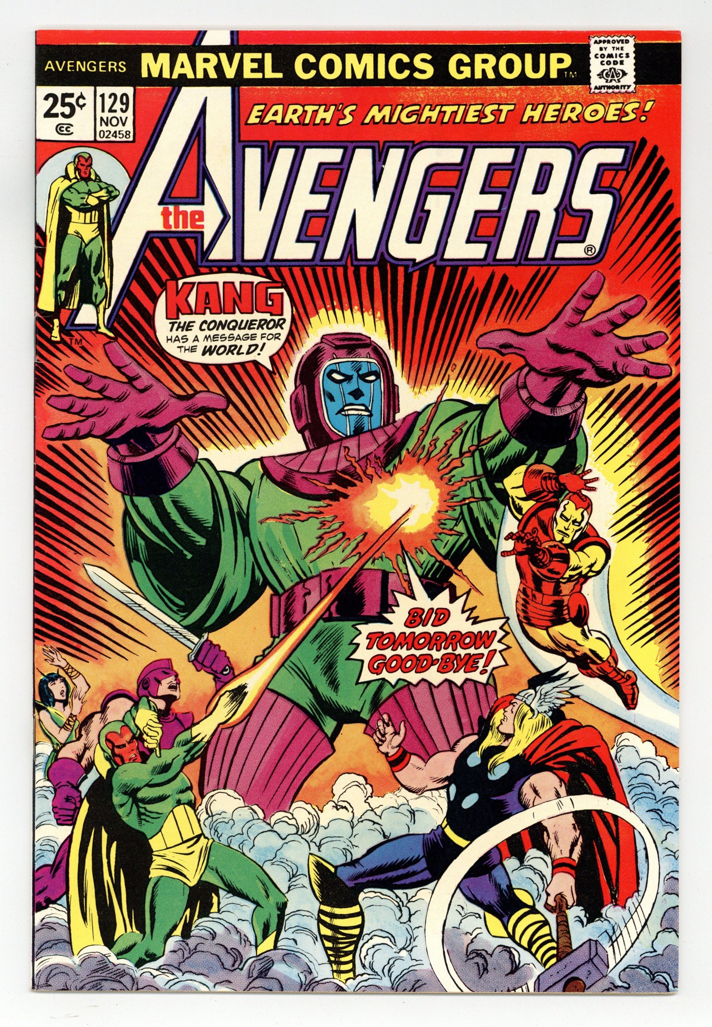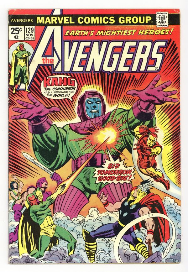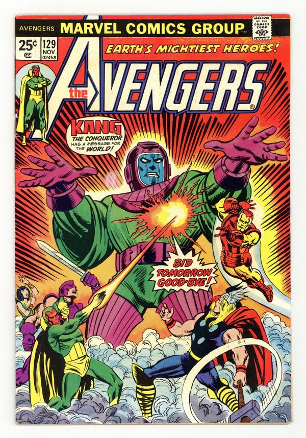 "Bid Tomorrow Goodbye!" Script by Steve Englehart. Art by Sal Buscema (breakdowns) and Joe Staton (finishes). Cover by Ron Wilson and Mike Esposito. A bright shining star appears over Avengers Mansion! What does the radiant beacon foretell? Kang the Conqueror thinks he knows! And thus begins the Celestial Madonna saga! The 41st century Master of Time and his macrobots attack the Avengers outside their mansion! After overwhelming the six avengers, Kang absconds with five of them plus Agatha Harkness! The Conqueror deems the Swordsman as unworthy and leaves him behind. Will Kang end up regretting that decision? The former sword-wielding super-villain certainly has his work cut out for him! However, the Swordsman catches a big break when Agatha Harkness telepathically reveals Kang's hideaway! The centuries-old pyramids of Egypt! After arriving in the Egyptian desert, the Swordsman desperately needs an ally! Could one of the ancient pharaohs still be lurking around to help? Story continues in Giant-Size Avengers 2. Cameo appearance by Rama-Tut. Avengers Lineup: Iron Man, Mantis, Scarlet Witch, Swordsman, Thor, and the Vision. (Notes: The classic Celestial Madonna storyline runs through Avengers 129-135 and Giant-Size Avengers 2-4. Kang previously battled Earth's Mightiest Heroes in Avengers (1st series) 71. The letters page contains Marvel Value Stamp Series A #88 The Leader.) 36 pages Cover price $0.25.