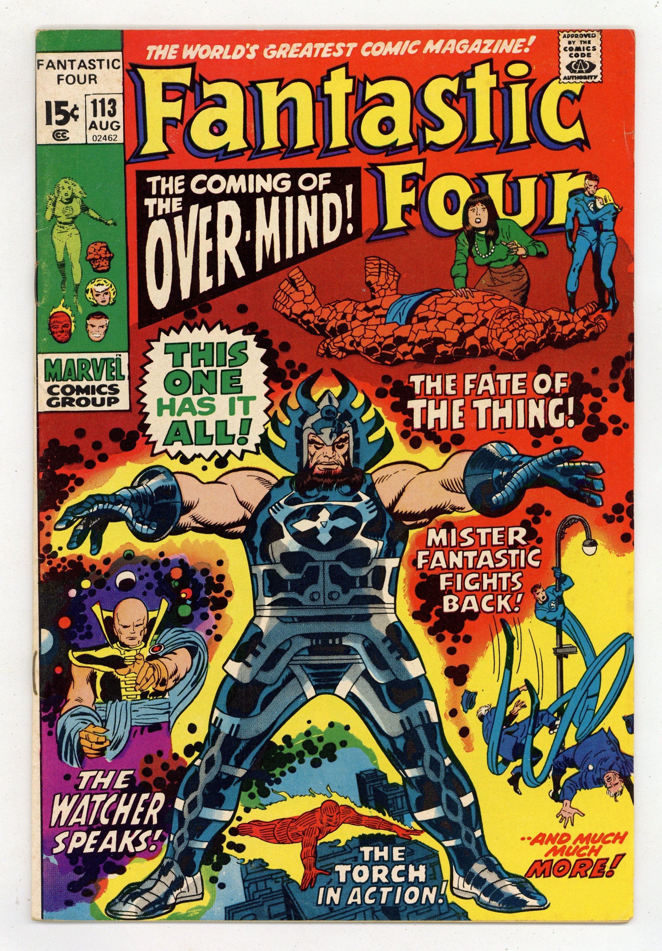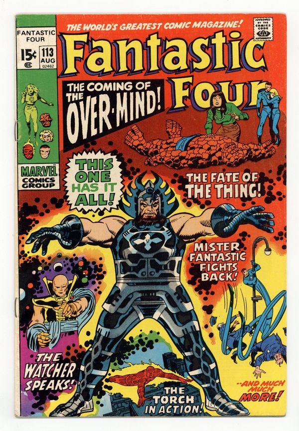"The Power of the Over-Mind!" Part 1 of 4. Script by Stan Lee. Pencils by John Buscema. Inks by Joe Sinnott. Cover by John Buscema and John Verpoorten. The Thing has gone down to defeat at the hands of the Incredible Hulk. And now Reed, Sue, and Johnny are left to pick up the pieces and administer first aid to Ben Grimm. But while the trio transports the Thing to safety, more problems arise! The police want to arrest the FF, angry citizens want to storm the Baxter Building, and the Watcher wants to talk! Whew, there's no rest for the weary! Fortunately though, the Watcher keeps it brief: "Beware the Over-Mind!" Wow, cryptic words indeed! First appearance of the Over-Mind. Cameo appearances by Bruce Banner, Agatha Harkness, Alicia Masters, Franklin, and New York Mayor John Lindsay. 36 pages Cover price $0.15.