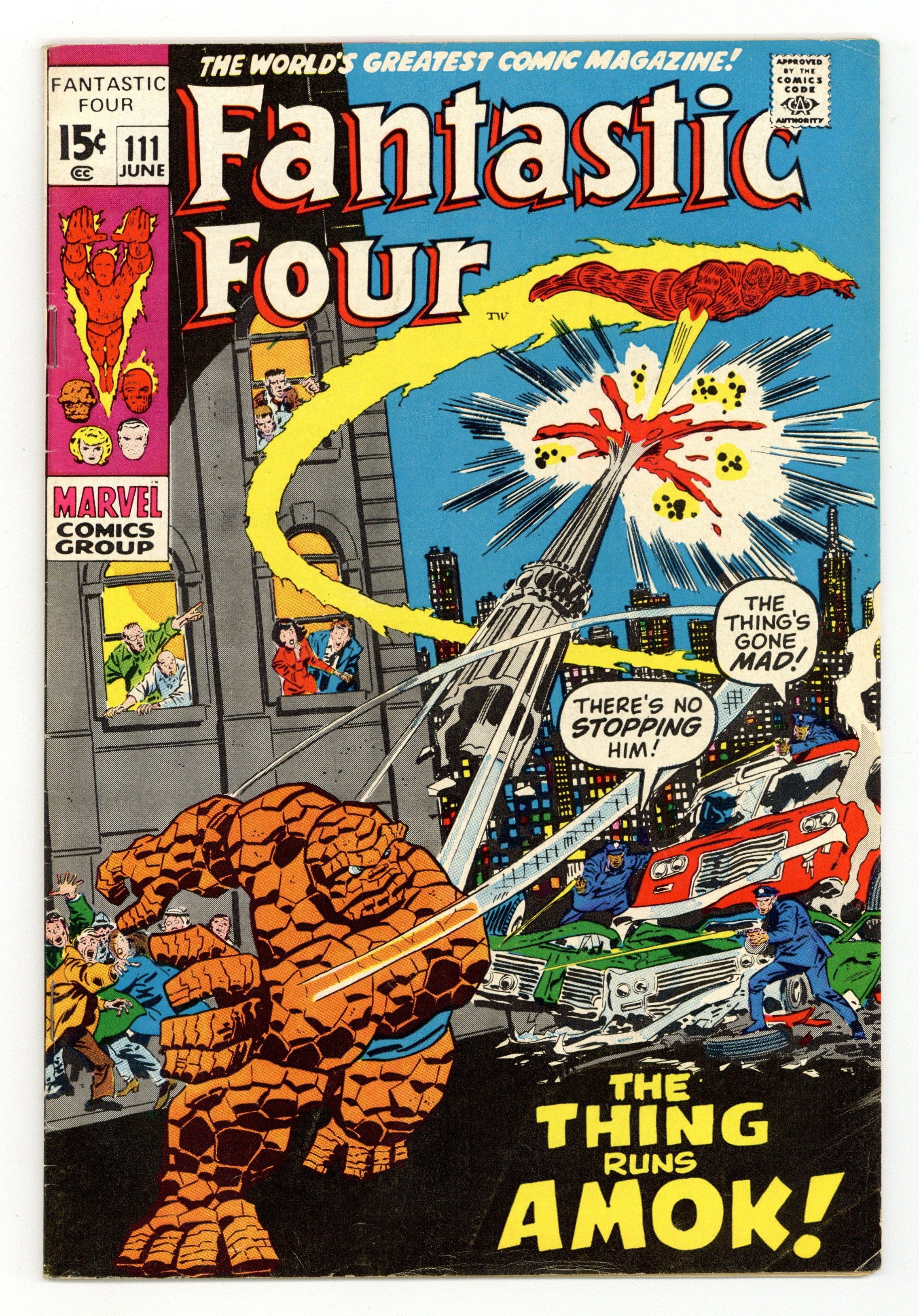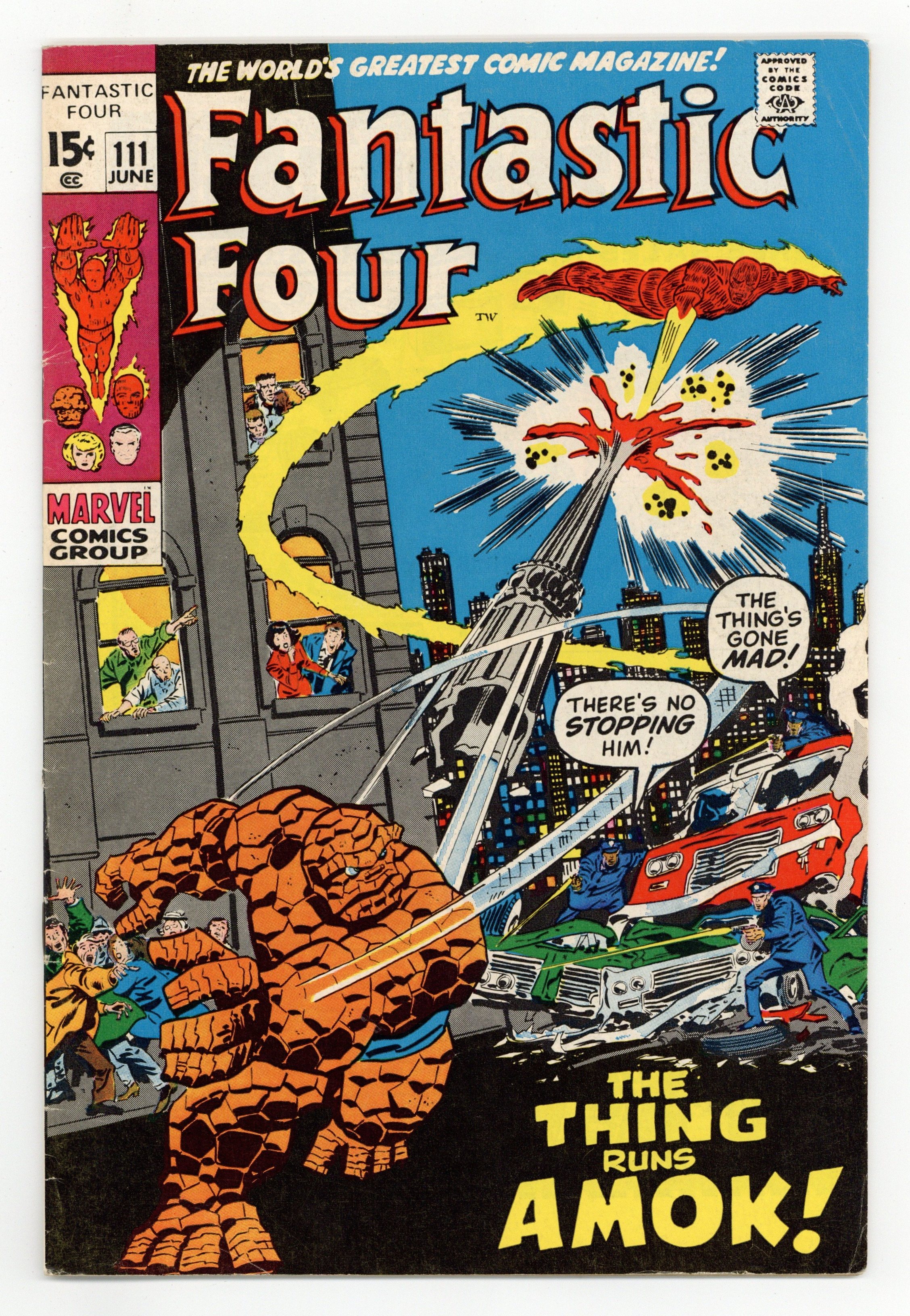 "The Thing Amok!" Script by Stan Lee. Pencils by John Buscema. Inks by Joe Sinnott. Cover by John Buscema and John Verpoorten. The Thing has gone crazy! And now he's running amok in Manhattan! Can the remaining members of the FF halt their rampaging teammate? The Human Torch tackles the Thing first, but to no avail! Ben Grimm looks unstoppable! Is anyone else available? Perhaps someone gargantuan, gamma-radiated, and green...and likes to smash! Oh my, the stage is set for an epic clash of the titans next issue! Cameo appearances by Agatha Harkness, Peter Parker, J. Jonah Jameson, Joe Robertson, and the Hulk. 36 pages Cover price $0.15.
