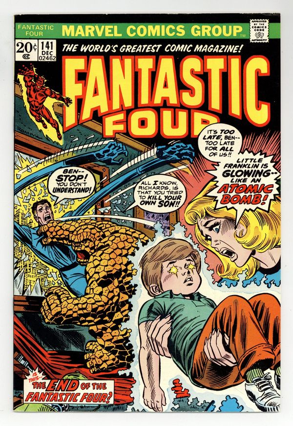 Starts Mar 23 "The End of the Fantastic Four!" Part 2 of 2. Script by Gerry Conway. Art by John Buscema (breakdowns) and Joe Sinnott (finishes). Cover by John Romita. The situation looks grim indeed as Reed, Sue, Ben, Johnny, Medusa, Franklin, Wyatt Wingfoot, and Agatha Harkness are all prisoners of Annihilus in the Negative Zone! What is the master of the Negative Zone planning for the helpless Fantastic Four? After connecting Franklin to his gene transmuter, Annihilus siphons the young boy's power to recharge his cosmic control rod! Can anyone stop the power transfer and save Franklin's life? Or will disaster strike the Fantastic Four? (Note: Annihilus appears next in Captain Marvel 35.) 36 pages Cover price $0.20.
