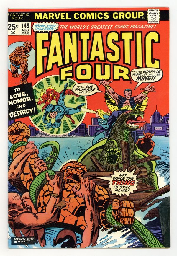 "To Love, Honor, and Destroy!" Script by Gerry Conway. Art by Rich Buckler (breakdowns) and Joe Sinnott (finishes). Cover by Rich Buckler and Joe Sinnott. One of the landmark issues of the Fantastic Four! Emotions run at an all-time high as the Sub-Mariner with the Invisible Girl by his side attacks Manhattan! Only Mister Fantastic, the Human Torch, the Thing, Thundra, and New York's finest stand in the way of Namor's conquest! Reed, Ben, and Johnny want to save the city, but what they really want to do is beat the living daylights out of the Avenging Son! With her husband, brother, and blue-eyed friend on the brink of defeat, what will Susan Richards do? Everything is on the line! An awesome ending! Brief re-telling of the Sub-Mariner's origin. Cameo appearances by Medusa and Triton. (Note: The letters page also contains Marvel Value Stamp series A #78 the Owl by Gene Colan.) 36 pages Cover price $0.25.