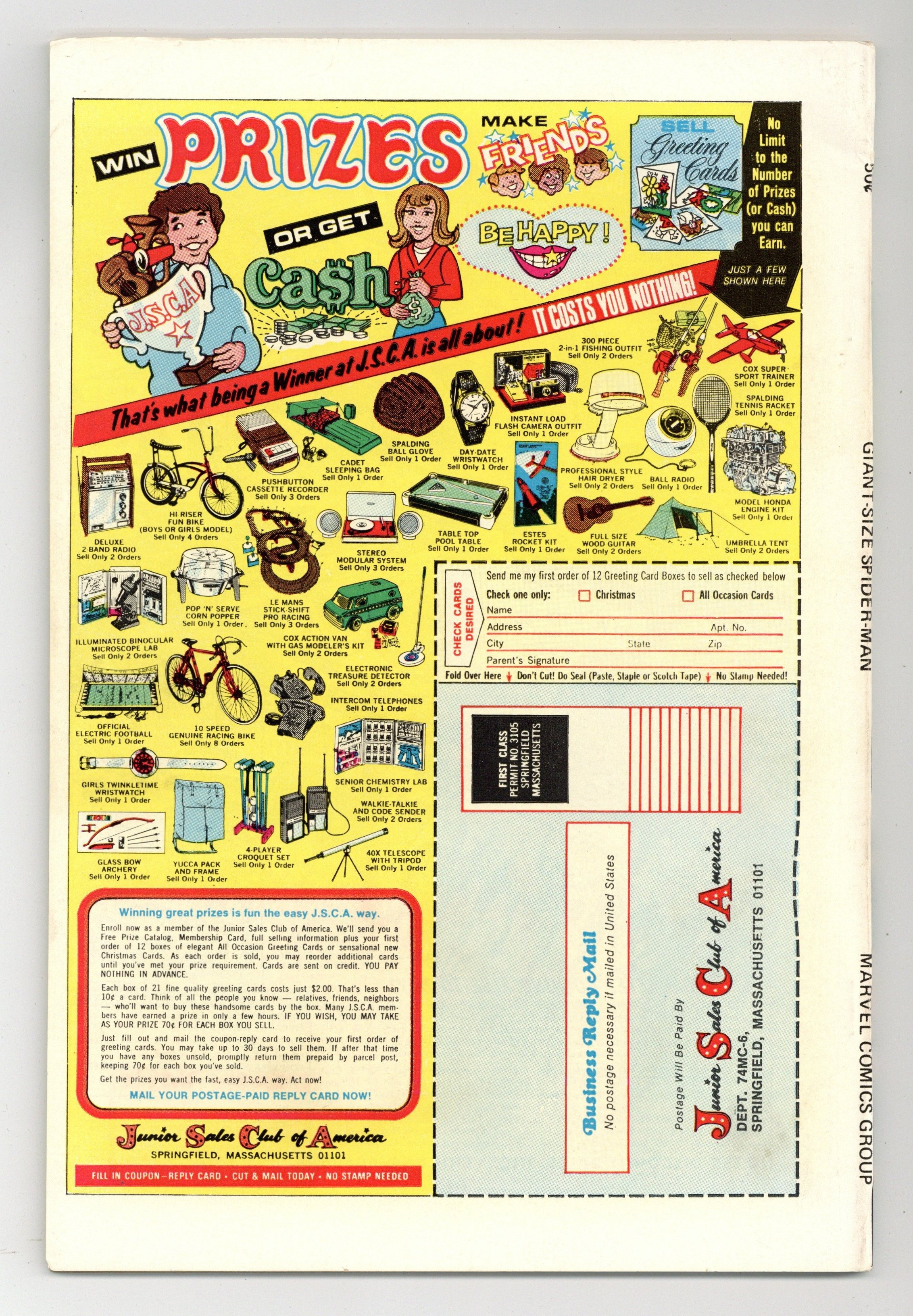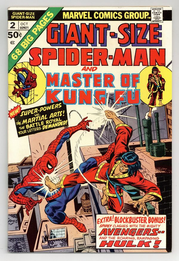 "Masterstroke!" Guest-starring Shang-Chi, Master of Kung Fu. Script by Len Wein. Pencils by Ross Andru. Inks by Al Milgrom. Cover by Gil Kane (pencils), John Romita, and Tony Mortellaro. It's the master plan of Fu Manchu! Make Spider-Man and Shang-Chi believe that each other is a criminal, and then set up a super showdown at the Con Ed Power Plant near the 59th street bridge! Even if the web-slinger and the Master of Kung Fu survive their epic battle with one another, the two heroes plus Black Jack Tarr must still stop Fu Manchu at the Empire State Building! A terrific action issue! Back up story: "To Become An Avenger!" Guest-starring the Avengers, Daredevil, and the Hulk. Script by Stan Lee. Layouts by John Romita. Pencils by Don Heck. Inks by Mickey Demeo (aka Mike Esposito). Spider-Man is offered membership into the Avengers, but he has to capture the Incredible Hulk first! Reprinted from Amazing Spiderman Annual 3. (Note: A full-size reprint of the cover of Annual 3 is included in the issue.) 64 pages Cover price $0.50.