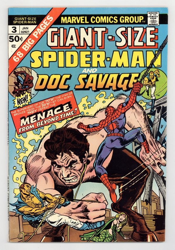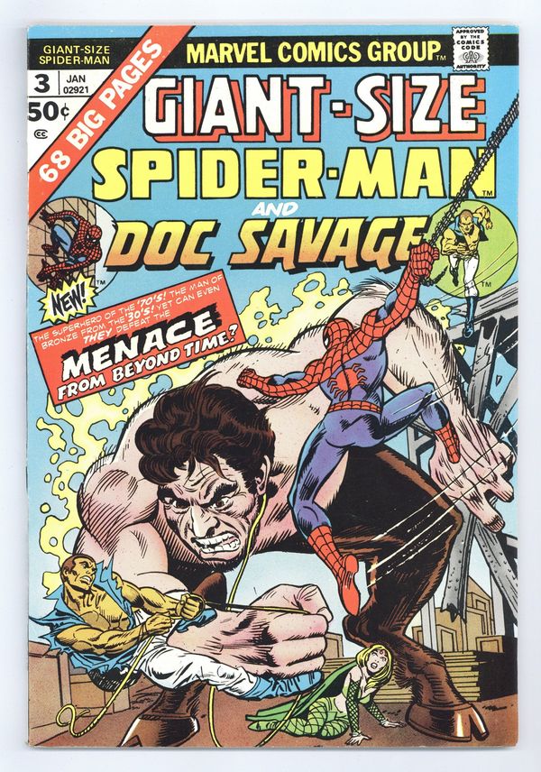 Tags: Spider-Man$14.00"The Yesterday Connection!" Guest-starring Doc Savage. Script by Gerry Conway. Pencils by Ross Andru. Inks by Mike Esposito. Cover by Gil Kane and Frank Giacoia. The legendary crime fighter from the 1930's, Doc Savage, teams up with the web-slinging super hero of the 1970's to battle a strange alien from a parallel dimension to Earth. The bronze hero from the Great Depression battles the treacherous Desinna in 1934, while the Spectacular Spider-Man fights her in 1974! How can the duo team up 40 years apart? Back up story: "Duel with Daredevil!" Script by Stan Lee. Art by Steve Ditko. The Ringmaster hypnotizes Spider-Man and directs him to fight Daredevil. Reprinted from Amazing Spiderman 16. (Note: Daredevil's original red and yellow costume is colored completely red in the reprinted version.) 64 pages Cover price $0.50.