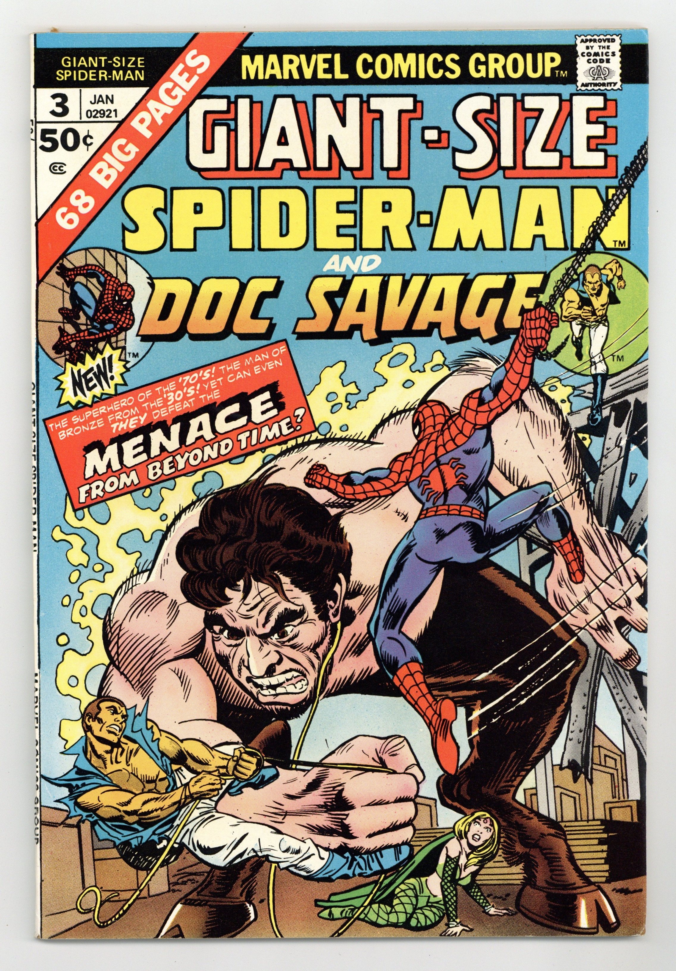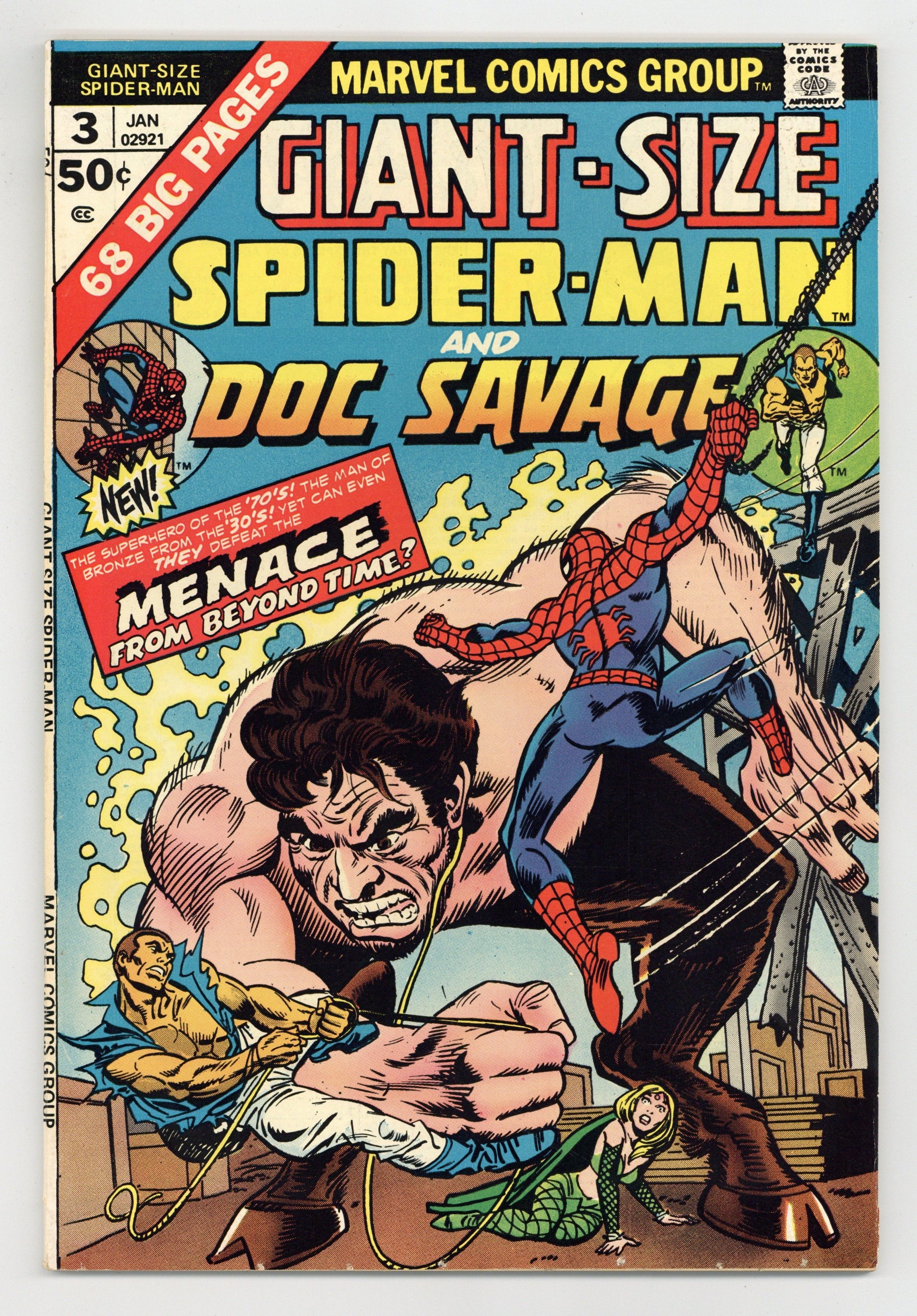 "The Yesterday Connection!" Guest-starring Doc Savage. Script by Gerry Conway. Pencils by Ross Andru. Inks by Mike Esposito. Cover by Gil Kane and Frank Giacoia. The legendary crime fighter from the 1930's, Doc Savage, teams up with the web-slinging super hero of the 1970's to battle a strange alien from a parallel dimension to Earth. The bronze hero from the Great Depression battles the treacherous Desinna in 1934, while the Spectacular Spider-Man fights her in 1974! How can the duo team up 40 years apart? Back up story: "Duel with Daredevil!" Script by Stan Lee. Art by Steve Ditko. The Ringmaster hypnotizes Spider-Man and directs him to fight Daredevil. Reprinted from Amazing Spiderman 16. (Note: Daredevil's original red and yellow costume is colored completely red in the reprinted version.) 64 pages Cover price $0.50.