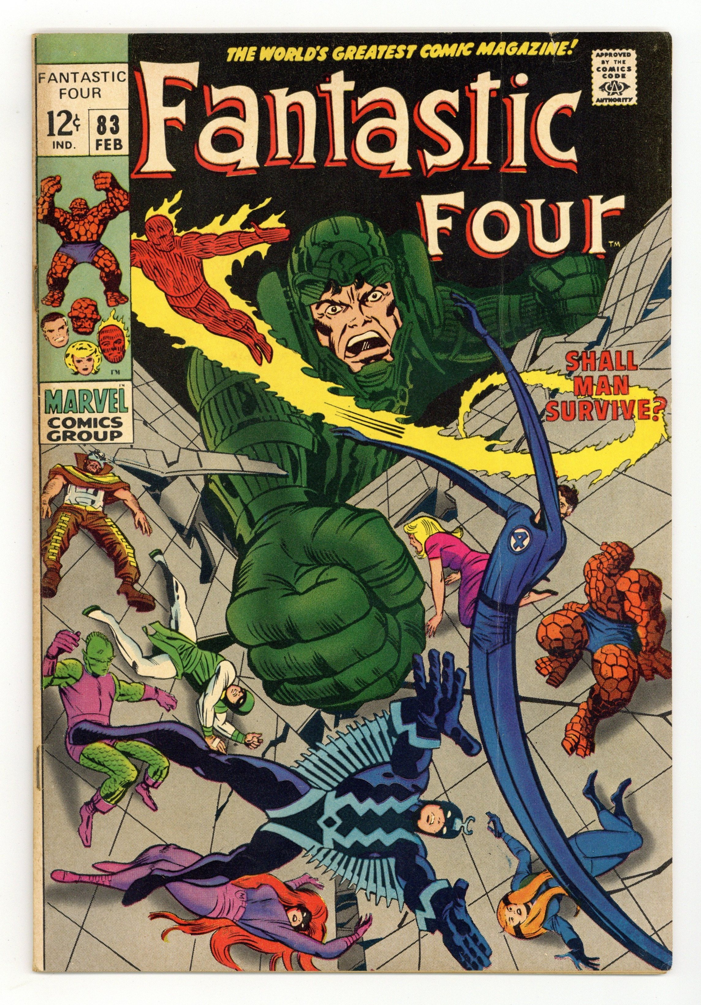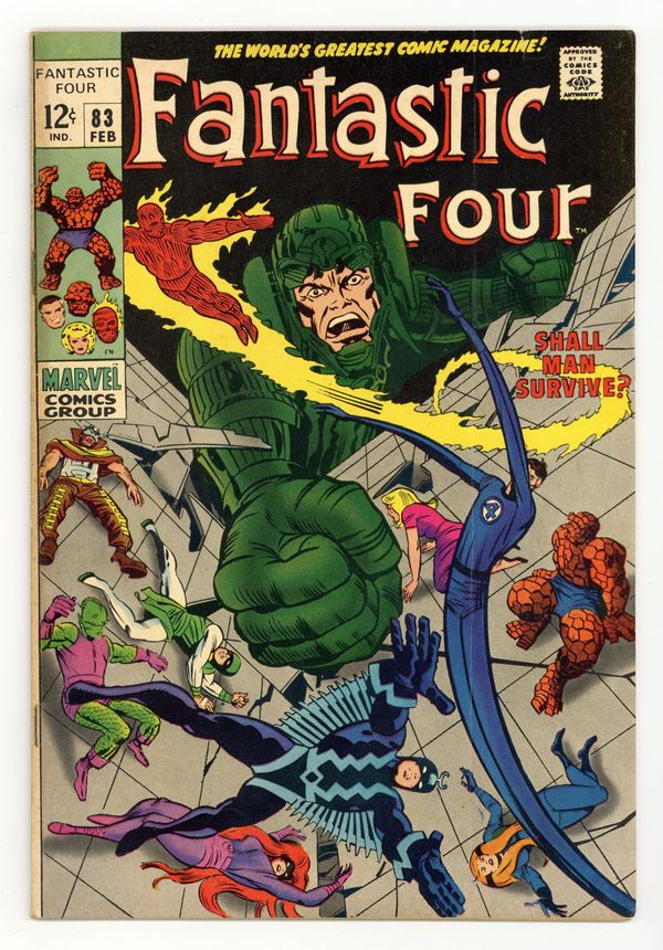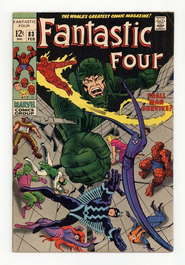"Shall Man Survive?" Part 2 of 2. Guest-starring the Inhumans. Script by Stan Lee. Pencils by Jack Kirby. Inks by Joe Sinnott. Cover by Jack Kirby and Joe Sinnott. Maximus the Mad has conquered Attilan! And his next target is the entire planet! With the Fantastic Four and the Inhumans as his captives, Black Bolt's crazy brother is on the brink of world domination thanks to his powerful hypno-gun! But the Inhumans still have one card to play! Black Bolt's awesome voice! His booming voice could free the royal family from its prison! Or destroy the whole city! Likewise in a nearby chamber, the FF work feverishly to escape from their confinement! If both super-teams can break out, they'll have a chance to break up Maximus' mad plan of conquest! Cameo appearances by the Invisible Girl and (baby) Franklin. Inhumans Lineup: Black Bolt, Gorgon, Karnak, Medusa, and Triton. (Notes: This issue is the second appearance of Franklin Richards. Although the Invisible Girl appears on the cover, she is not in Attilan for the battle. Maximus returns in Incredible Hulk 119. The Inhumans appear next in Silver Surfer (1st series) 18. This issue includes a full-page ad for Avengers 60 and Amazing Spider-Man 69. This two-part story was reprinted in Marvel's Greatest Comics 64 & 65) 36 pages Cover price $0.12.