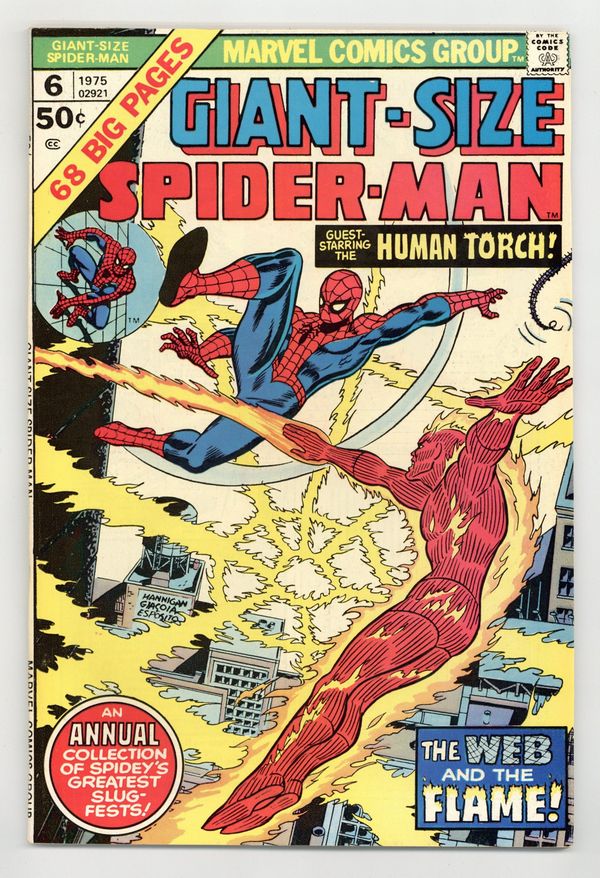 Tags: Spider-Man$18.50Cover pencils by Ed Hannigan, inks by Frank Giacoia and Mike Esposito. "The Web and the Flame," script by Stan Lee, pencils by Larry Lieber, inks by Mike Esposito (as Mickey Demeo) and Tony Mortellaro; The action starts with a bang as the Amazing Spider-Man spies the Human Torch running amok through the heart of Manhattan!; What has gotten into Johnny Storm?; The web-slinger swoops into stop the torch and discovers that the fiery member of the FF is just filming a movie; The embarrassed wall-crawler quickly departs, but an observant super-villain nearby begins to formulate a devious plan!; One thing leads to another and both Spidey and the torch are invited to shoot a brand new movie in Hollywood; But the duo might want to check the identities of the director and producer first; After a mishap on the set, the temporary teammates at last find their adversaries and a giant mechanical gorilla! 68 pgs., full color. Cover price $0.50.