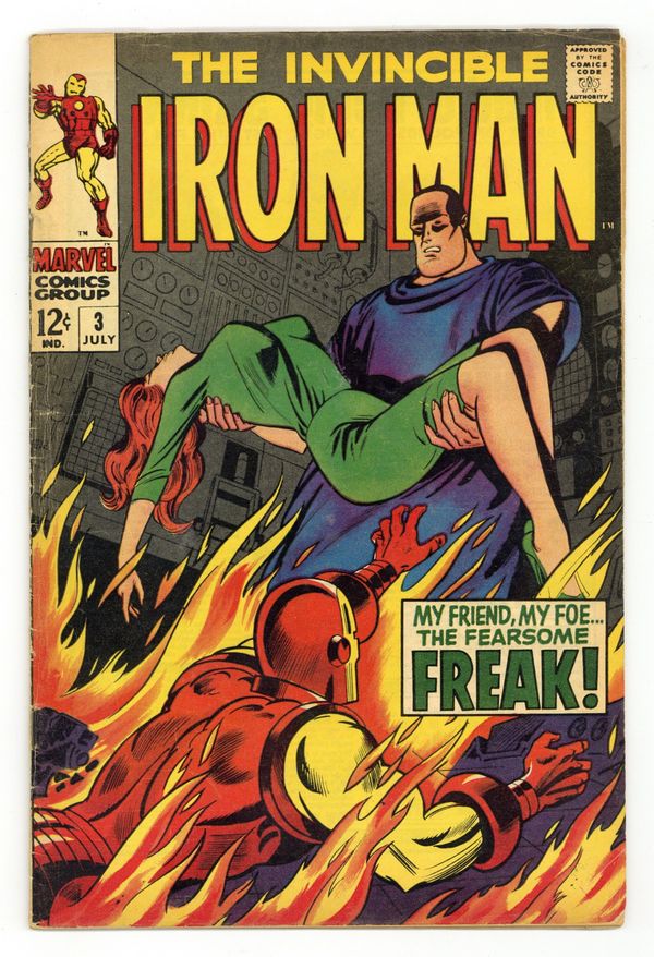 Tags: Marvel Legacy Numbering: Iron Man (part 3), Iron Man$39.00"My Friend, My Foe...The Freak!" Script by Archie Goodwin. Art by Johnny Craig. Cover by Johnny Craig. After rescuing a work crew at the Stark Industries Long Island rocket construction site, Iron Man experiences chest pains when his armor runs out of power. To repair and rebuild his armor Tony needs help from his close friend Happy Hogan. Unfortunately part of the repair procedure involves Happy operating the Cobalt Bombarder...and that step leads to the return of the Freak! It's another showdown between the golden avenger and the Freak...with Pepper Hogan caught in the middle! Cameo appearance by Whitney Frost. (Note: The letters page includes a letter from comics writer and artist Walt Simonson.) Cover price $0.12.