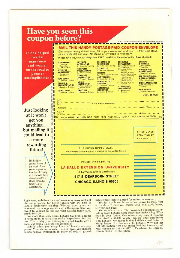 Cover pencils by Jim Starlin, inks by Al Milgrom. Death-Cult!, script by Doug Moench, pencils by Larry Hama, inks by Dick Giordano; Iron Fist meets Colleen Wing (1st appearance) and her father who knows all about Danny's stay in K'un-Lun; Iron Fist tries to make amends with Joy Meachum but she leads him into a trap where he has to face members of the Kara-Kai death cult; The mysterious ninja who actually killed Meachum shows up to give Danny a hand. Letter to the editor from comic artist Ken Meyer Jr. The letters page also contains Marvel Value Stamp series A # 6 (Thor by John Buscema, and also an ad for Wolverine's debut in Incredible Hulk 181. Cover price $0.25.