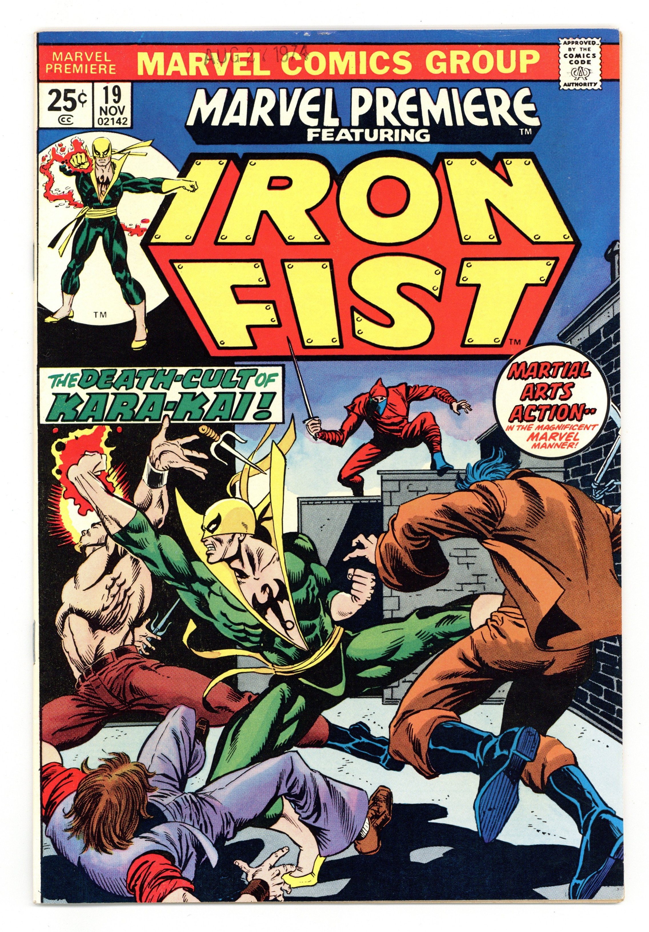 Tags: Martial Arts$75.00Cover pencils by Jim Starlin, inks by Al Milgrom. Death-Cult!, script by Doug Moench, pencils by Larry Hama, inks by Dick Giordano; Iron Fist meets Colleen Wing (1st appearance) and her father who knows all about Danny's stay in K'un-Lun; Iron Fist tries to make amends with Joy Meachum but she leads him into a trap where he has to face members of the Kara-Kai death cult; The mysterious ninja who actually killed Meachum shows up to give Danny a hand. Letter to the editor from comic artist Ken Meyer Jr. The letters page also contains Marvel Value Stamp series A # 6 (Thor by John Buscema, and also an ad for Wolverine's debut in Incredible Hulk 181. Cover price $0.25.
