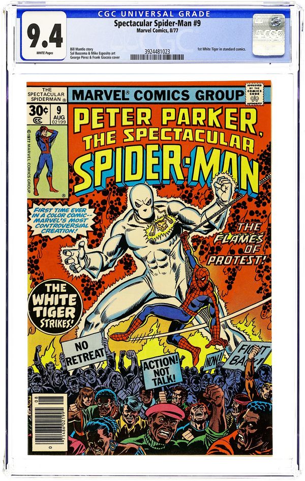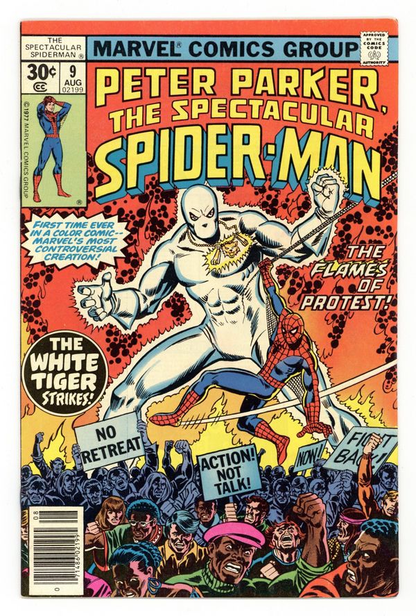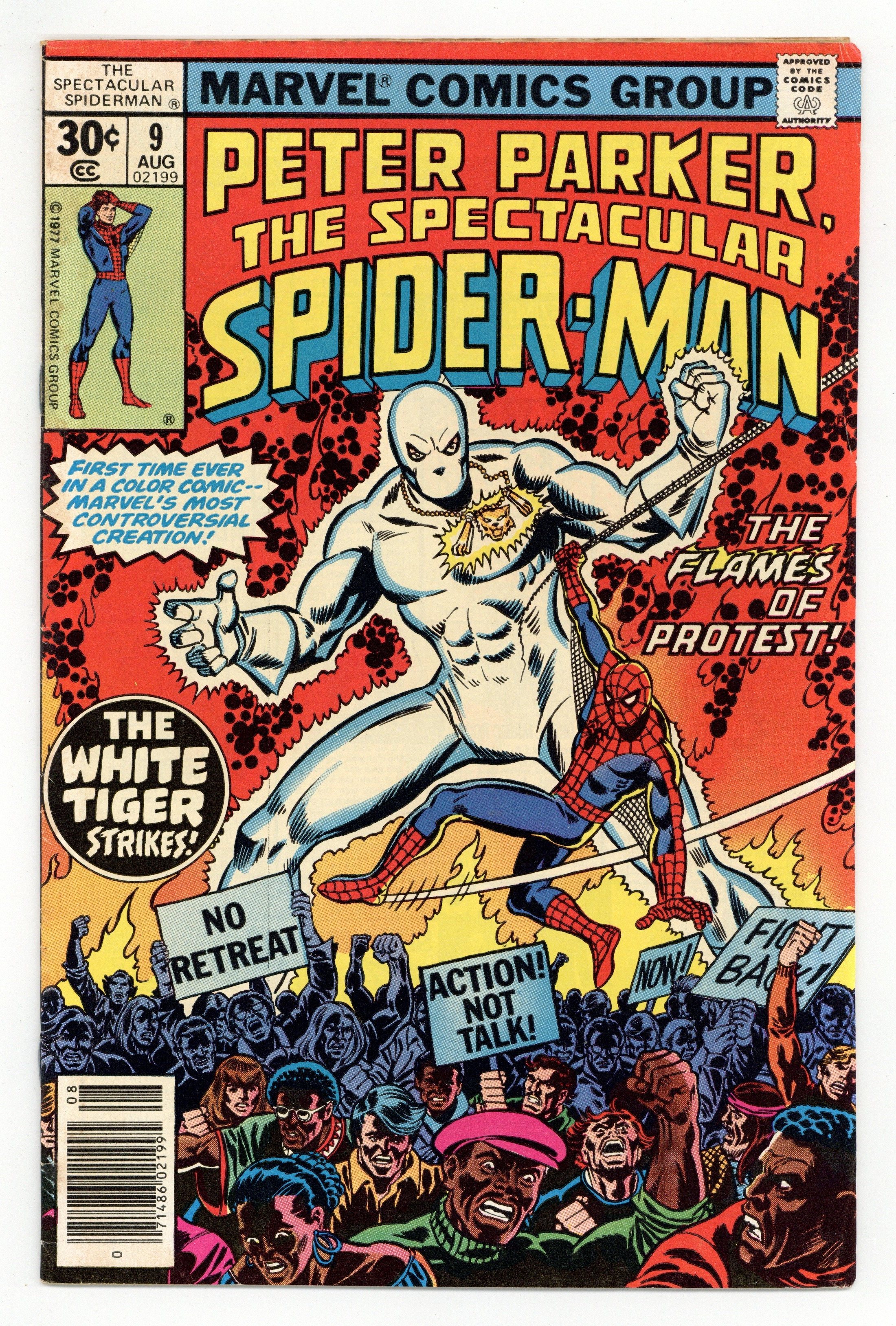 Tags: Marvel Legacy Numbering: Spectacular Spider-Man (part 9), Spider-Man$35.00"Like a Tiger in the Night!" Part 1 of 2. First color comic appearance of the White Tiger. Script by Bill Mantlo. Art by Sal Buscema (breakdowns) and Mike Esposito (finishes). Cover by George Perez and Frank Giacoia. The Empire State University president is closing down the campus' night school, and the student body is very upset! The students want ESU to sell the prized Erskine Manuscripts to raise money. When the White Tiger apparently steals the manuscripts, tempers on campus reach a boiling point...and also set the White Tiger and the web-slinger on a collision course! Flashback cameos by Iron Fist, Jack of Hearts, Shang-Chi, the Prowler, and the Sons of the Tiger to recap the White Tiger's past adventures. (Notes: The White Tiger previously appeared in many issues of the black-and-white Deadly Hands of Kung Fu series. A 35-cent cover price variant exists for this issue.) 32 pages Cover price $0.30.