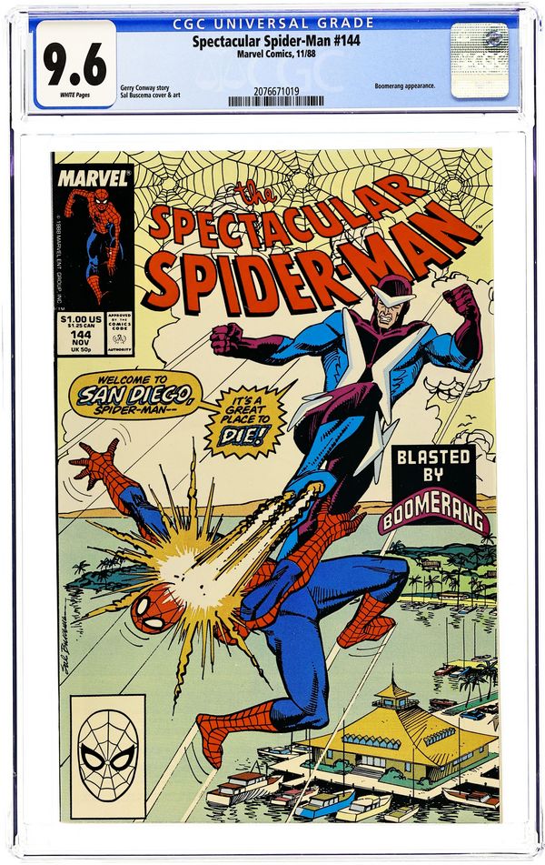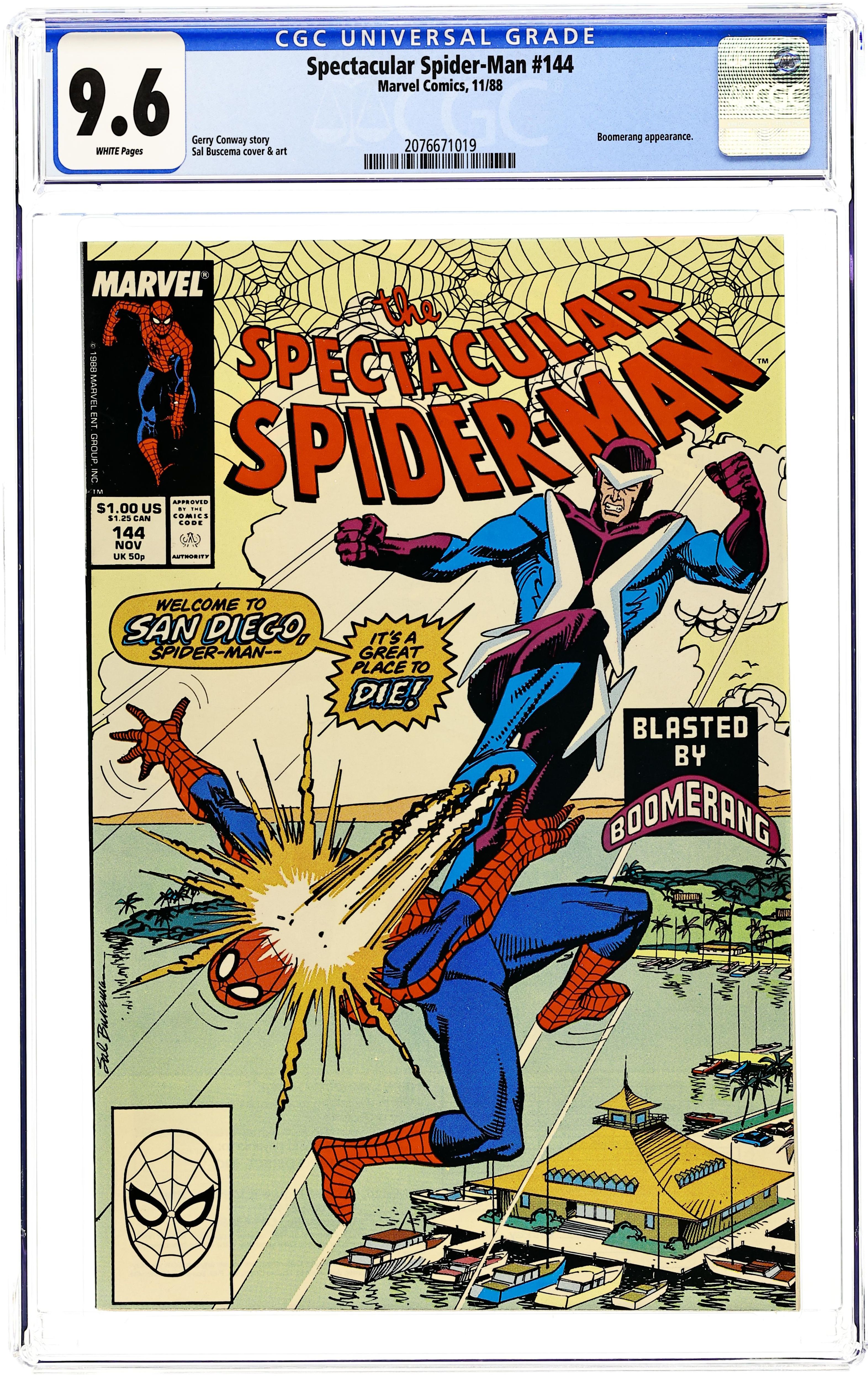 "An Ill Wind" Part 1 of 2. Script by Gerry Conway. Pencils and Inks by Sal Buscema. Cover by Sal Buscema. Peter Parker's book signing tour for "Webs" continues in sunny San Diego. While web-slinging through the city, Spider-Man hears an explosion over at the Mission Bay Marina Club. Spidey goes to investigate and encounters Boomerang! Meanwhile at the Daily Bugle, Joe Robertson returns to work and is promptly arrested by federal authorities for keeping silent about Tombstone's past crimes. Cameo appearance by "Slaves of New York" author Tama Janowitz. 32 pages Cover price $1.00.