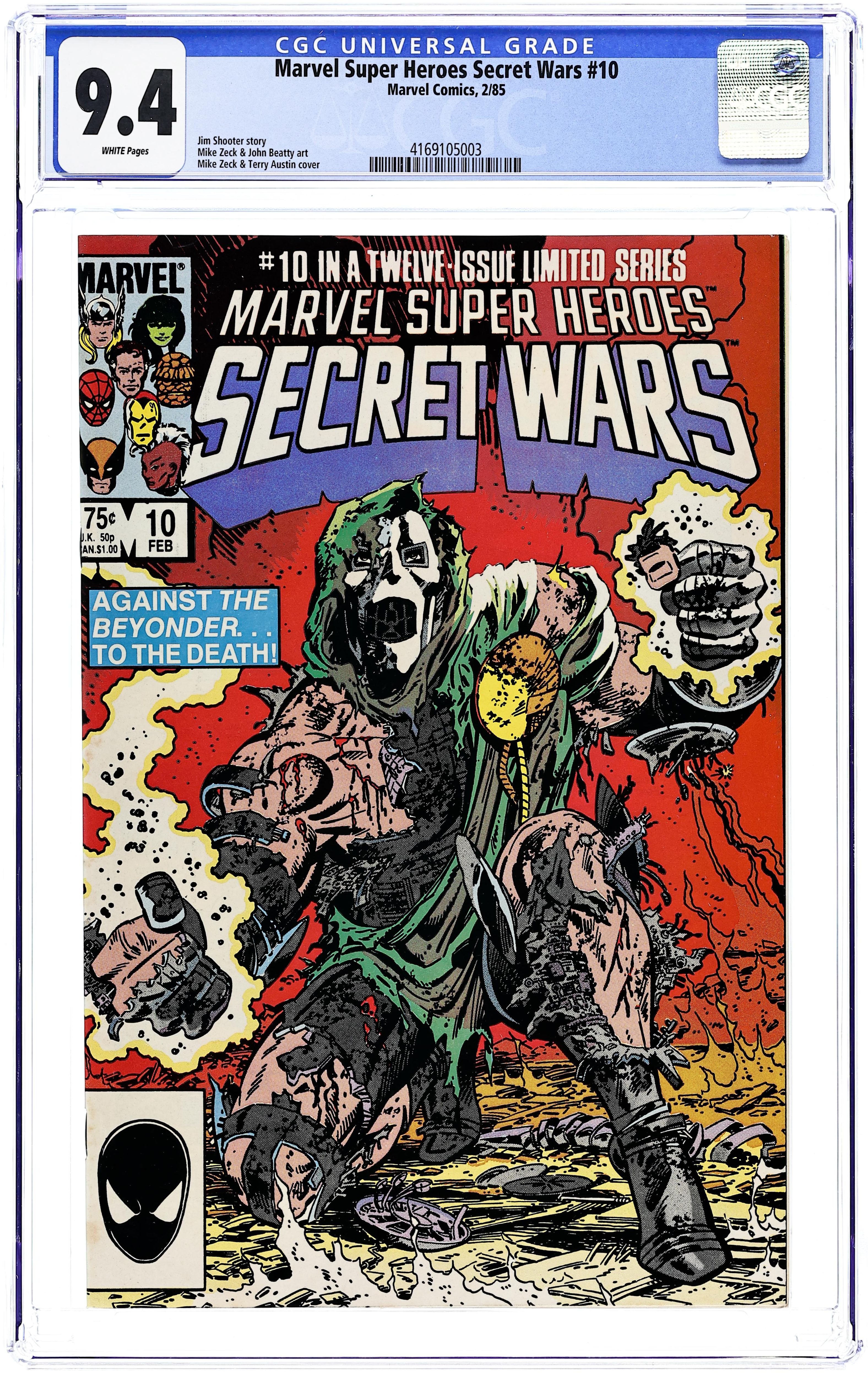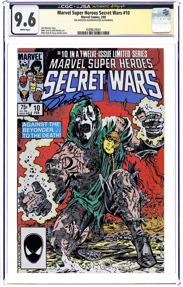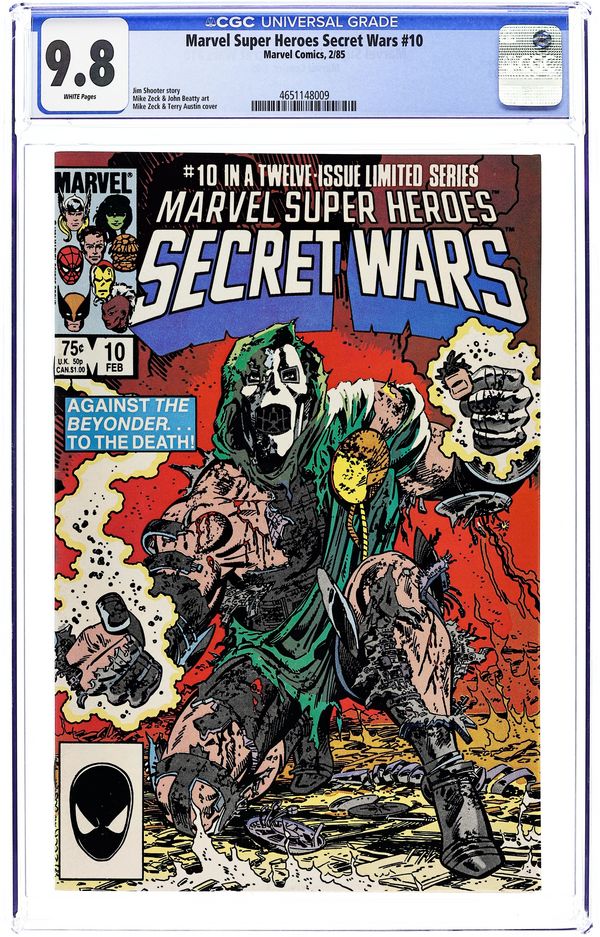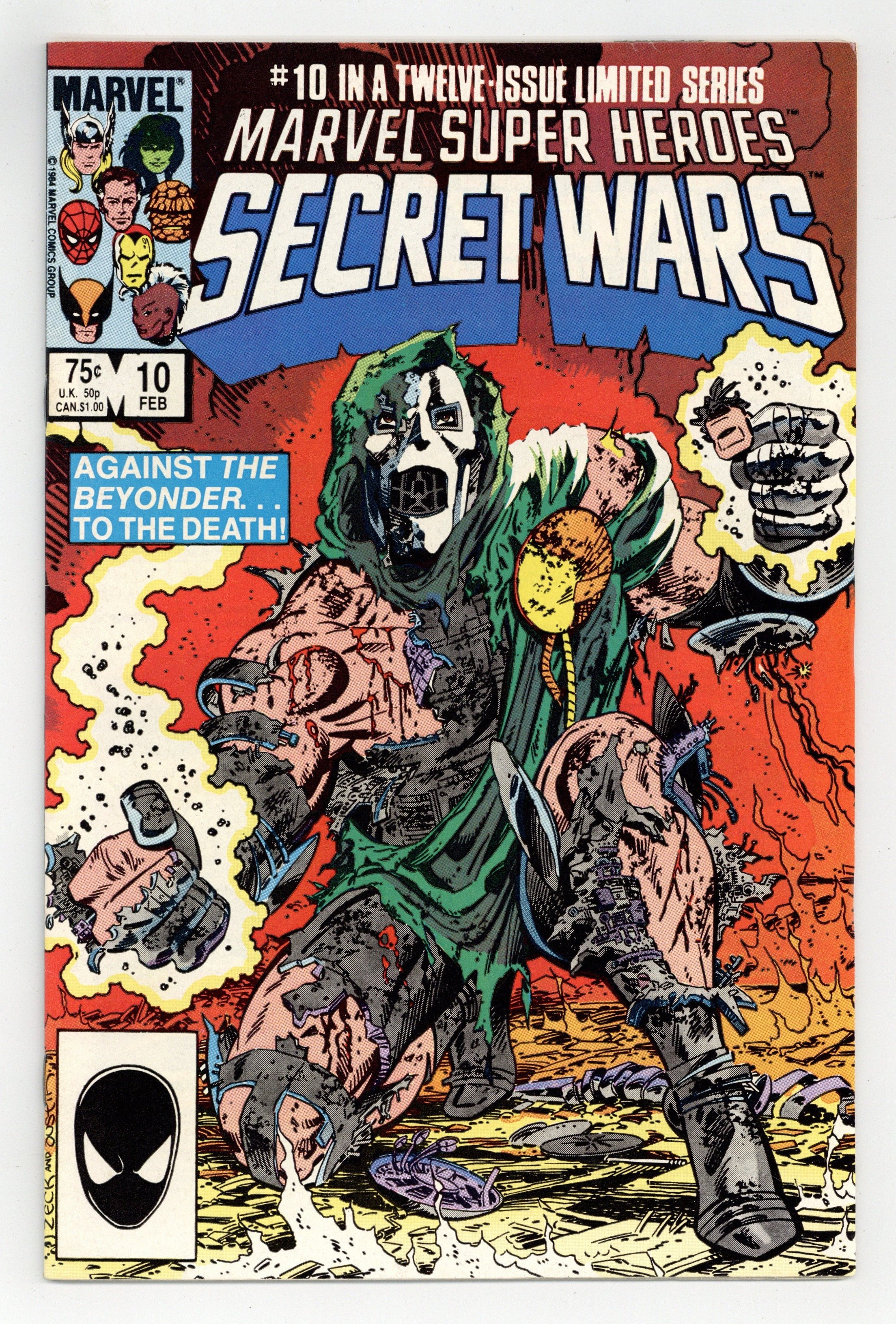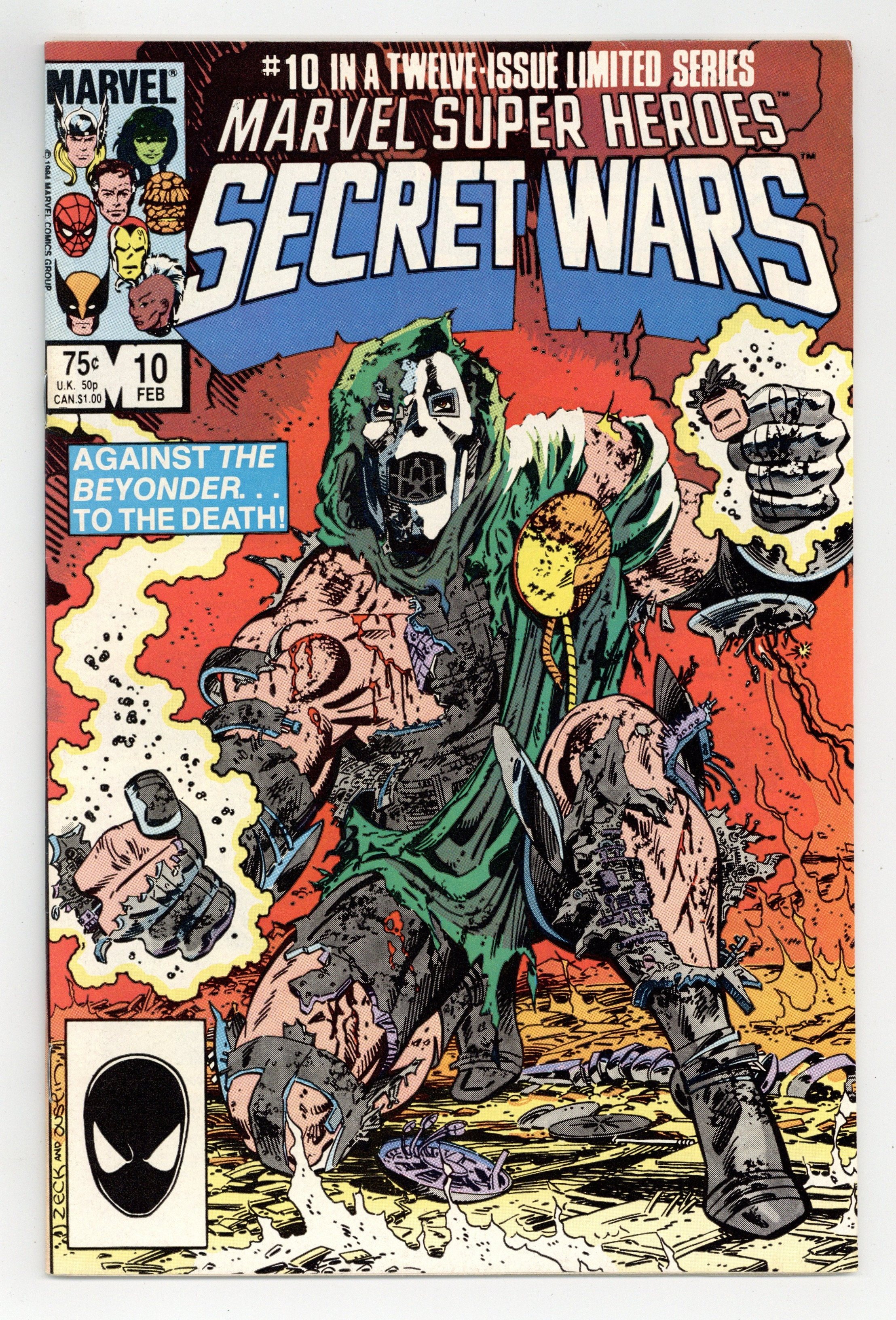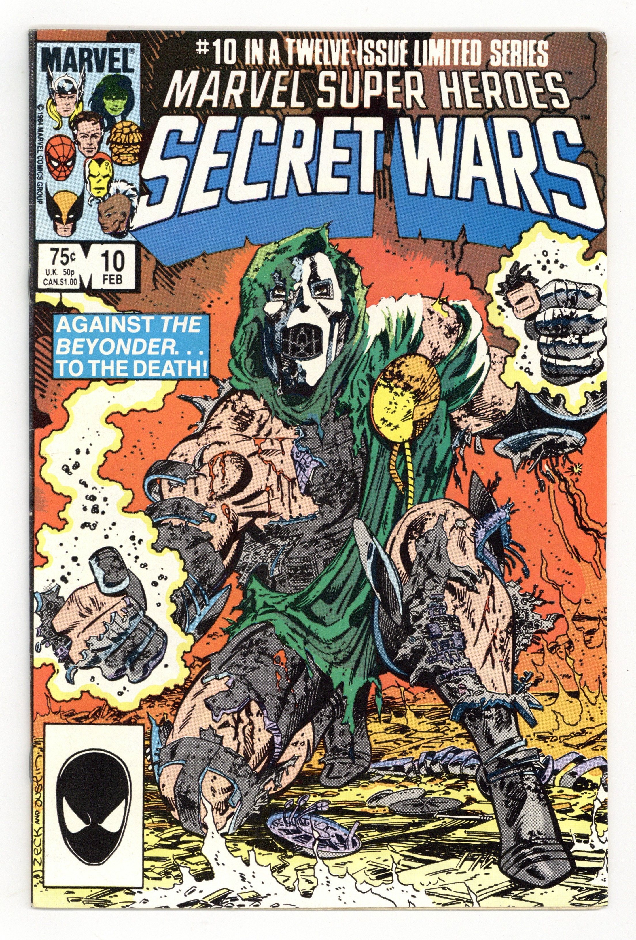 Tags: Secret Wars (1984) (part 10)$33.00Direct Edition. "Death to the Beyonder!" Part 10 of 12. Story by Jim Shooter. Art by Mike Zeck and John Beatty. It's Doctor Doom vs. the Beyonder. The nefarious villain has stolen vast amounts of cosmic energy from mighty Galactus and now stands in defiance before the nigh omnipotent Beyonder. What follows is a battle that will rock the cosmos, and only one shall survive. 36 pages, full color. Cover price $0.75.