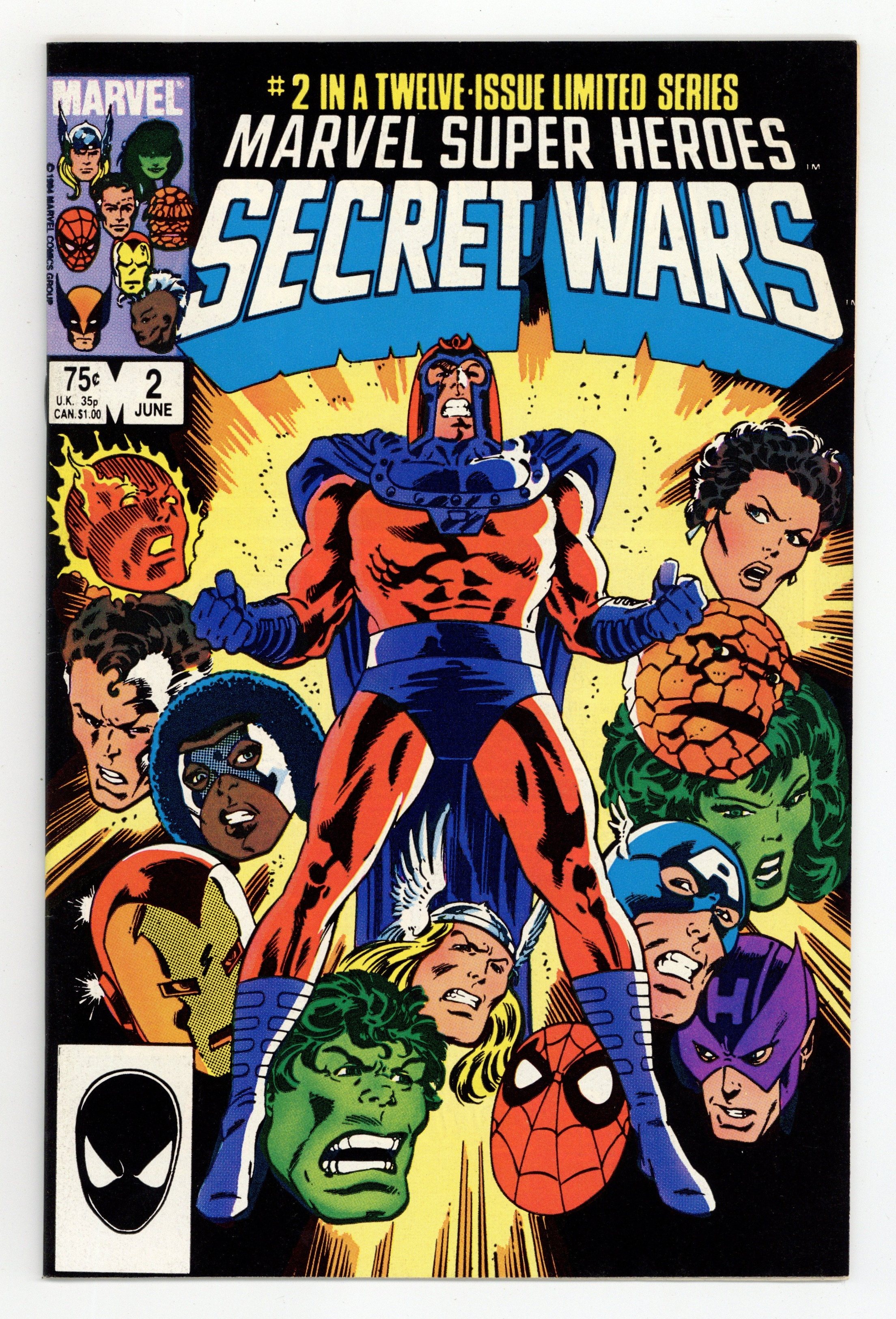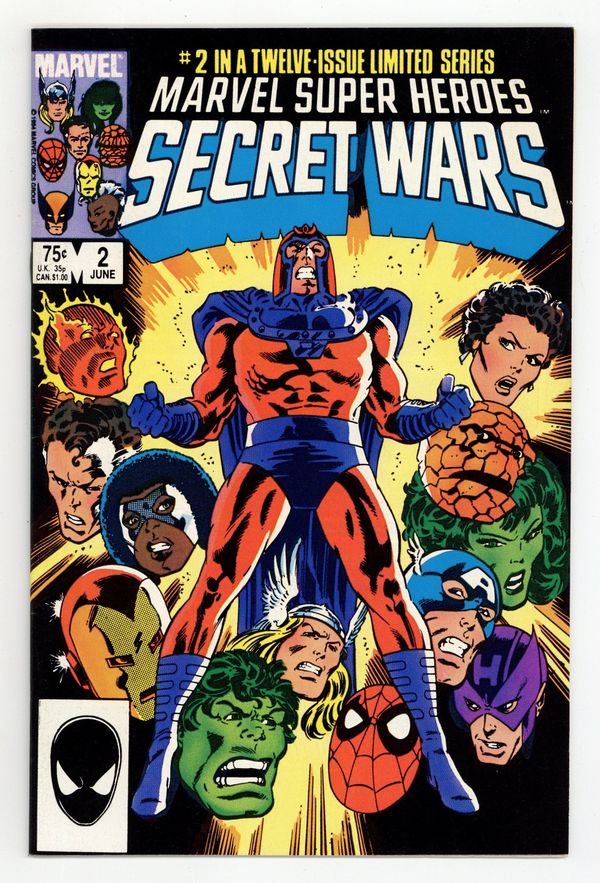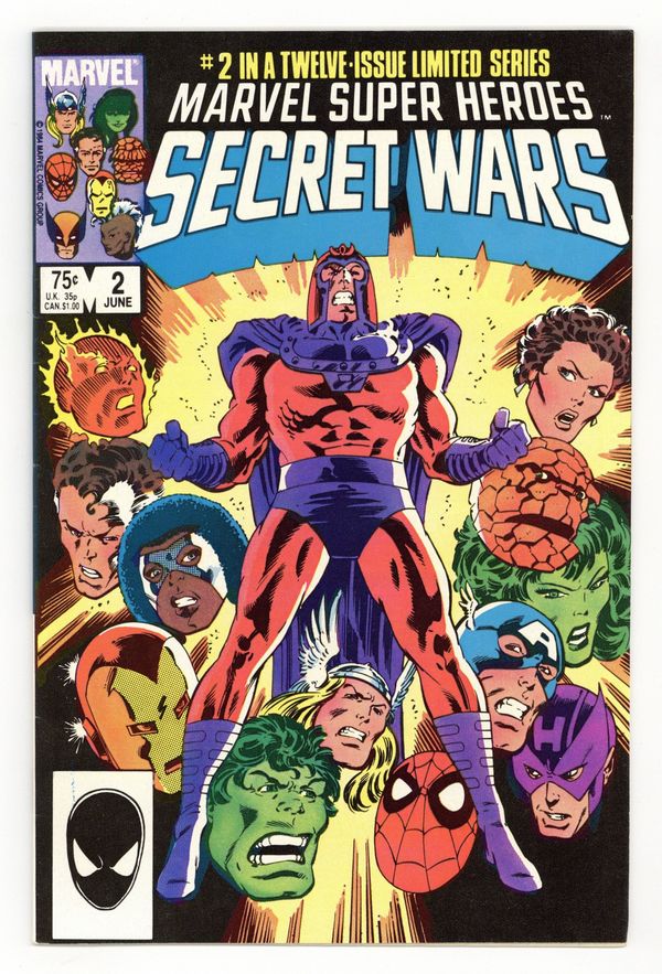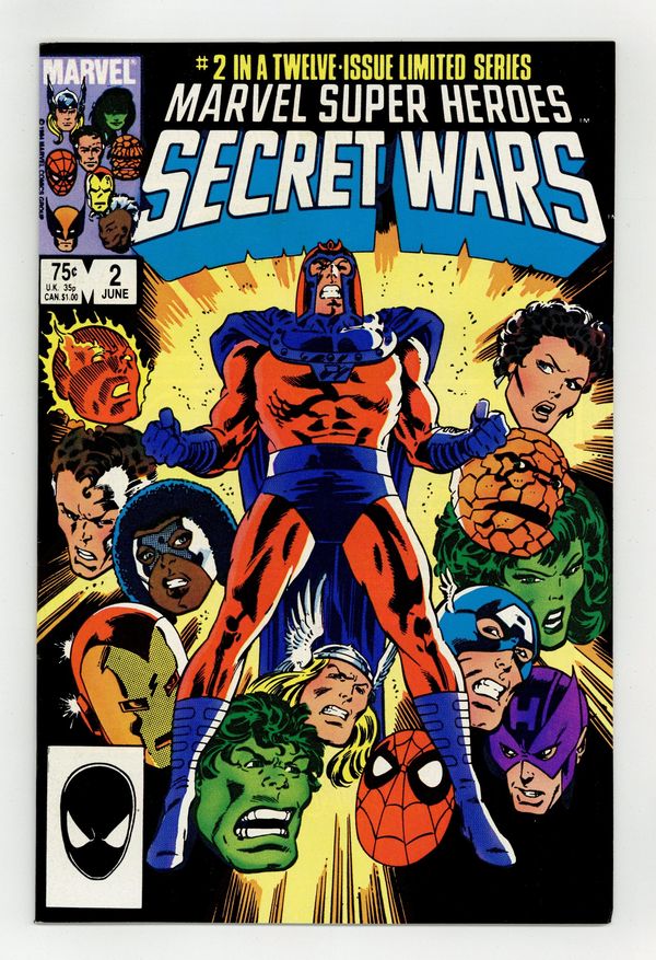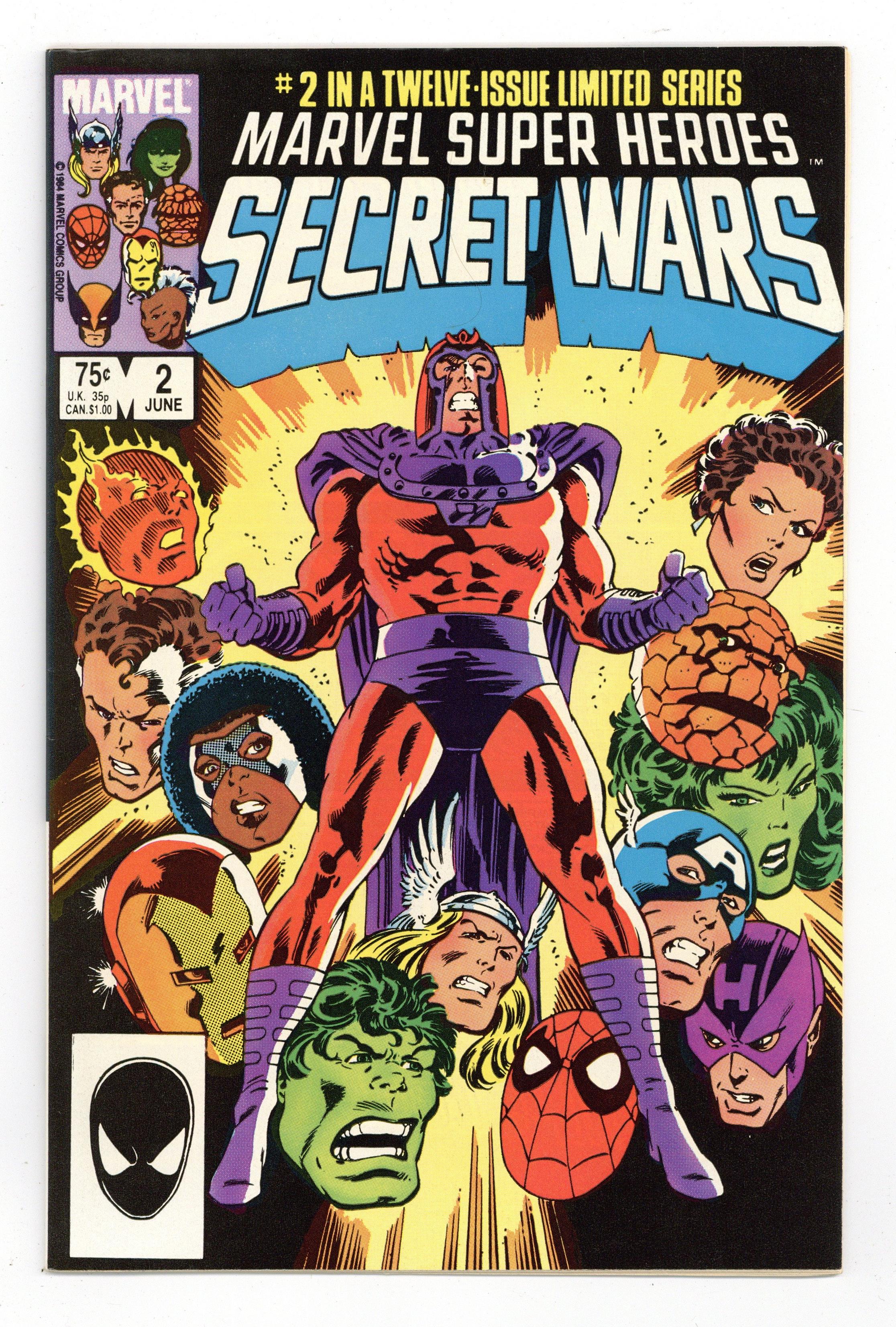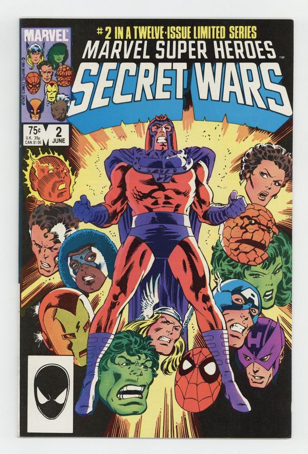Tags: Secret Wars (1984) (part 2)$20.00First Printing. Direct Edition. "Prisoners of War!" Part 2 of 12. Story by Jim Shooter. Art by Mike Zeck and John Beatty. On the far side of the universe on a planet simply known as Battleworld, the Avengers (Captain America, Thor, Wasp, Iron Man (James Rhodes), She Hulk, and Captain Marvel), the Fantastic Four (minus the Invisible Woman), X-Men (Professor X, Wolverine, Cyclops, Storm, Nightcrawler, Rogue, and Colossus), Magneto, Spider-Man, and the Incredible Hulk are locked in mortal combat with Doctor Doom, Ultron, Absorbing Man, the Lizard, Molecule Man, Doctor Octopus, Kang the Conqueror, the Wrecking Crew, and the Enchantress. The villains strike first in an unrelenting blitzkrieg. Will the heroes even survive the first titanic battle of this epic struggle? Plus, how do wildcards Magneto and the space god Galactus fit into this game? 36 pages, full color. Cover price $0.75.