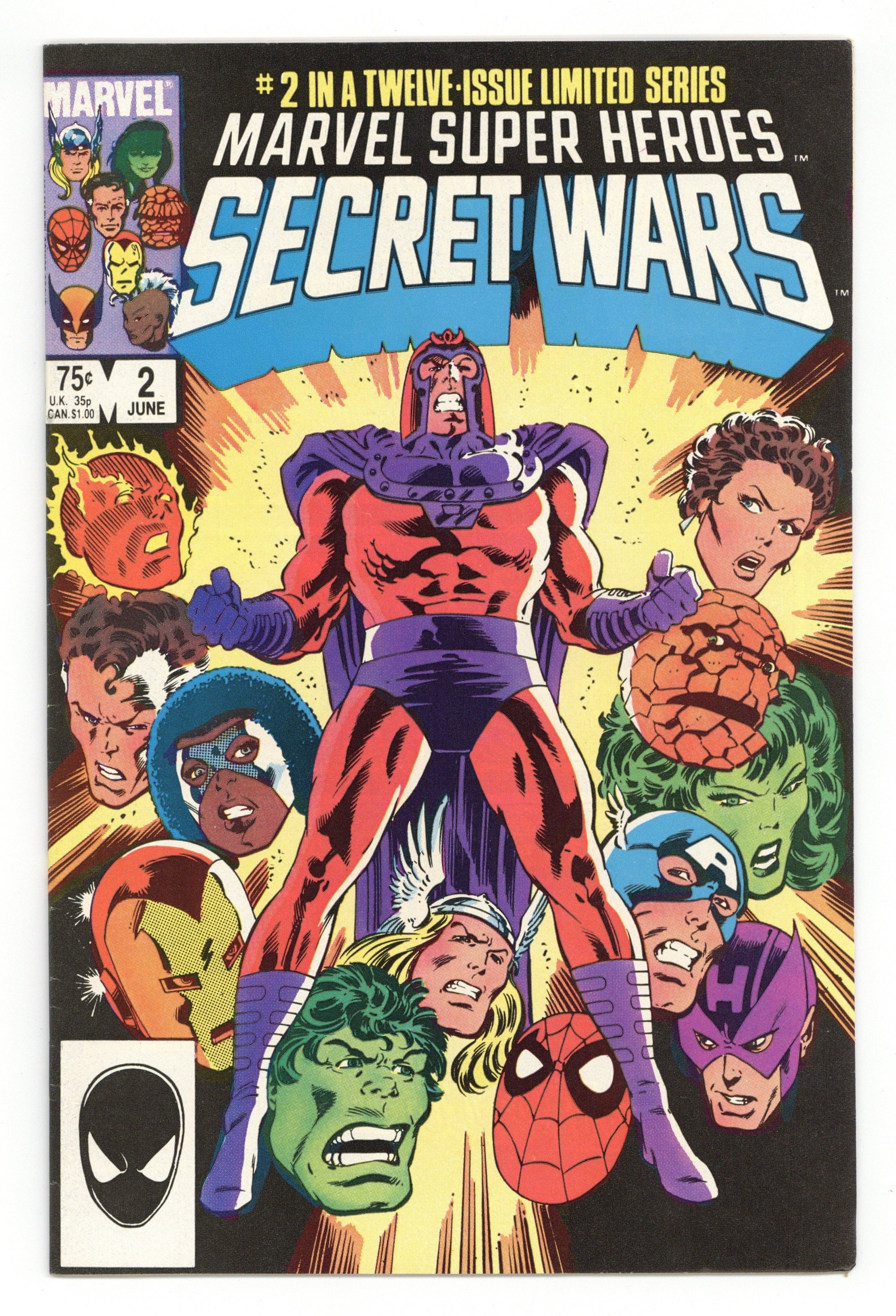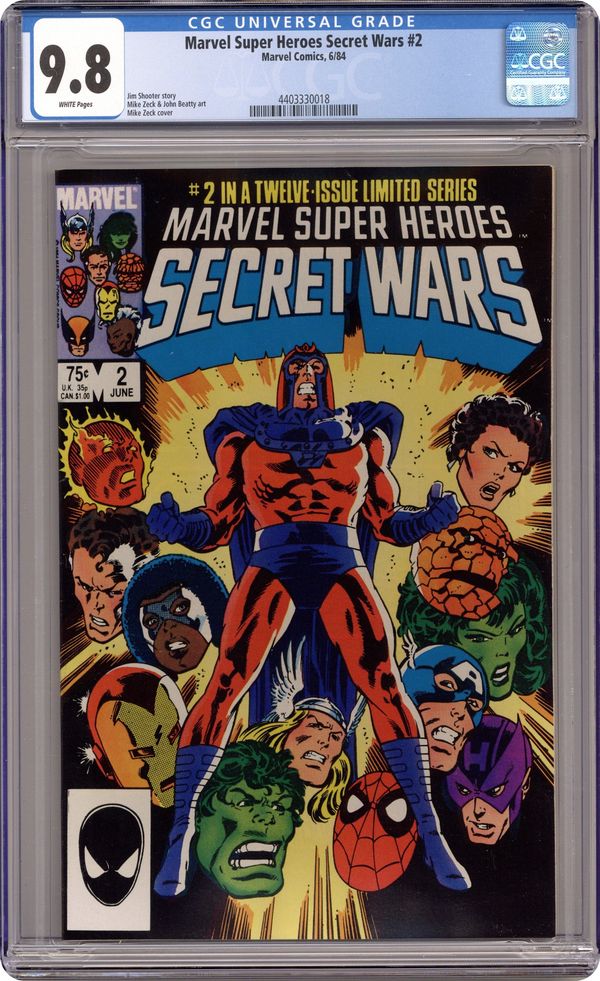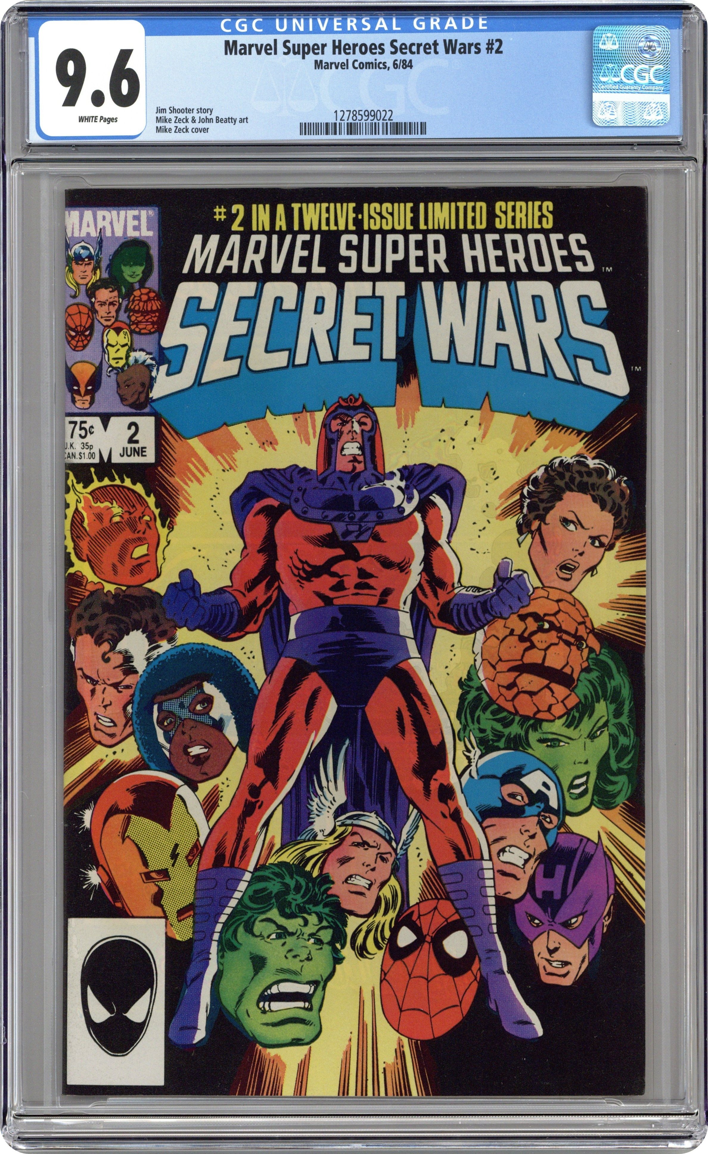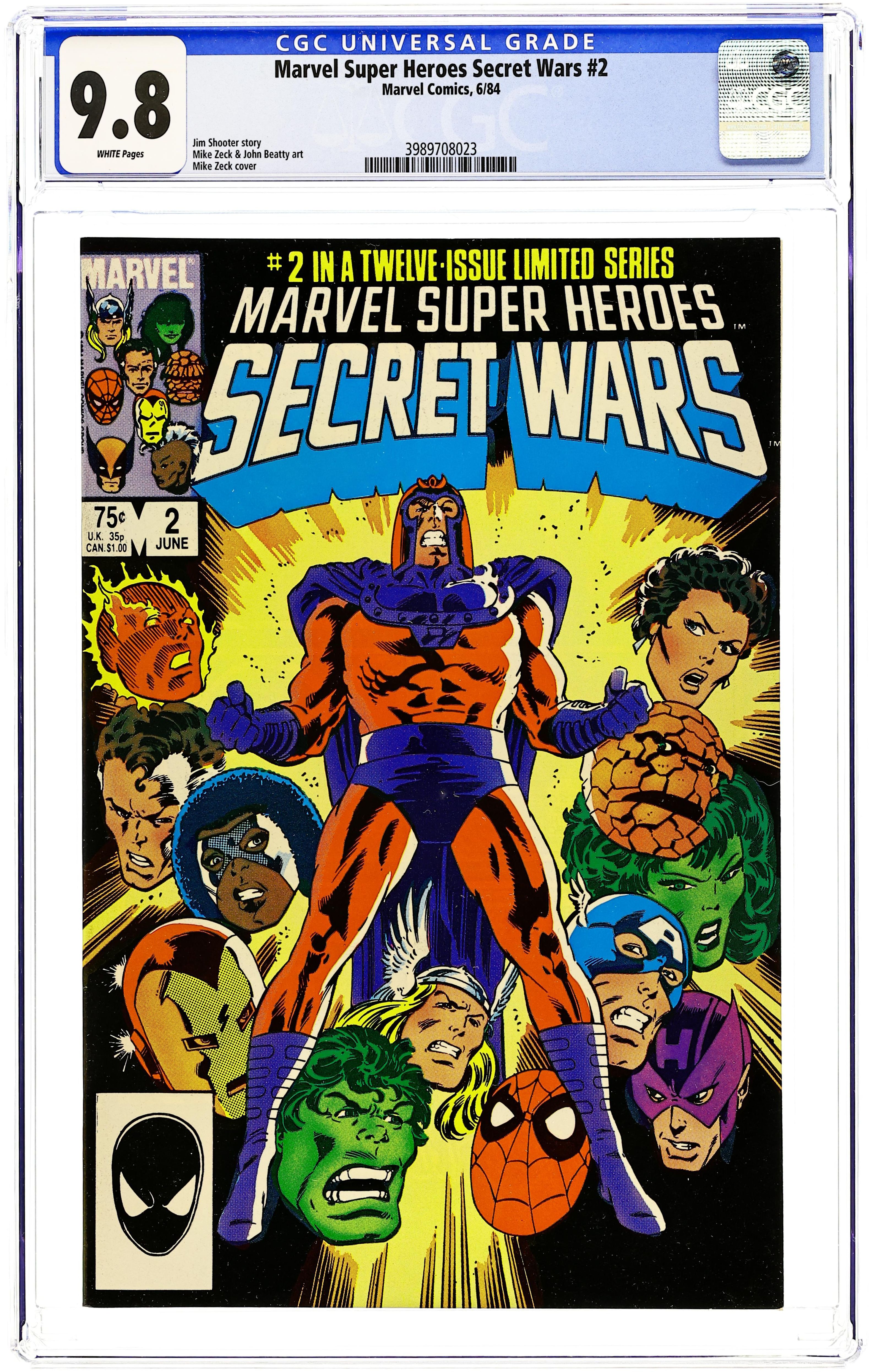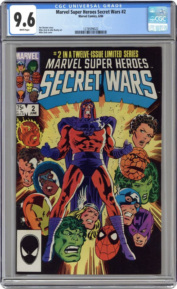 Tags: Secret Wars (1984) (part 2)$20.00First Printing. Direct Edition. "Prisoners of War!" Part 2 of 12. Story by Jim Shooter. Art by Mike Zeck and John Beatty. On the far side of the universe on a planet simply known as Battleworld, the Avengers (Captain America, Thor, Wasp, Iron Man (James Rhodes), She Hulk, and Captain Marvel), the Fantastic Four (minus the Invisible Woman), X-Men (Professor X, Wolverine, Cyclops, Storm, Nightcrawler, Rogue, and Colossus), Magneto, Spider-Man, and the Incredible Hulk are locked in mortal combat with Doctor Doom, Ultron, Absorbing Man, the Lizard, Molecule Man, Doctor Octopus, Kang the Conqueror, the Wrecking Crew, and the Enchantress. The villains strike first in an unrelenting blitzkrieg. Will the heroes even survive the first titanic battle of this epic struggle? Plus, how do wildcards Magneto and the space god Galactus fit into this game? 36 pages, full color. Cover price $0.75.