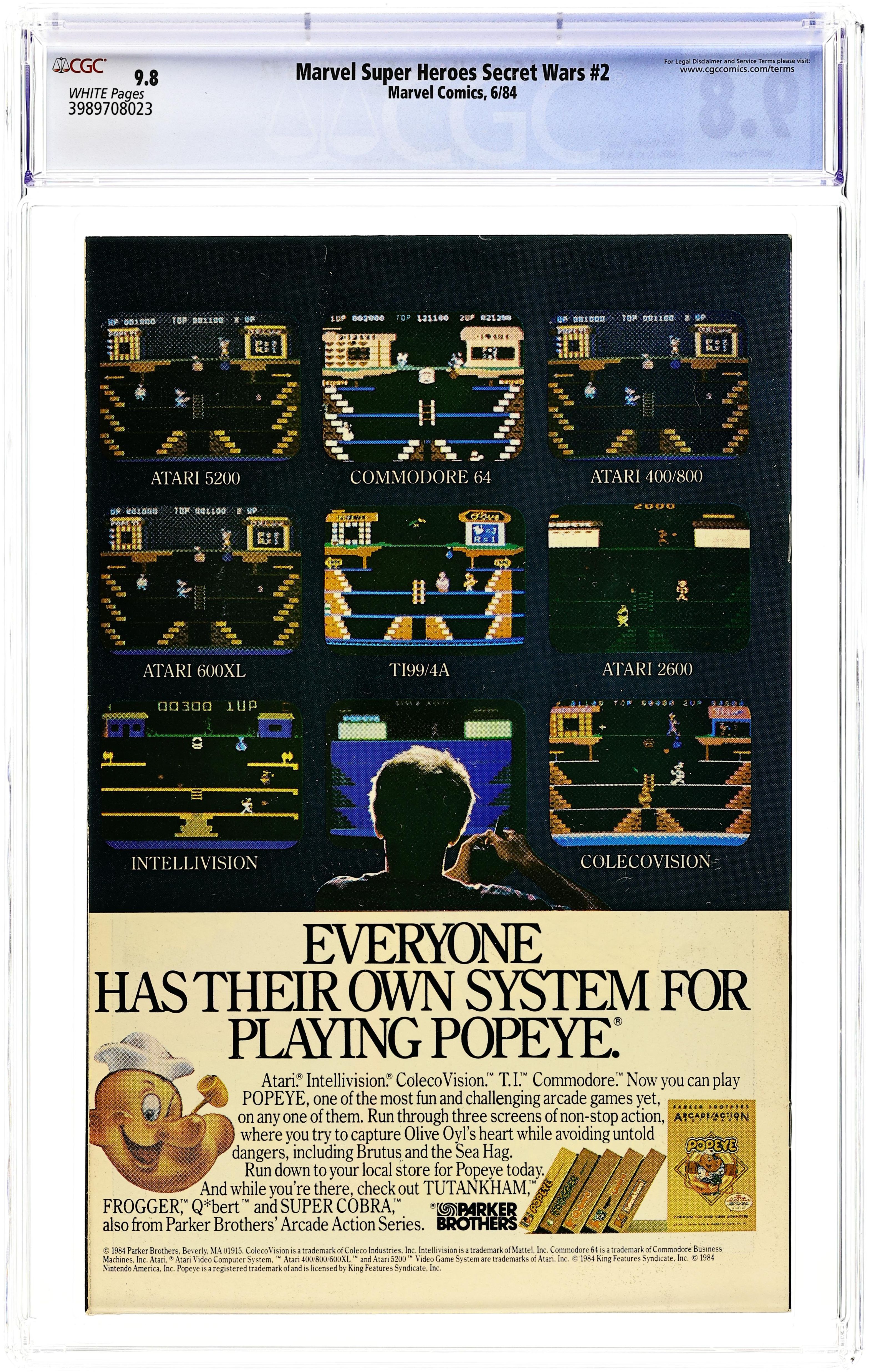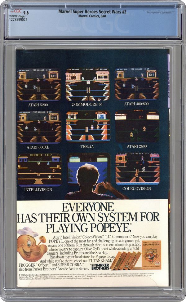 Tags: Secret Wars (1984) (part 2)$22.00First Printing. Direct Edition. "Prisoners of War!" Part 2 of 12. Story by Jim Shooter. Art by Mike Zeck and John Beatty. On the far side of the universe on a planet simply known as Battleworld, the Avengers (Captain America, Thor, Wasp, Iron Man (James Rhodes), She Hulk, and Captain Marvel), the Fantastic Four (minus the Invisible Woman), X-Men (Professor X, Wolverine, Cyclops, Storm, Nightcrawler, Rogue, and Colossus), Magneto, Spider-Man, and the Incredible Hulk are locked in mortal combat with Doctor Doom, Ultron, Absorbing Man, the Lizard, Molecule Man, Doctor Octopus, Kang the Conqueror, the Wrecking Crew, and the Enchantress. The villains strike first in an unrelenting blitzkrieg. Will the heroes even survive the first titanic battle of this epic struggle? Plus, how do wildcards Magneto and the space god Galactus fit into this game? 36 pages, full color. Cover price $0.75.