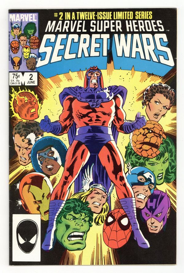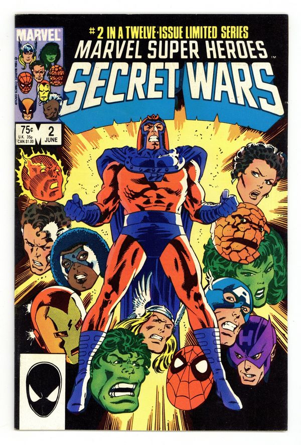 Tags: Secret Wars (1984) (part 2)$12.00First Printing. Direct Edition. "Prisoners of War!" Part 2 of 12. Story by Jim Shooter. Art by Mike Zeck and John Beatty. On the far side of the universe on a planet simply known as Battleworld, the Avengers (Captain America, Thor, Wasp, Iron Man (James Rhodes), She Hulk, and Captain Marvel), the Fantastic Four (minus the Invisible Woman), X-Men (Professor X, Wolverine, Cyclops, Storm, Nightcrawler, Rogue, and Colossus), Magneto, Spider-Man, and the Incredible Hulk are locked in mortal combat with Doctor Doom, Ultron, Absorbing Man, the Lizard, Molecule Man, Doctor Octopus, Kang the Conqueror, the Wrecking Crew, and the Enchantress. The villains strike first in an unrelenting blitzkrieg. Will the heroes even survive the first titanic battle of this epic struggle? Plus, how do wildcards Magneto and the space god Galactus fit into this game? 36 pages, full color. Cover price $0.75.