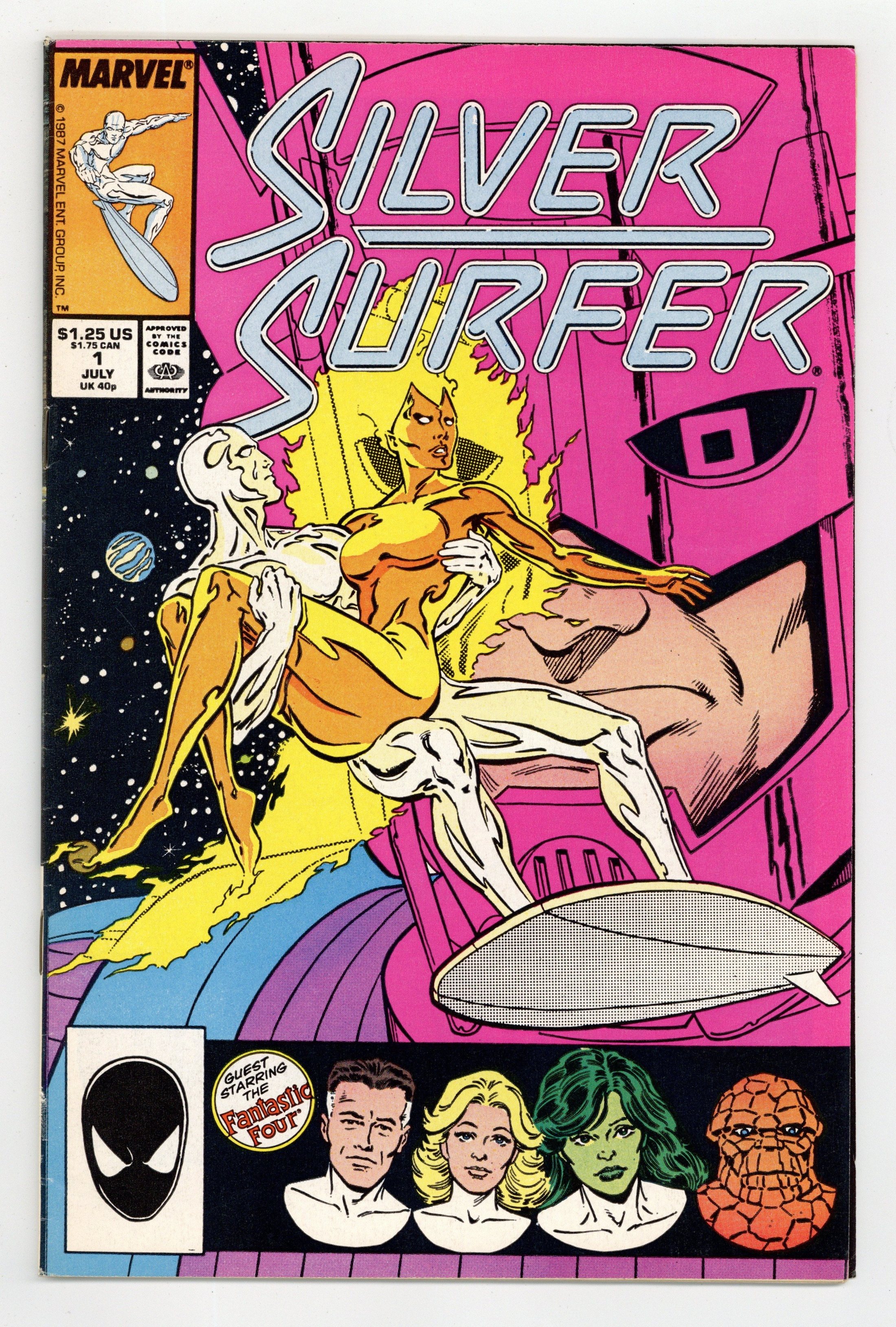 $7.80Direct Edition. "Free!" Guest-starring the Fantastic Four and Galactus. Story by Steve Englehart. Art by Marshall Rogers and Joe Rubinstein. Many years ago, in order to prevent the total annihilation of his civilization and homeworld, Norrin Radd bargained with the Devourer of Worlds. Imbued with the Power Cosmic, he became the Silver Surfer and Herald of Galactus. However, on the fateful day he arrived on Earth, for love of humanity, he betrayed his master, and thus was cursed to never traverse the spaceways again. Now, after many years of exile, will the Silver Surfer finally be free to soar the heavens again? Plus, witness the savage attack of Champion, an Elder of the Universe (last seen in Marvel Two in One (1974) Annual #7), as events are set in motion for the next 10 issues. 48 pages. Cover price $1.25.