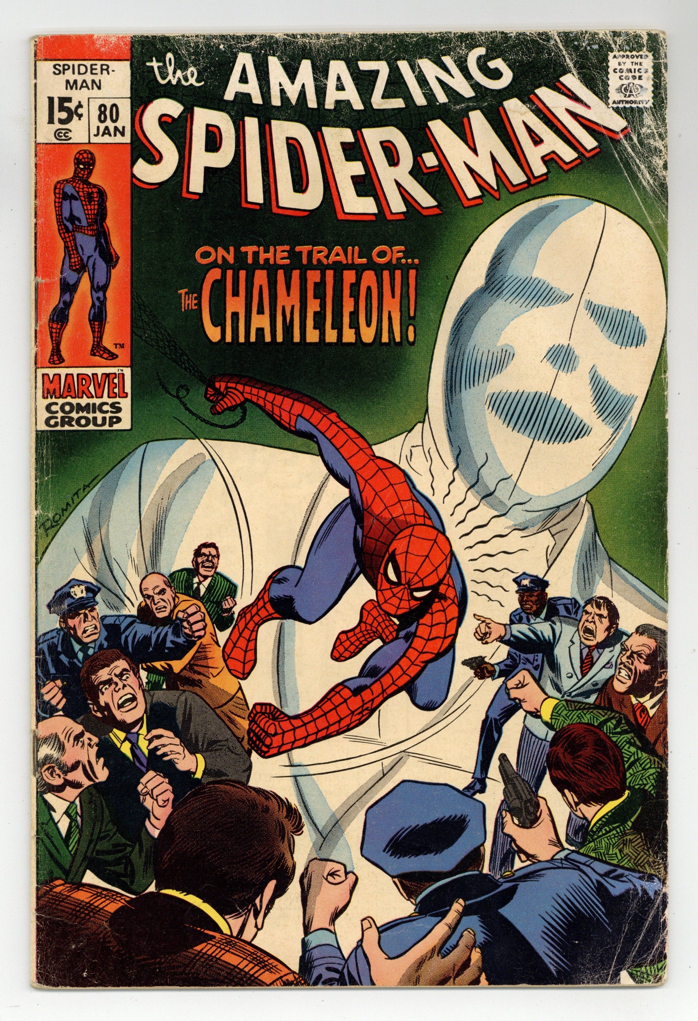 Tags: Marvel Legacy Numbering: Amazing Spider-Man (part 80), Spider-Man$90.00"On the Trail of the Chameleon!" Script by Stan Lee. Art by John Buscema (layouts) and Jim Mooney (finishes). Cover by John Romita. Peter Parker and Gwen Stacy meet for a date at the Midtown Museum to see its new exhibit of priceless paintings. And also at the museum is Gwen's father...who is in charge of security for the evening. So when the paintings are shockingly stolen, Captain Stacy gets blamed for the theft! Peter knows the trusted police captain would never do that. So who did? Ultimately, the web-slinger remembers the name of the Chameleon...and sets a trap for the master of disguise! However the Chameleon is crafty, and he eludes Spider-Man's trap -- until the faceless villain makes a very big mistake! Cameo appearances by Flash Thompson, Harry Osborn, J. Jonah Jameson, and Joe Robertson. (Notes: The wall-crawler previously encountered the Chameleon in Amazing Spider-Man (1st series) #15. This story was reprinted in Marvel Tales #61.) 36 pages. Cover price $0.15.