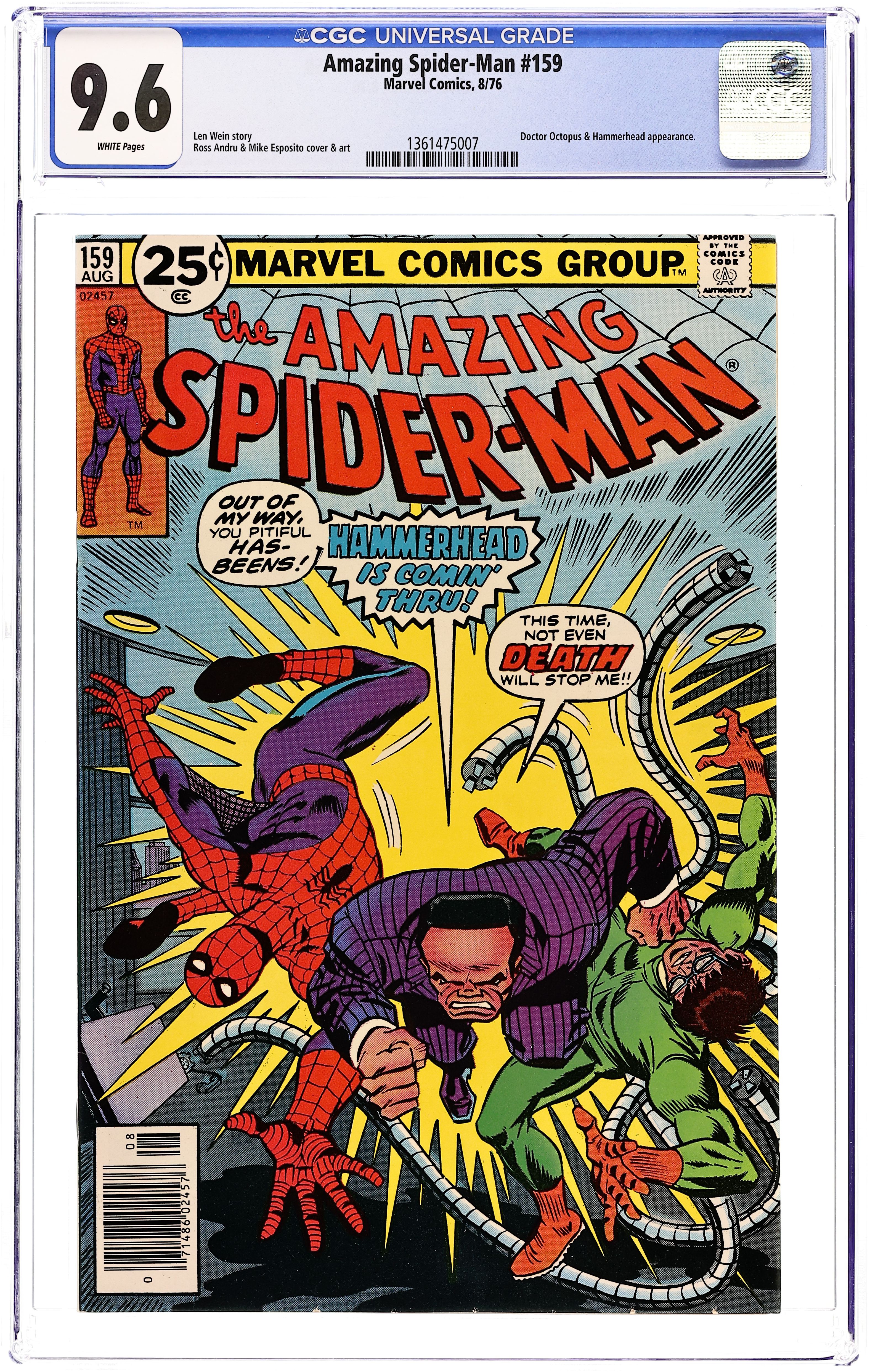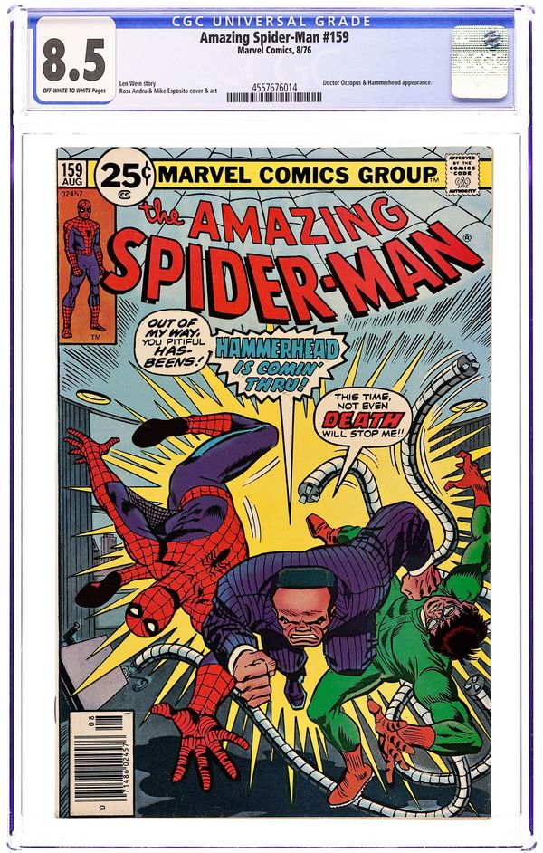 "Arm-in-Arm-in-Arm-in-Arm-in-Arm-in-Arm with Doctor Octopus!" Part 3 of 3. Script by Len Wein. Art by Ross Andru (breakdowns) and Mike Esposito (finishes). Cover by Ross Andru and Frank Giacoia (with assists from John Romita). With his dear aunt's life in jeopardy, the wondrous wall-crawler remembers that the enemy of my enemy is my friend! And in a remarkable twist of fate, the Spectacular Spider-Man and Dr. Otto Octavius team up to take down Hammerhead! The unlikely duo traps Hammerhead inside one of his old nightclubs! And then the final fireworks begin! Spidey and Doc Ock battle Hammerhead to the fateful finish! Cameo appearances by the Tinkerer, Toy, Kingpin, Joe Robertson, J. Jonah Jameson, and the Spider-Mobile. Last 25¢ issue. (Notes: Doc Ock clashes with the web-slinger again in Amazing Spider-Man Annual 13. Hammerhead returns in Fantastic Four 233. This story was reprinted in Marvel Tales 136. A 30-cent cover price variant exists for this issue.) 36 pgs. Cover price $0.25.